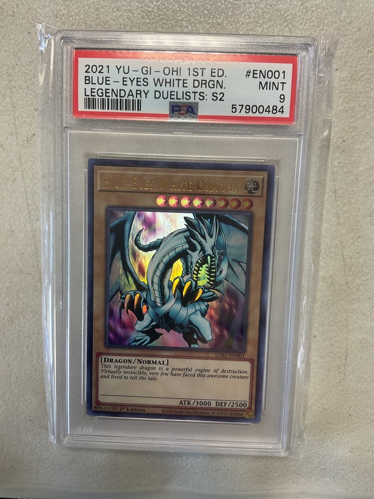 Blue-Eyes White Dragon LDS2-EN001 - Ultra Rare PSA 9 Graded Grading Scale -NM-Mint, this card is typically pack fresh and has no visible scratches or wear. -Light Play, this card might have minor wear around the edges but no major scratches or wear. -Moderate Play, this card might have moderate amount of wear around the edges and might have small scratches. -Heavy Play, this card might have heavy wear around the edges and could have major scratches or slight bends. -Damaged, this card will possibly be written on, water damaged, torn, bent, scratched, or have a heavy amount of wear. Important Information -PLEASE REQUEST AN INVOICE BEFORE PAYING IF THE SHIPPING COST IS INCORRECT ON YOUR INVOICE. -The winner of this auction will receive the item(s) listed in the title of this auction. -The condition is listed below the image in the description, or in the title of this auction. -The picture(s) included in our auctions are often stock photos. -We reserve the right to limit orders to only 4 copies of a single card for any reason. If you want to buy more than 4 copies please email us before making your order. Failure to do so may result in a cancelation of your order. -We expect payment within 4 days of the end of the auction. There are no exceptions to this policy. -Combined shipping is only offered on items won within 4 days of each other, paid for on the same invoice. -Shipping and Handling rates are not negotiable. Please make sure you understand the costs before bidding. Shipping information Domestic Shipping -All orders under $50 are shipped in a toploader and envelope for FREE! -All orders over $50 are shipped via tracking in a bubble mailer for FREE! International Shipping -All orders under $100 are shipped in a toploader and envelope for $3.00, each additional item is $.25. -All orders over $100 are shipped via bubble mailer and will require registered mail at the cost of $20, each addition item is $.50 ______________________________________________________________________________________ Please contact us before leaving neutral or negative feedback and give us a chance to fix whatever issue or problem you have with your order. Thank you from the Wasteland!