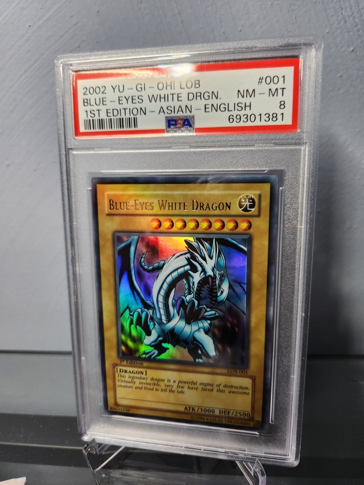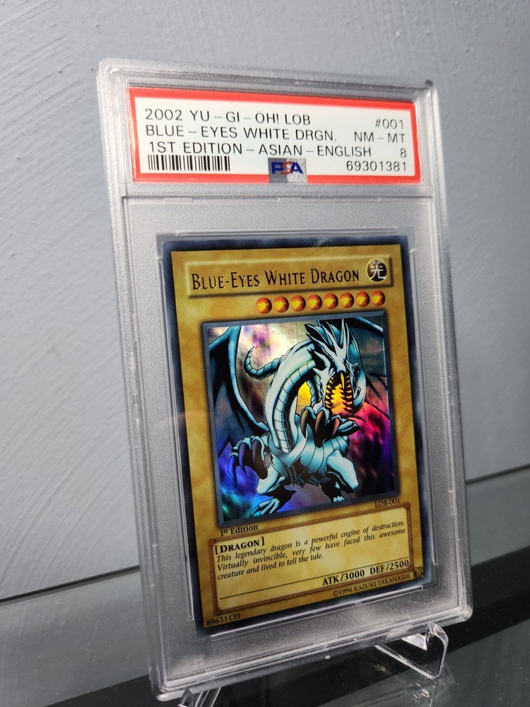 The product is a Blue-Eyes White Dragon card from the Yu-Gi-Oh! TCG set Legend of Blue Eyes White Dragon, manufactured by Konami in 2002. This 1st Edition Ultra Rare card features the iconic Blue-Eyes White Dragon character in English language with a Holo finish. The card is classified as a collectible item for fans of the game, suitable for ages 4 and up. It is a valuable addition to any Yu-Gi-Oh! card collection, especially for those interested in Asian versions of these cards.