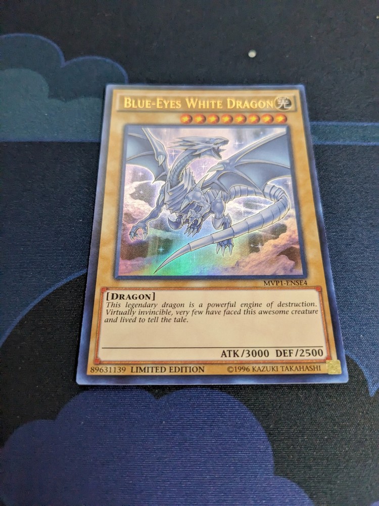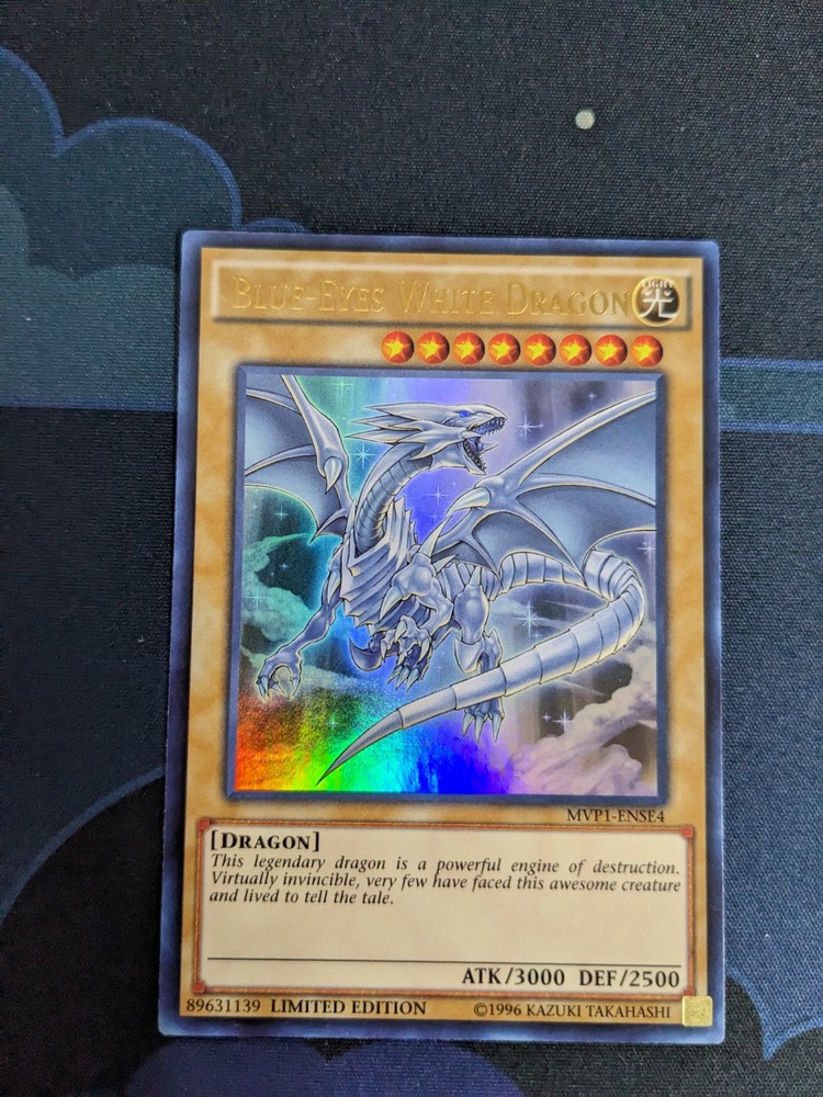 You are bidding on one (1) Blue-Eyes White Dragon MVP1-ENSE4 Yu-Gi-Oh ! Card From The Dark Side of Dimensions Movie Pack for the Yu-Gi-Oh! Trading Card Game This is the ultra rare limited version of the Yugioh card The card is in near mint condition From a smoke and pet free environment Not stock pictures. Photos are of the actual card you will be receiving SEE PICTURES FOR MORE DETAILS AND OVERALL CONDITION OF CARD Shipping All prices are in Canadian dollars (CAD) Card shipped in top loader To Canadian destinations: FREE SHIPPING or Canada Post tracked package- $18 To United States: regular mail- $2.50 or first class USPS package- $10 Everywhere else: regular mail- $4.00 or international tracked package- $25 Please wait for an invoice if purchasing multiple items. Combined shipping at $0.25 for each additional card Thanks for looking!