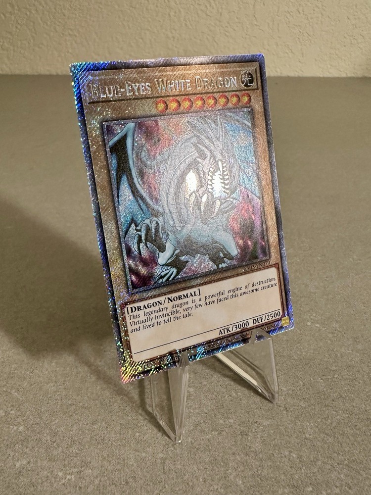 The Blue-Eyes White Dragon (Platinum Secret Rare) card from the Quarter Century Bonanza set is a sought-after collectible in the Yu-Gi-Oh! TCG. This English language card, manufactured by Konami, is a 1st Edition Normal type card with a high Defence/Toughness of 2500 and an even higher Attack/Power of 3000. A powerful Dragon type creature, this card is a valuable addition to any Yu-Gi-Oh! card collection. Card is in near mint condition. Please look at the pictures for condition. If you have any questions you’re welcome to message me. Thank you for looking!