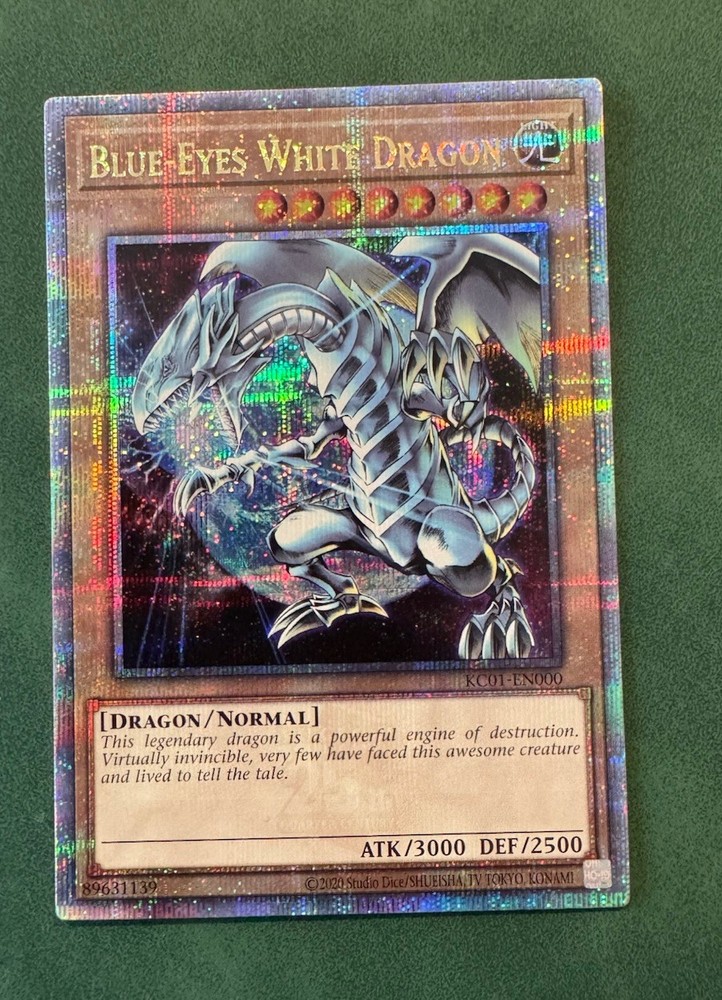 The Blue-Eyes White Dragon (Quarter Century Secret Rare) from the 25th Anniversary Ultimate Kaiba Set is a highly sought-after collectible card in the Yu-Gi-Oh! TCG. This Light attribute Dragon card boasts a high defense of 2500 and attack power of 3000, making it a formidable addition to any deck. Manufactured by Konami, this English language card with the card number KC01-EN000 is a normal type card with unlimited availability. Celebrating a quarter century of being a secret rare, this card is a must-have for any serious collector or player.