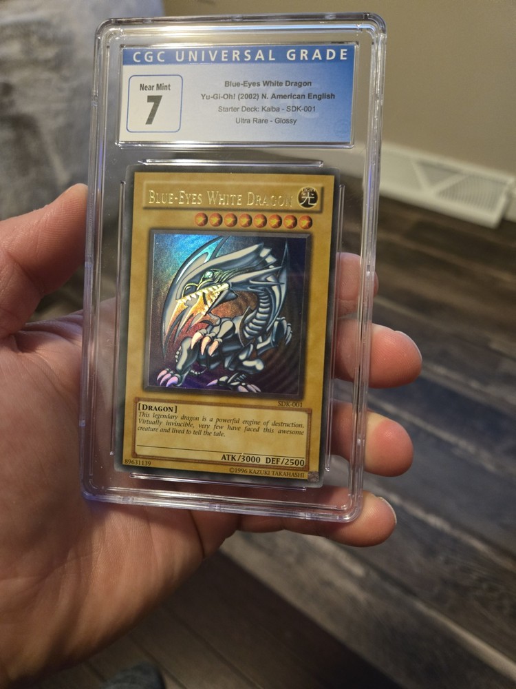 The product is a Blue-Eyes White Dragon SDK-001 card graded 7 Near Mint by Certified Guaranty Company (CGC). This collectible card from the Yu-Gi-Oh! TCG features the iconic white and blue colors attributed to dragons. As a highly sought-after item for collectors and players alike, this card is a valuable addition to any card collection.