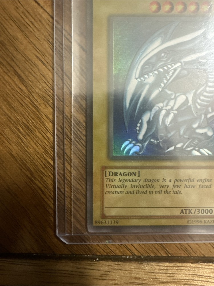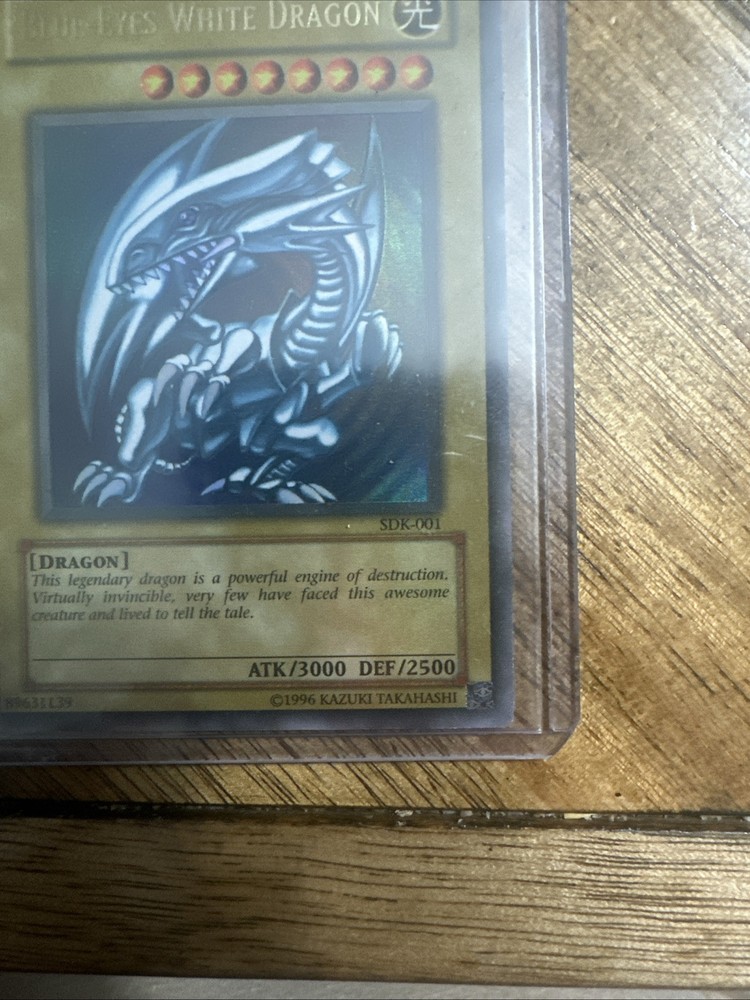 This listing is for the iconic Blue-Eyes White Dragon SDK-001 card from the Starter Deck: Kaiba Unlimited set of the Yu-Gi-Oh! TCG. This ultra rare card is a must-have for collectors and players alike, featuring the powerful dragon creature/monster type with 2500 defense/toughness and 3000 attack/power. The card is in English and manufactured by Konami, and has the card number SDK-001. It is a normal type card with the light attribute and is perfect for those looking to add a strong addition to their deck or collection. Don't miss out on the opportunity to own this legendary card.