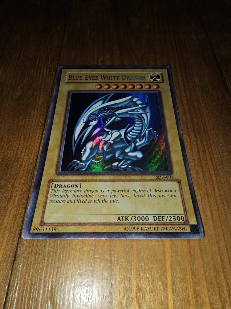 The Blue-Eyes White Dragon SDK-001 Starter Deck: Kaiba-Unlimited Edition Unlimited is a sought-after collectible card game item featuring the iconic Blue-Eyes White Dragon creature. Manufactured by Konami, this ultra rare card has a high attack power of 3000 and a defense of 2500, making it a valuable addition to any Yu-Gi-Oh! TCG collection. The English language card is part of the Starter Deck: Kaiba-Unlimited Edition set, perfect for players looking to enhance their decks with powerful dragon-type cards.