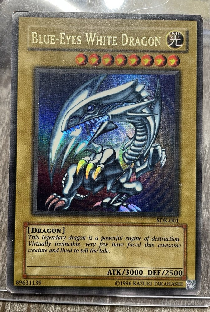 The product is a collectible card game individual card named Blue-Eyes White Dragon SDK-001 Starter Deck. It is an ultra rare card with an attack/power of 3000 and a defense/toughness of 2500. The card is a normal type with a light color attribute and a creature/monster type of dragon. It is from the Starter Deck: Kaiba-Unlimited Edition set and is in English language. The card has a rarity of Ultra Rare and a level of 8. The Additional Description of the card is Blue-Eyes White Dragon. The manufacturer of the card is Konami.