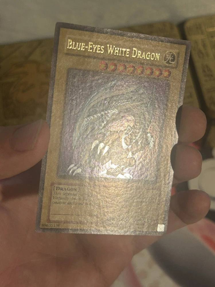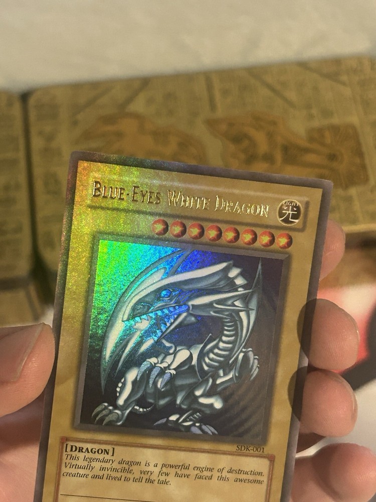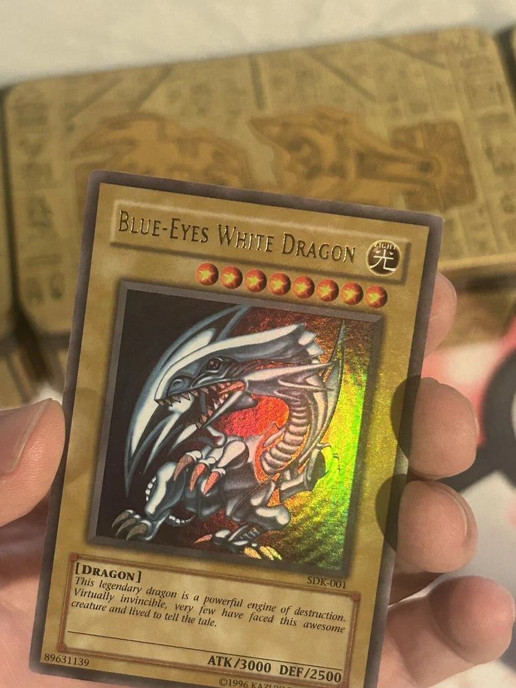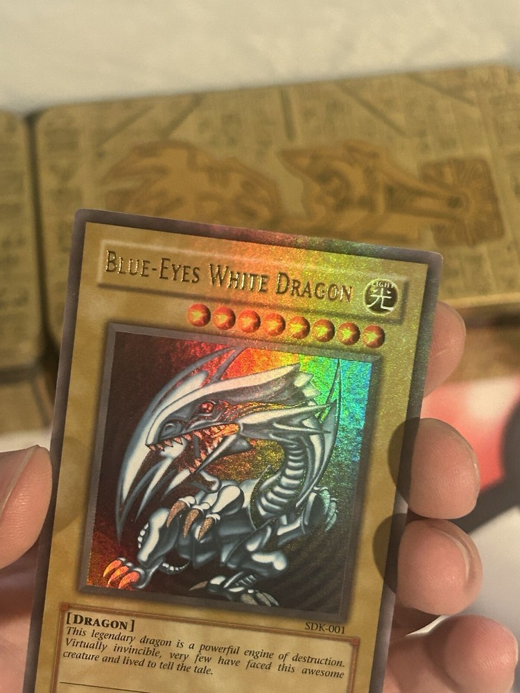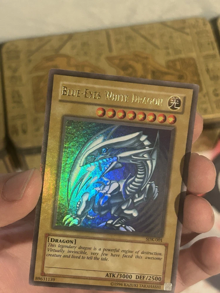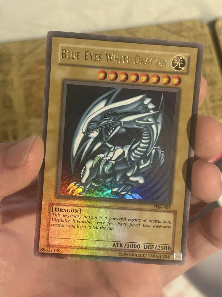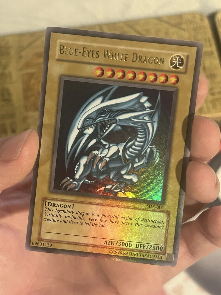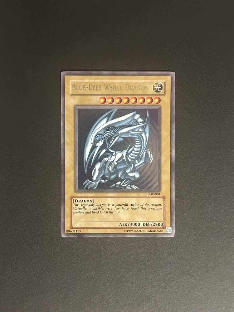 This Blue-Eyes White Dragon card is a highly sought-after addition to any Yu-Gi-Oh! TCG collection. With its Ultra Rare rarity and Full Holo Foil design, it's sure to impress both avid collectors and casual players alike. The card is from the Starter Deck: Kaiba set, manufactured by Konami, and is available in English language. The card number is SDK-001 and it features the iconic Blue-Eyes White Dragon (Yu-Gi-Oh!). This card is Unlimited, making it a great choice for anyone looking to complete their collection or start playing. Don't miss your chance to add this amazing card to your collection today! Very clean just has little mark on top left of back surface and imprint on bottom right of back surface. Slight surface scratching on back surface.
