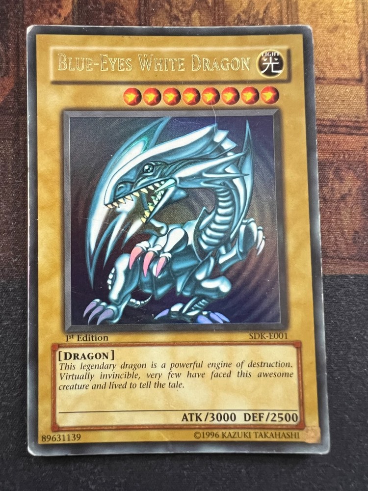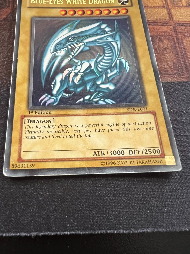 This listing is for the Blue-Eyes White Dragon SDK-E001 1st Edition in Poor condition. Various wear, whitening, some small creases etc. If you have any questions please feel free to ask. I also have other cards for sale!