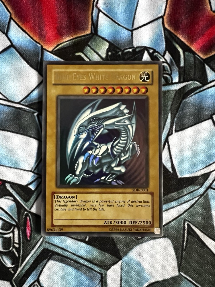 This is a Blue-Eyes White Dragon (SDK-E001), from Starter Deck: Seto Kaiba. This particular version is from the European print, denoted by the “E” preceding the number of the card. Card has been carefully for, placed in a sleeve and kept within a binder to retain maximum quality. Purchase with confidence!