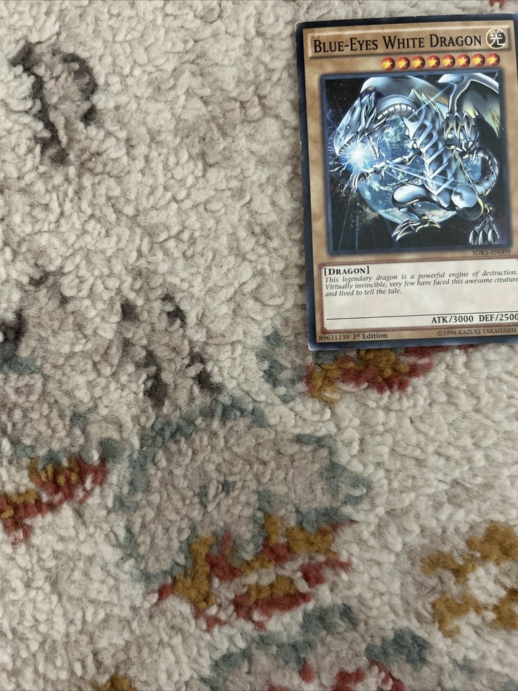 The Blue-Eyes White Dragon SDKS-EN009 card is a highly sought after collectible in the Yu-Gi-Oh! TCG world. This 1st Edition card features Seto Kaiba's iconic Dragon creature type with a high defense of 2500 and attack power of 3000. Manufactured by Konami, this English language card is a part of the Seto Kaiba character set, making it a valuable addition to any collector's deck. Its rarity as a common/short print card adds to its desirability among fans of the game.