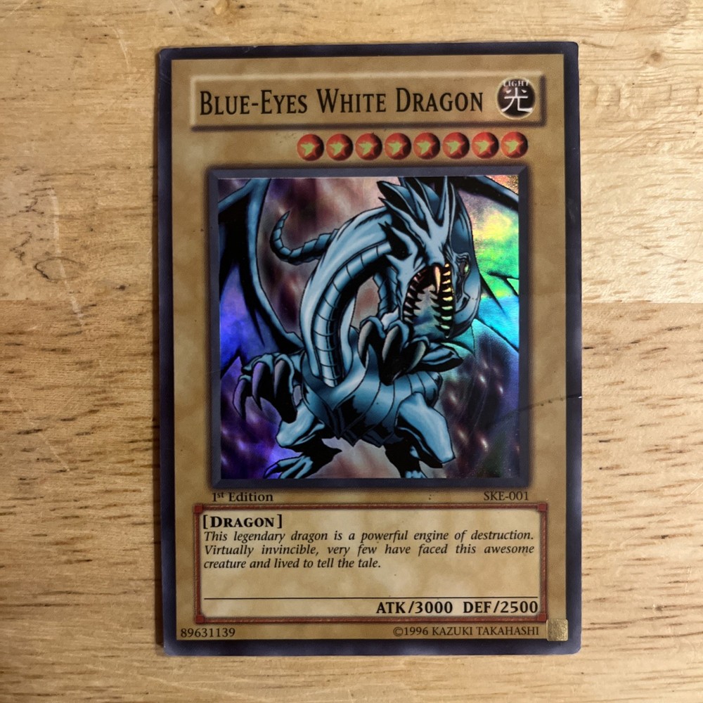 The Blue-Eyes White Dragon SKE-001 Starter Deck: Kaiba Evolution 1st Edition is a highly sought-after collectible card in the Yu-Gi-Oh! TCG. Manufactured by Konami, this English-language card is part of the Starter Deck: Kaiba Evolution set and has a holographic finish, making it a valuable addition to any collector's deck. This card has no visible scratches on the front but has damage from play on the back.