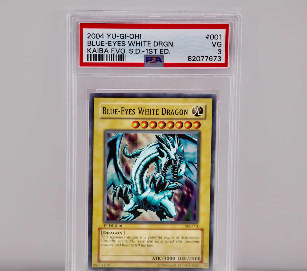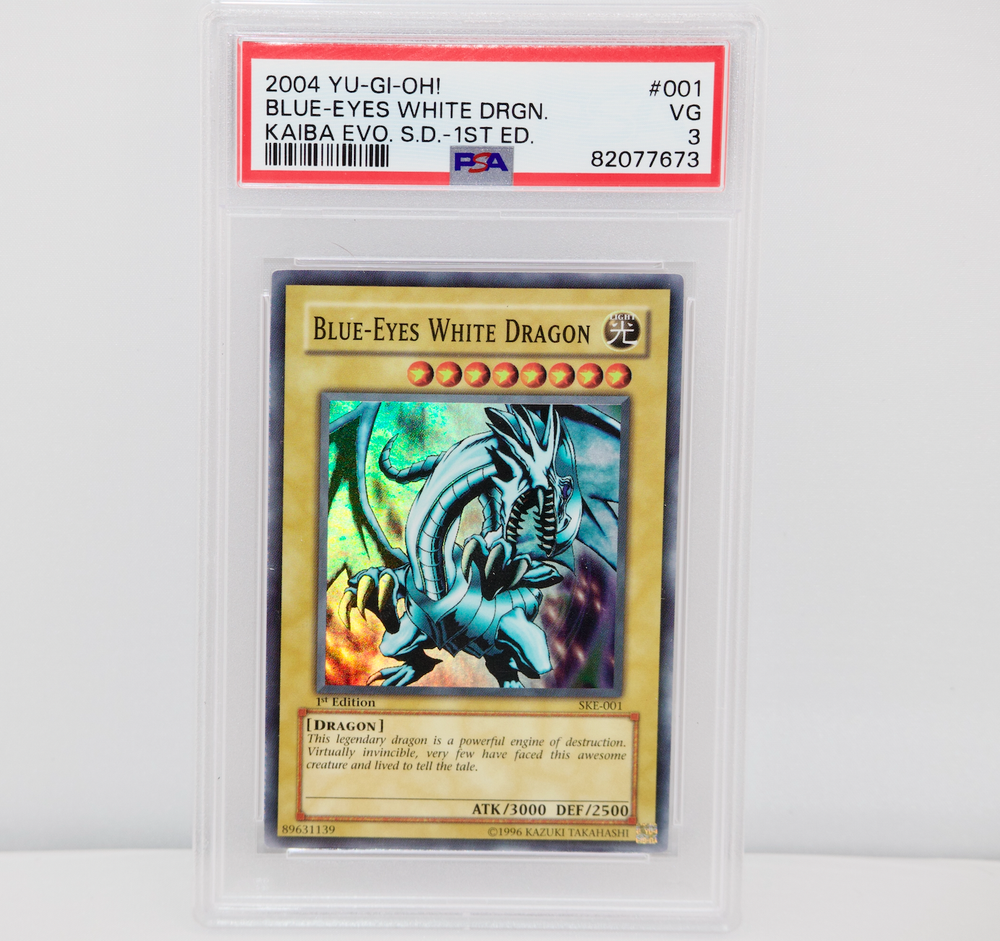 Blue-Eyes White Dragon is a Super Rare Normal Monster card from the Starter Deck: Kaiba Evolution for the Yu-Gi-Oh! TCG. It has 3000 Attack and 2500 Defense, belonging to the Dragon type with Light attribute. The card is in English and 1st Edition, featuring the card number SKE-001, manufactured by Konami.