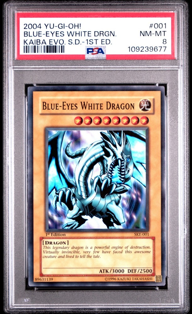 Unleash the power of the legendary Blue-Eyes White Dragon with your gameplay. This iconic card from the Starter Deck: Kaiba Evolution-1st Edition is a must-have for collectors and duelists alike, boasting an impressive 3000 attack power and 2500 defense toughness. Its rarity as a Super Rare card and its celebrated 1st Edition status make it a standout addition to any Yu-Gi-Oh! TCG collection. The Blue-Eyes White Dragon, card number SKE-001, is not just a formidable creature in the game; it's also a collectible that has been professionally graded by the PSA with a commendable grade of 8. Its attribute color is light, which aligns with the game's strategic emphasis on dark and light attribute balances. This English-language card, manufactured by Konami, is a testament to the enduring legacy of the Yu-Gi-Oh! trading card game.