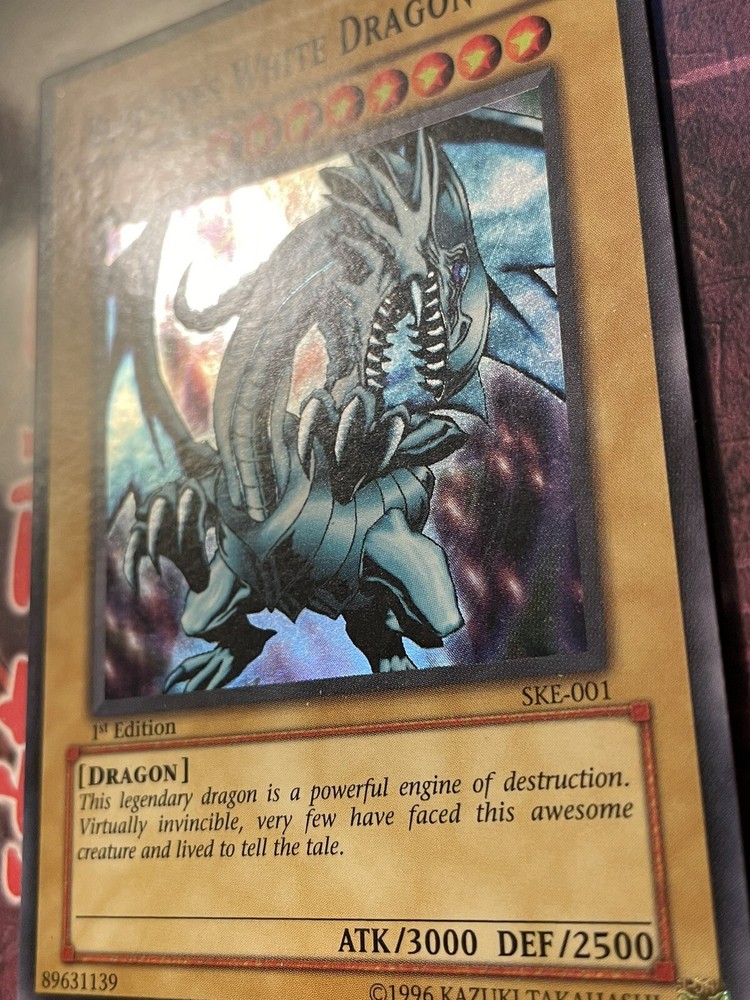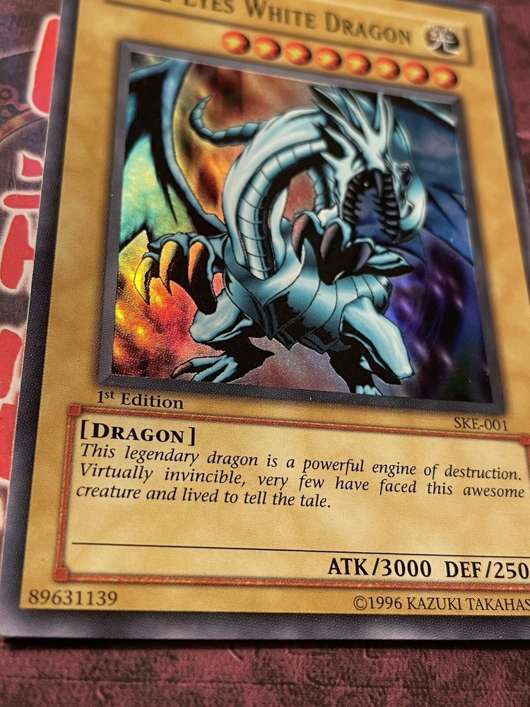 1x Blue-Eyes White Dragon (SKE-001) Super Rare 1st Edition. Condition is near mint (only imperfection is one small white dot on the back bottom edge *please see pictures*). Shipped with USPS. Fast shipping with tracking and will be sent in a top loader. Thank you!