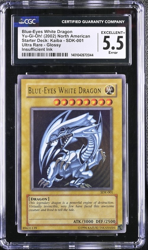 Blue-Eyes White Dragon Yu-Gi-Oh! (2002) Kaiba SDK-001 Glossy CGC 5.5 Ink Error Please see front & back pictures to answer all questions you may have on item. We ask that you would kindly leave us a positive 5 star feedback once the transaction is complete, we will do the same for you. If your experience was less than a positive 5 star, please let us know what we can do to fix it! Customer Satisfaction is our goal. Thank you for checking out our store and this item. USA Shipping Rates (USPS): -Every item is shipped with a tracking number -Combined shipping available when multiple items purchased International Shipment: -Buyer can use eBay global shipping program or contact us directly for rates **God Bless and thank you for shopping at The Meelypops Shop**
