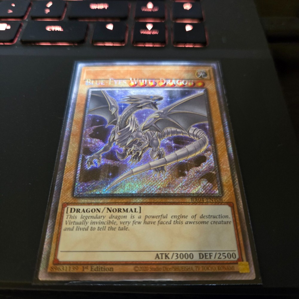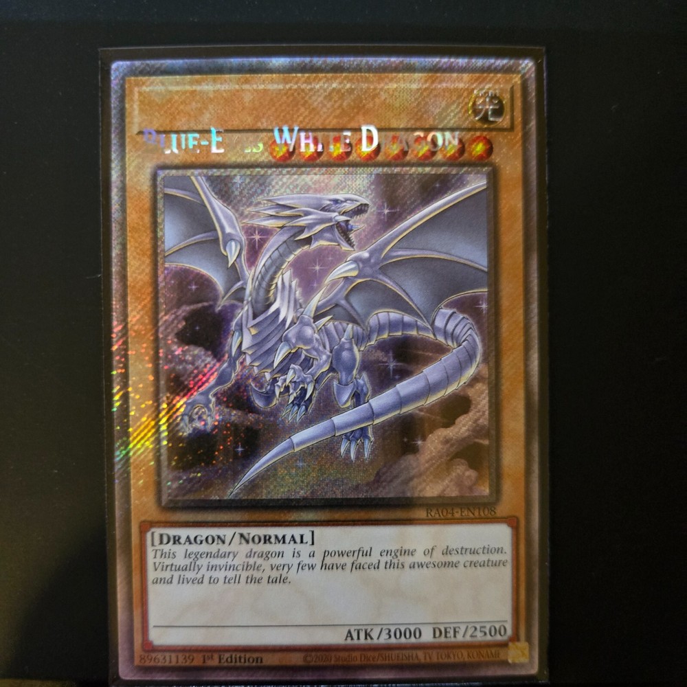 Unleash the power of the legendary Blue-Eyes White Dragon from the Quarter Century Stampede set, a must-have for any serious Yu-Gi-Oh! TCG collector. This Platinum Secret Rare card, numbered ra04-en108, features the iconic misprint that sets it apart from the standard release, adding a unique twist to its already impressive allure.Crafted by Konami, the card boasts a stunning holo finish that captures the eye and accentuates its impressive dragon monster type. With its attribute marked as 'Light', this card makes a strategic addition to any deck, allowing for a blend of spellcaster and beast-type tactics. Secure this remarkable piece for your collection and elevate your game today.