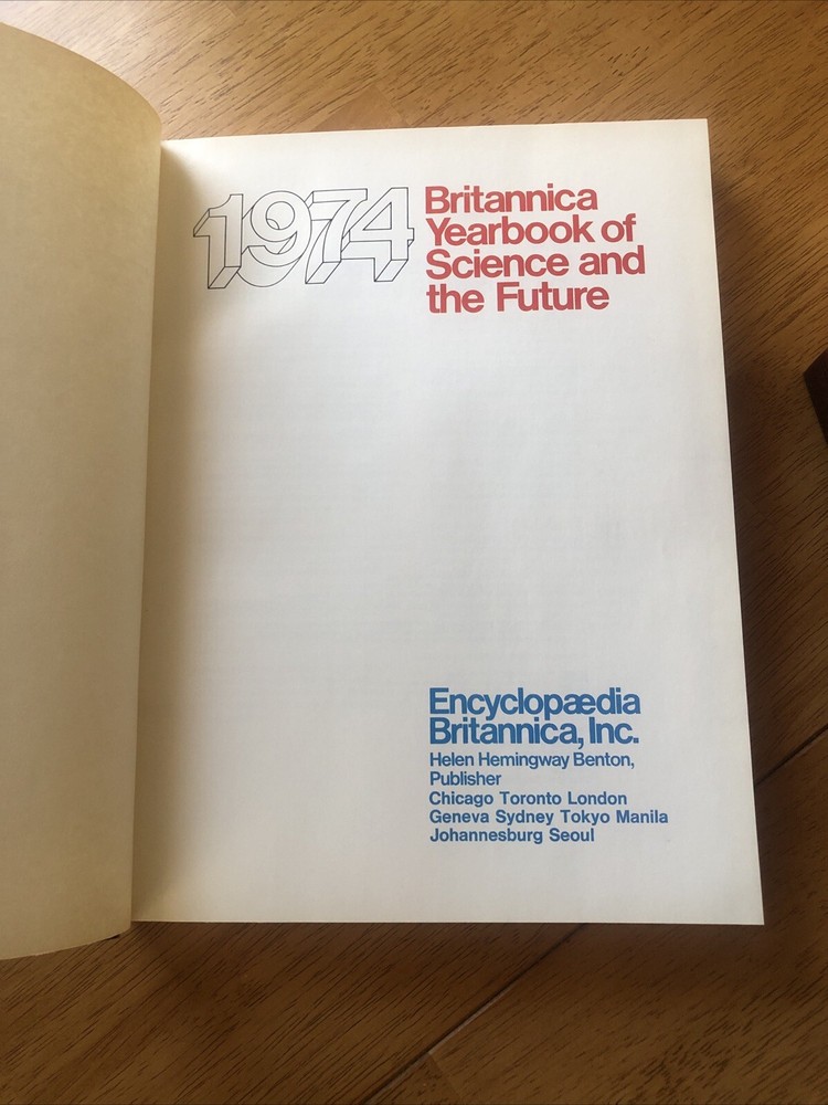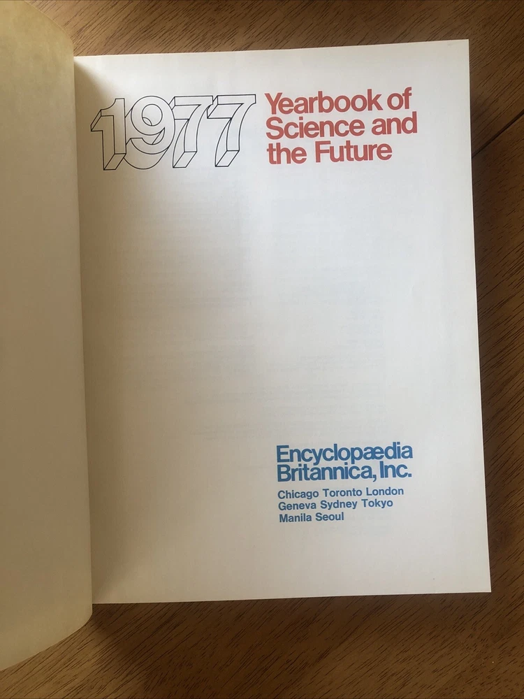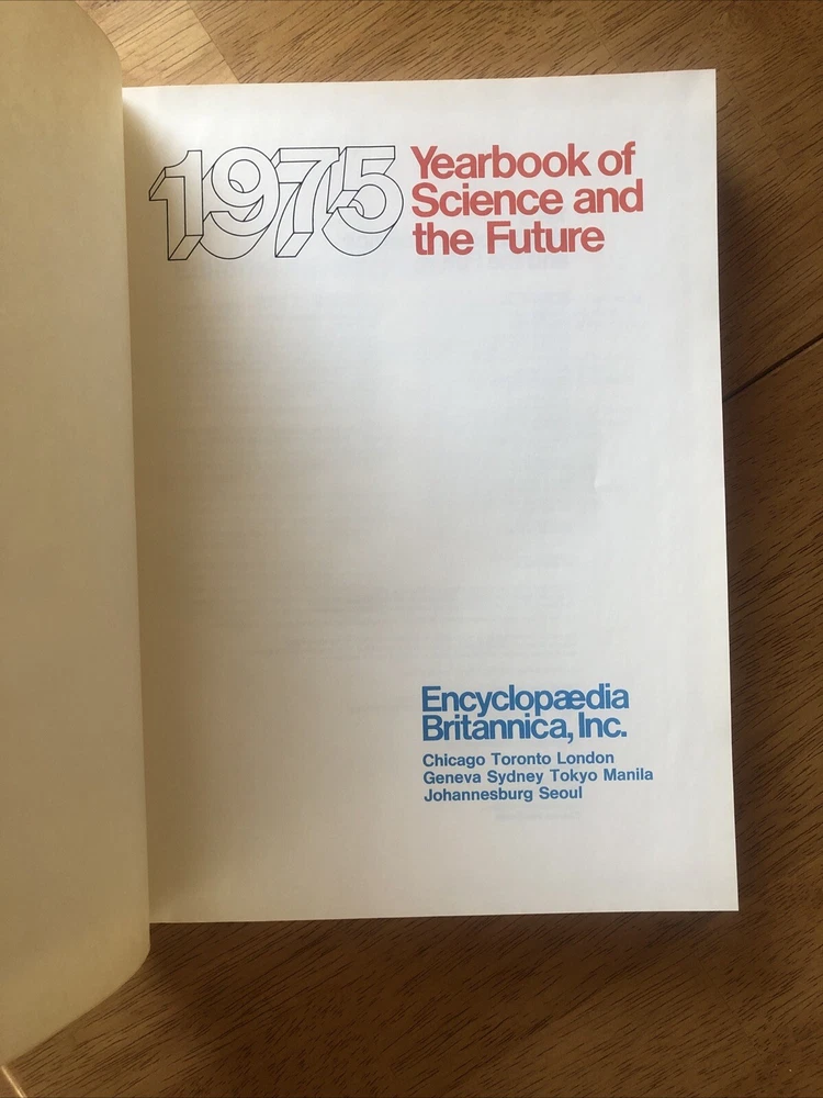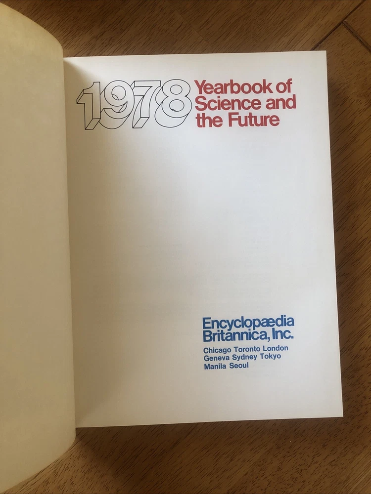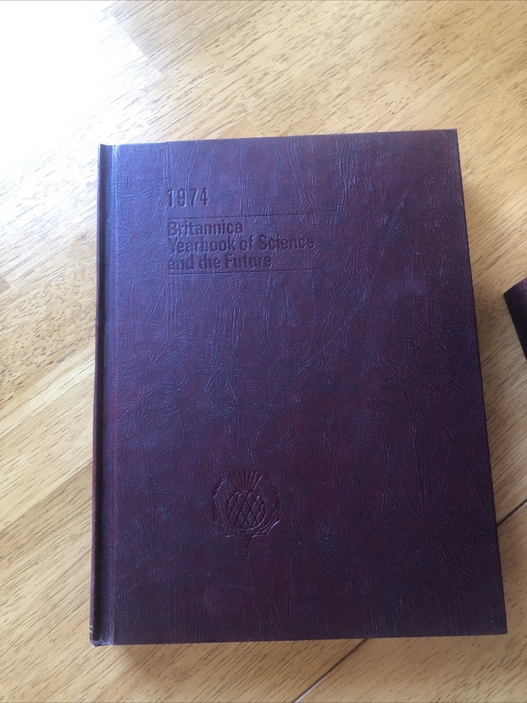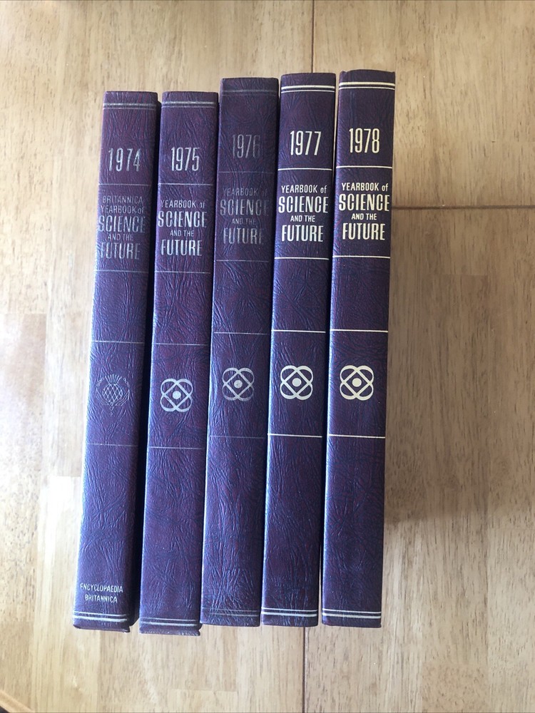 Britannica Yearbook of Science and the Future Encyclopedia Set (1974 - 1978) 01208BB ~ Pre-owned. Very Good condition. ~ Book spine attached, complete and functional. ~ All pages complete, attached to book spine no marks, no tears, no rips. ~ Hardcovers are in very good condition. May Have indentations, curve or folds, peelings especially on the edge and corner of it (please see picture). ~ Includes of 5 books: one book for each year. ~ 1974 book has different title print on the outside with a different logo (please see picture). ~ Pages and covers May have discoloration maybe due to age and use of the book. ~ Please look at the pictures because they are part of the description. ~ Printed in USA. ~ Please send me a message for any questions. ~ Explore the fascinating world of science with the Britannica Yearbook of Science and the Future Encyclopedia Set. This set includes volumes from 1974 to 1978, each illustrated and filled with captivating articles on the latest scientific discoveries and advancements. Bound in leather and published by The University Of Chicago, this set is a must-have for any science enthusiast or collector. ~ Immerse yourself in the topics of the future with this comprehensive reference collection. Featuring articles on science, technology, and culture, the Britannica Yearbook of Science and the Future Encyclopedia Set is a perfect addition to any book collection. With its unique insights and stunning illustrations, this set is sure to spark a passion for science and inspire creativity.