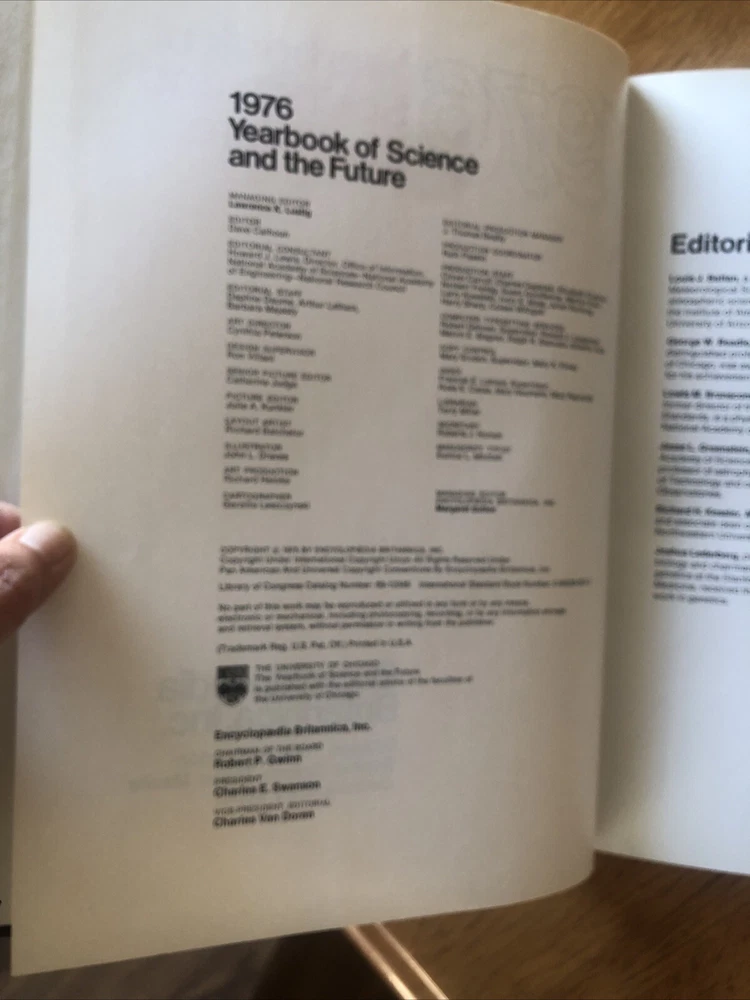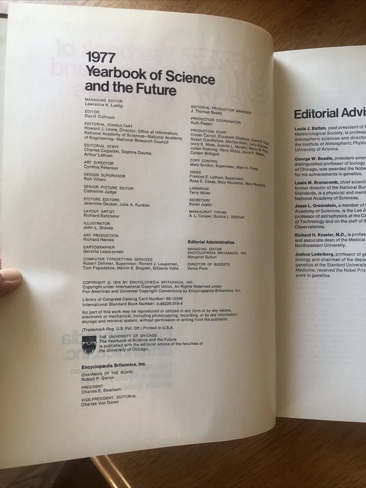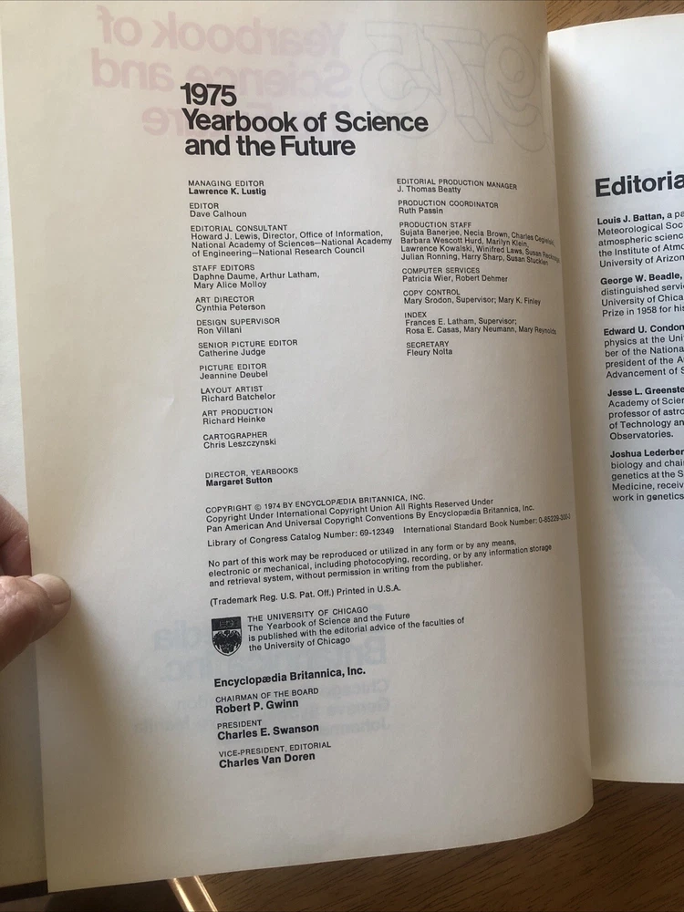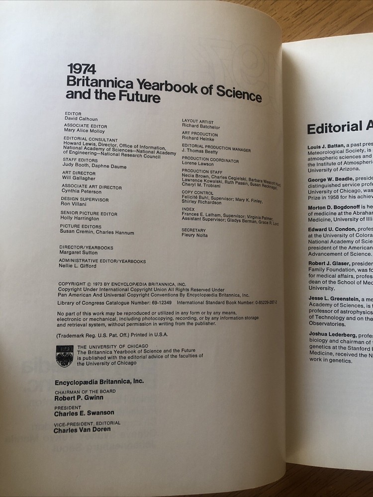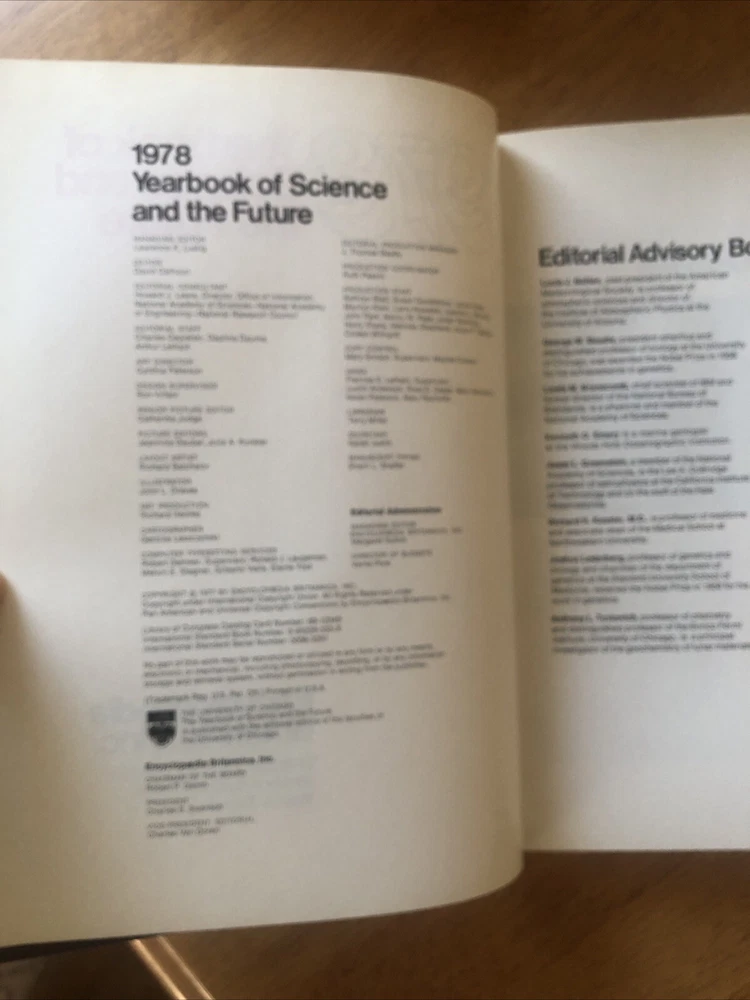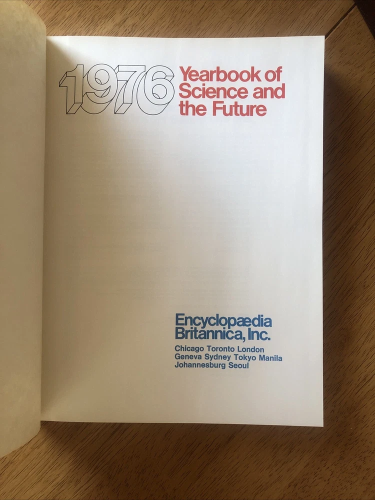 Britannica Yearbook of Science and the Future Encyclopedia Set (1974 - 1978) 01208BB ~ Pre-owned. Very Good condition. ~ Book spine attached, complete and functional. ~ All pages complete, attached to book spine no marks, no tears, no rips. ~ Hardcovers are in very good condition. May Have indentations, curve or folds, peelings especially on the edge and corner of it (please see picture). ~ Includes of 5 books: one book for each year. ~ 1974 book has different title print on the outside with a different logo (please see picture). ~ Pages and covers May have discoloration maybe due to age and use of the book. ~ Please look at the pictures because they are part of the description. ~ Printed in USA. ~ Please send me a message for any questions. ~ Explore the fascinating world of science with the Britannica Yearbook of Science and the Future Encyclopedia Set. This set includes volumes from 1974 to 1978, each illustrated and filled with captivating articles on the latest scientific discoveries and advancements. Bound in leather and published by The University Of Chicago, this set is a must-have for any science enthusiast or collector. ~ Immerse yourself in the topics of the future with this comprehensive reference collection. Featuring articles on science, technology, and culture, the Britannica Yearbook of Science and the Future Encyclopedia Set is a perfect addition to any book collection. With its unique insights and stunning illustrations, this set is sure to spark a passion for science and inspire creativity.