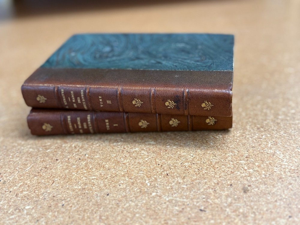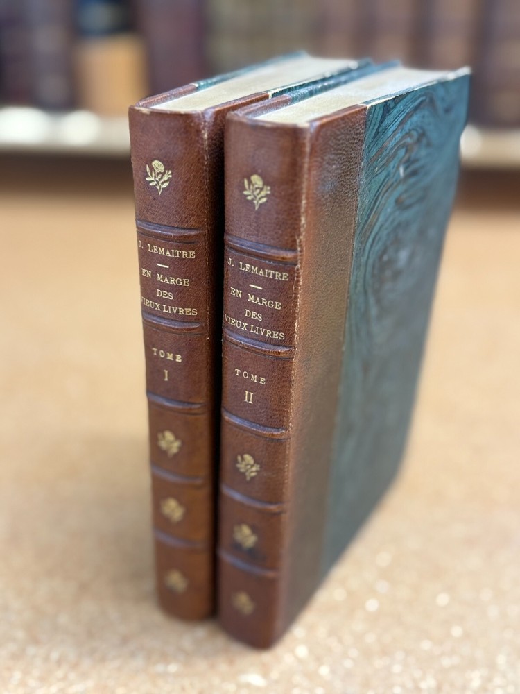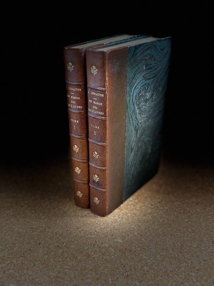 Excellent condition, brown 1/4 leather-bound antique 2 book set as shown in photos. J. Lemaitre - En Marge des Vieux Livres ( On the Margins of Old Books) Vol I & II (of 2) Language is French. Set dimensions are approx 7.5"H x5"D x2.25"W. These antique leather books are a must-have for any collector or lover of vintage decor. The set consists of a foot of beautifully bound leather books, perfect for displaying on a bookshelf or coffee table. The unique binding style of the books adds an extra touch of elegance to any room. Each book in the set is crafted with the highest quality leather, ensuring durability and longevity. The intricate details and unique design of each book make this set a true treasure for any antique book enthusiast. Whether you're looking to add to your collection or simply looking for a stunning piece of decor, this antique leather book set is sure to impress. At Rarified Books we have cultivated sources for antique books over our many years in business. Our carefully curated sets of high-quality books offer a diverse range of literature, history, philosophy, and the arts, meticulously selected to enrich any interior. With publication dates spanning from 18 00 to 1920, each book in our collection is a stunning testament to a bygone era, showcasing unparalleled craftsmanship and an abundance of character. NB: Books are non-returnable, but we will be glad to send you more detailed photos before shipping. Please message us before purchase. ~~~~~~~~~~~~~~~~The Fine Print~~~~~~~~~~~~~~~~: At Rarified Books, we take pride in offering items of extraordinary quality, value and condition. We offer the finest in modern leather-bound books and more. Books are sourced from a wide variety of sources, and are carefully inspected. Other items are equally carefully sourced ... check out our other listings and see! All descriptions are to the best of our knowledge. Sales are made as-is and no warranty is offered as to authenticity or provenance. Title passes to the buyer upon shipment. All sales are final. Sales tax may apply which is collected automatically by eBay. Returns are not accepted except in rare circumstances upon agreement. Shipping is the responsibility of the buyer unless otherwise noted or agreed. Books are professionally wrapped and protected in bubble wrapping for shipping, with additional cushioning void filler in an appropriately sized carton or padded envelope. Most books will be shipped via USPS Media Mail with tracking or FedEx Home Delivery. International Shipping through eBay's Global Shipping Program only. International buyers are responsible for all local customs fees, taxes, and duties. These charges are not included in our shipping costs. We also buy books and are always open to purchasing excellent condition books from Easton Press, Franklin Library, Folio Society and similar as well as other rare and collectible books. See our website www.modernleatherbooks.com and let us know what you have. Thank you for considering our listing!