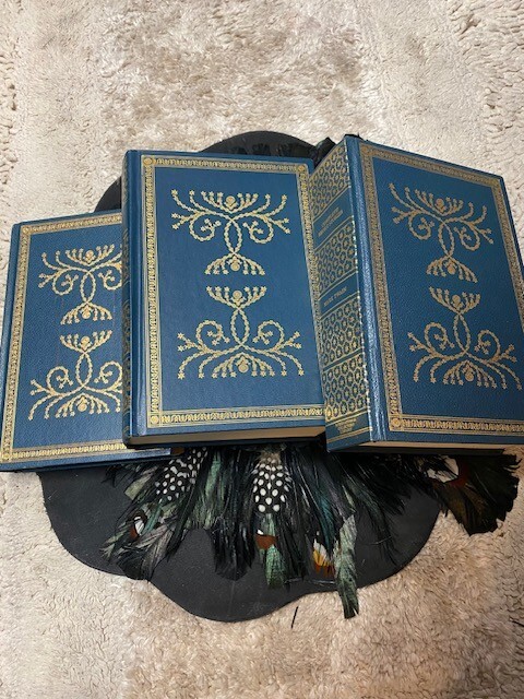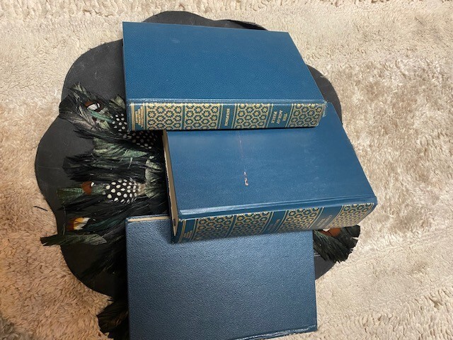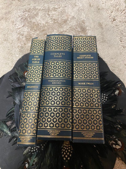 Three collector's edition books in English, bound in leather, featuring the works of Bullfinch, Mark Twain, and Washington Irving. Published by International Collectors Library, this set includes literary collections by renowned authors. The books are part of a Collector's Library and come in hardcover format. Tree of Life binding on all three books Complete Short Stories by Mark Twain, 1957, 676 pages like new Complete Tales by Washington Irving, 1975, 798 pages like new, still has order form inside, mark on back cover, see pic. The Age of Fable by Bulfinch, 1968, 383 pgs, Sticker inside cover, see pic, order form still inside, spine feels rough where it meets front cover, two 2-inch vertical marks on front cover, otherwise like new
