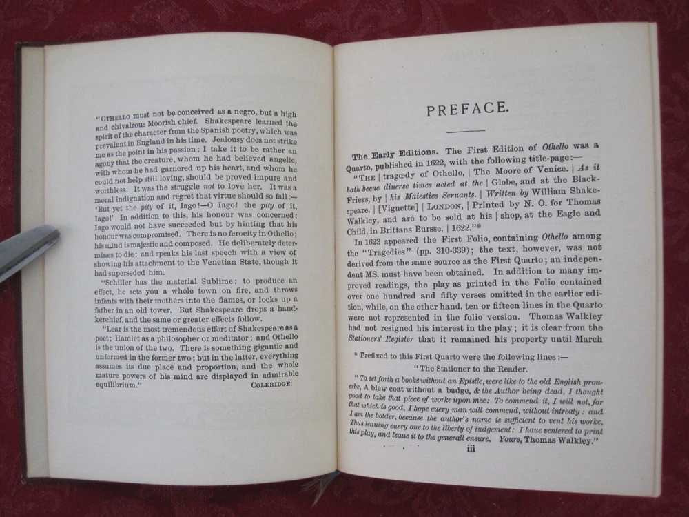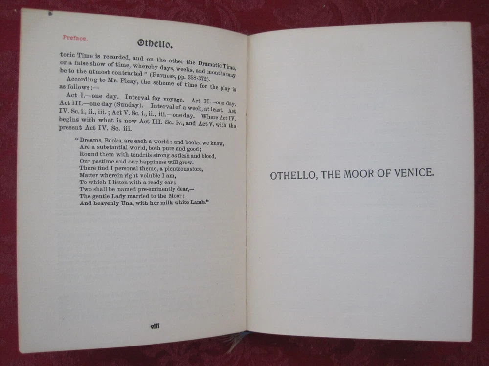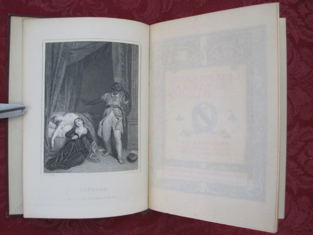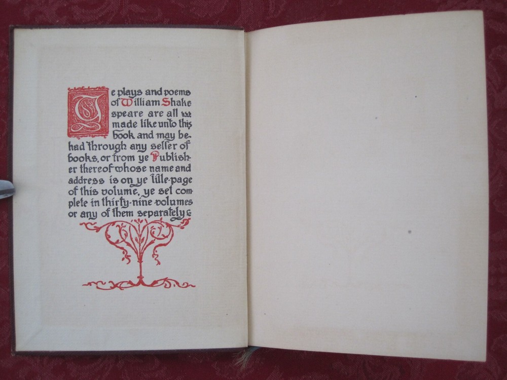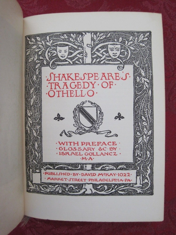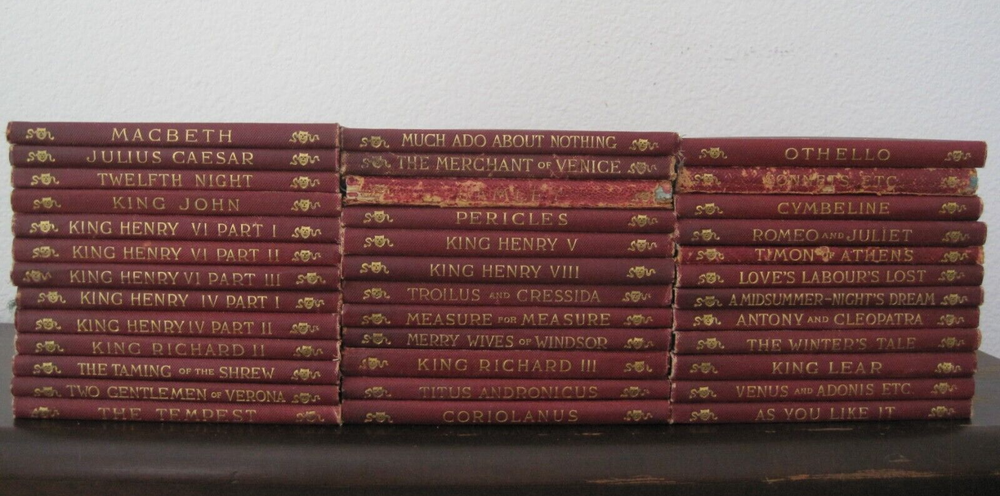 Shakespeare's Plays and Poems. Illustrated. With Preface, Glossary and Comments by Israel Gollancz. 37 Volumes. Publisher: David McKay, circa 1900. The complete set had 39 volumes. The two missing are "All's Well That Ends Well" and "The Comedy of Errors." Most volumes are in great condition with clean, unmarked pages, good binding and only slight wear on the edges and corners of the leather covers and book spines. Each volume has a frontispiece illustration, and all the tissue protectors between the illustrations and title pages are intact. The spines of "Hamlet" and "Sonnets Etc." are somewhat worn with leather pieces chipped off; the binding of "The Merchant of Venice" is loose in a few places with one place repaired with tape; name and address of the former owner inside "The Merchant of Venice."