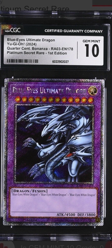 The CGC 10 Blue-Eyes Ultimate Dragon RA03-EN178 Platinum Secret Rare card is a highly sought after collectible in the Yu-Gi-Oh! TCG world. This rare card features a light attribute, dragon creature type, and boasts impressive stats of 3800 defense and 4500 attack power. Graded a perfect 10 by Certified Guaranty Company (CGC), this 1st Edition card from the Quarter Century Bonanza set is a valuable addition to any card collection. With its English language and Platinum Secret Rare rarity, this card is a must-have for fans and collectors alike.
