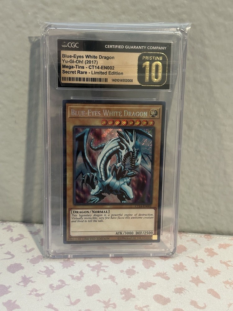 Elevate your Yu-Gi-Oh! TCG collection with the iconic Blue-Eyes White Dragon card, a must-have for enthusiasts and competitive players alike. This Secret Rare 1st Edition from the Mega Tins set, card number CT14-EN002, boasts a pristine grade of 10, ensuring its premium quality and collectability. Konami has meticulously crafted this limited edition monster card, distinguishing it with its distinct blue attribute. Encased by the Certified Guaranty Company (CGC), it preserves the card's integrity and celebrates its status as a celebrated piece within the Yu-Gi-Oh! trading card game universe.