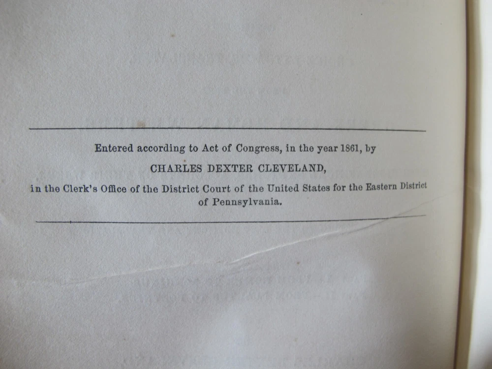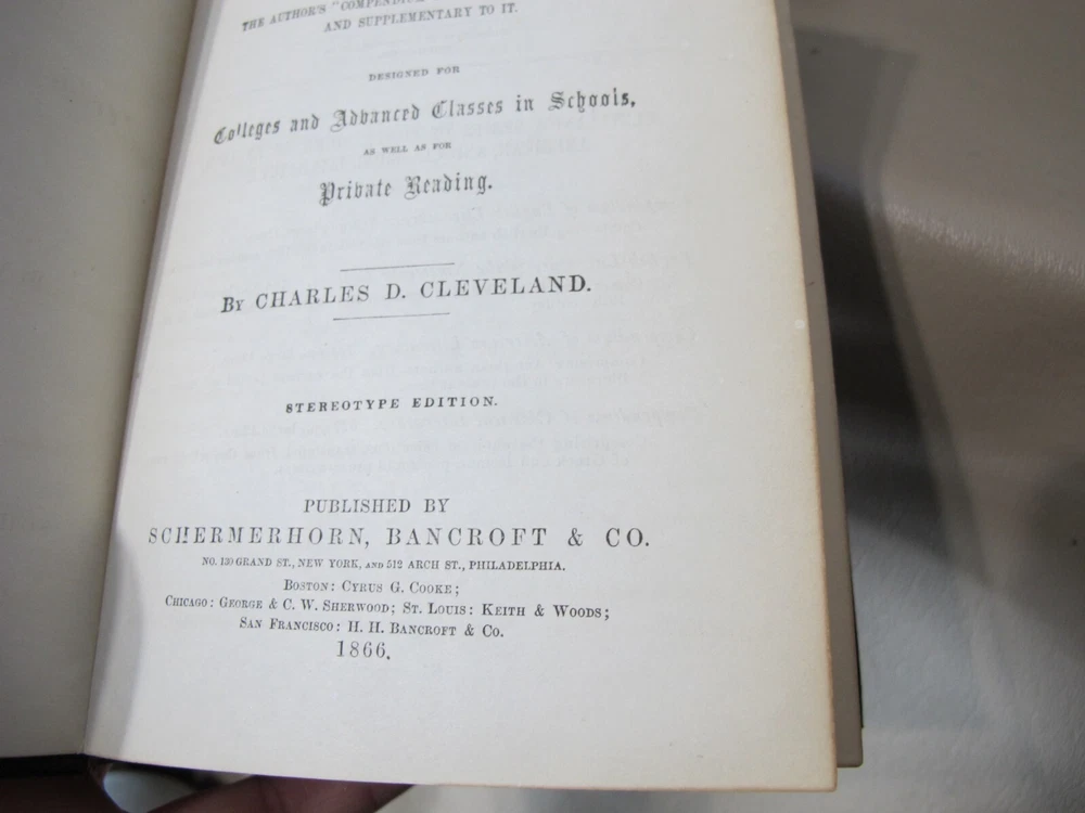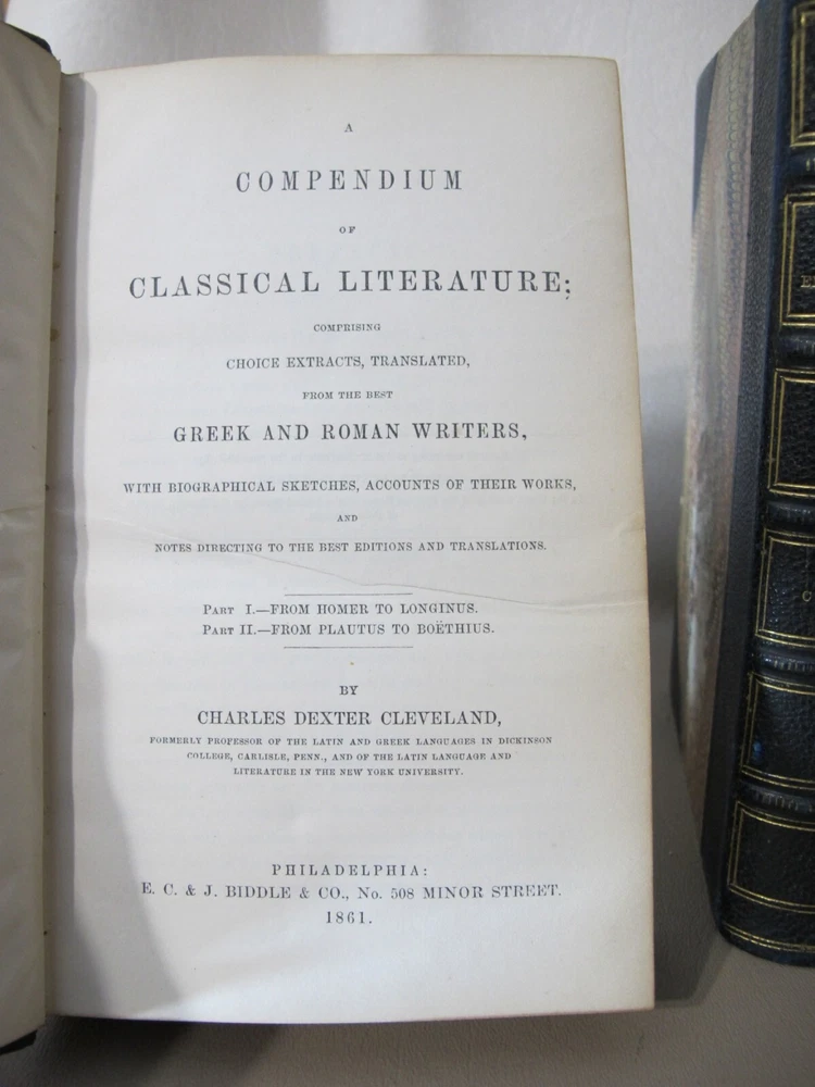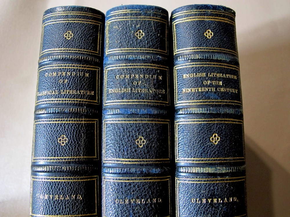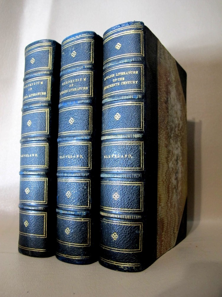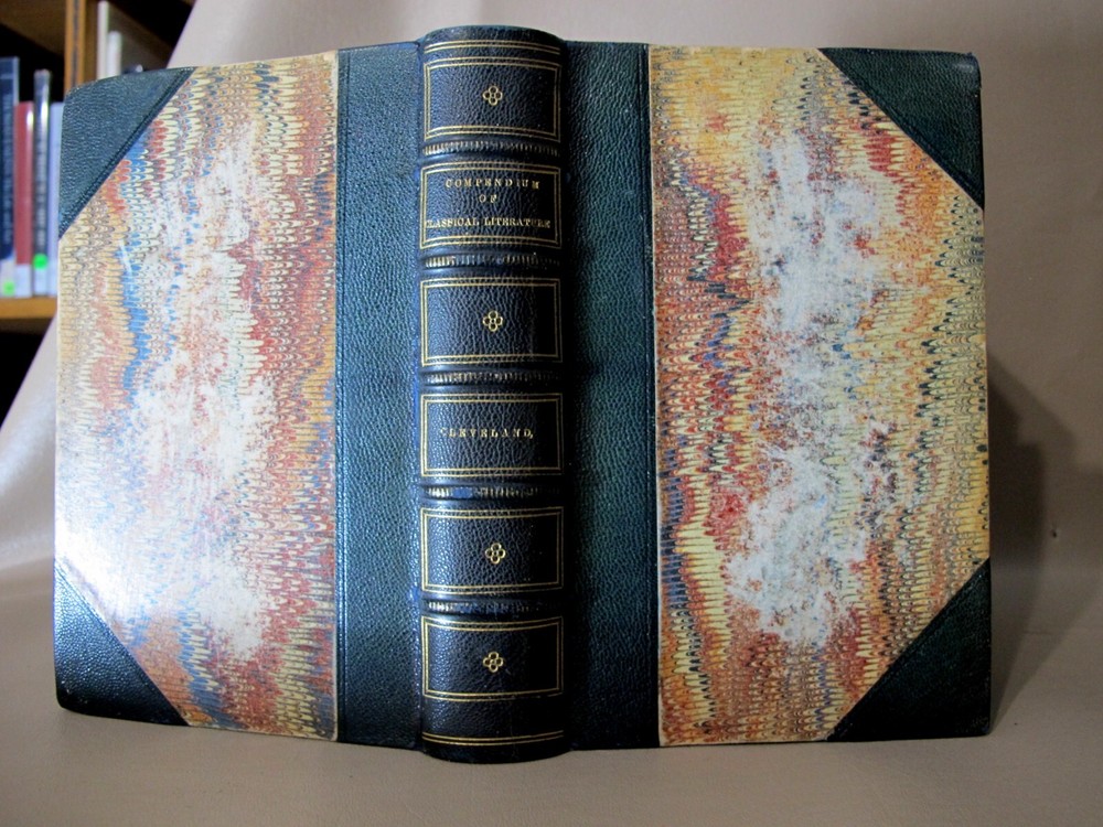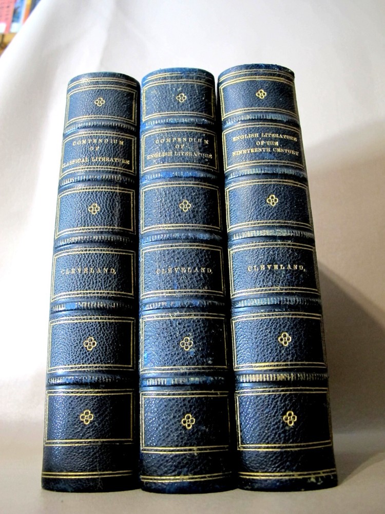 Three volume set, printed between 1861 and 1866 (likely a break for the Civil War). Bound in three quarter leather over marbled paper boards with matching marble design covering page edges. Excellent condition for age; bindings are all intact with only light scuffing; internally pages are tight and clean. Volume titles: 1. A Compendium of Classical Literature 1861 2. A Compendium of English Literature 1866 3. English Literature of the Nineteenth Century 1866 Track Page Views With Auctiva's Counter