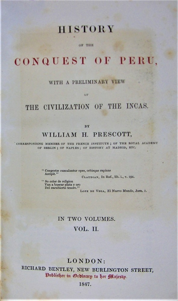 William Hickling Prescott (May 4, 1796 – January 28, 1859) was an American historian and Hispanist, who is widely recognized by historiographers to have been the first American scientific historian. Despite suffering from serious visual impairment, which at times prevented him from reading or writing for himself, Prescott became one of the most eminent historians of 19th century America. He is also noted for his eidetic memory. This is a truly wonderful, engrossing, captivating history, with a depth of research that I can’t even imagine. Prescott, who had already completed something similar for the conquest of the Aztec empire, admits in the preface that he started to lose his sight while writing this, but that he did not let this get in the way of his work, employing the use of what remained of his vision plus someone who could type and read out passages from the original texts. What he serves up at the end is a supreme history with intricate detail. Starting with a history of the Inca’s and the empire as it stood at the fateful time the Spanish set foot on South American soil, Prescott then details the inexorable advance of the conquistadors down the Pacific coast and into the heart of the empire, bringing it to it’s knees and eventually to it’s end with bold abandon, daring, and above all else callous cruelty and perfidy.
