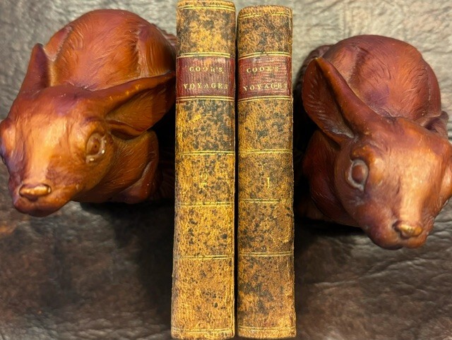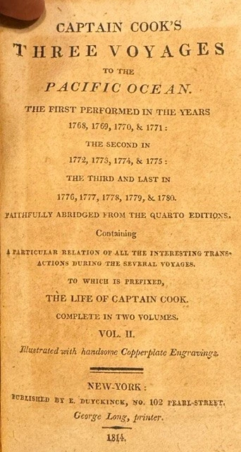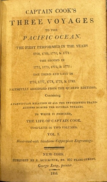 Captain Cook's Three Voyages to the Pacific Ocean. The First Performed in the Years 1768, 1769, 1770 & 1771: The Second in 1772, 1773, 1774 & 1775: The Third and Last in 1776, 1777, 1778, 1779 & 1780. Faithfully Abridged from the Quarto Editions. Containing a Particular Relation of All the Interesting Transactions during the Several Voyages. To which is prefixed, the Life of Captain Cook. New York: E. Duyckinck. George Long, printer. 1814 Complete two volume set. Full Leather bindings with gilt title on the spines. Very minor cracking to the top of the front cover of volume one. Previous owner's inscription on front pastedown of both volumes in "period" writing. Internally both volumes are tight and with normal toning to the pages for their age. Sporadic spotting on a few pages in volume one but doesn't affect the text. A great set. Extremely RARE! Good Luck!
