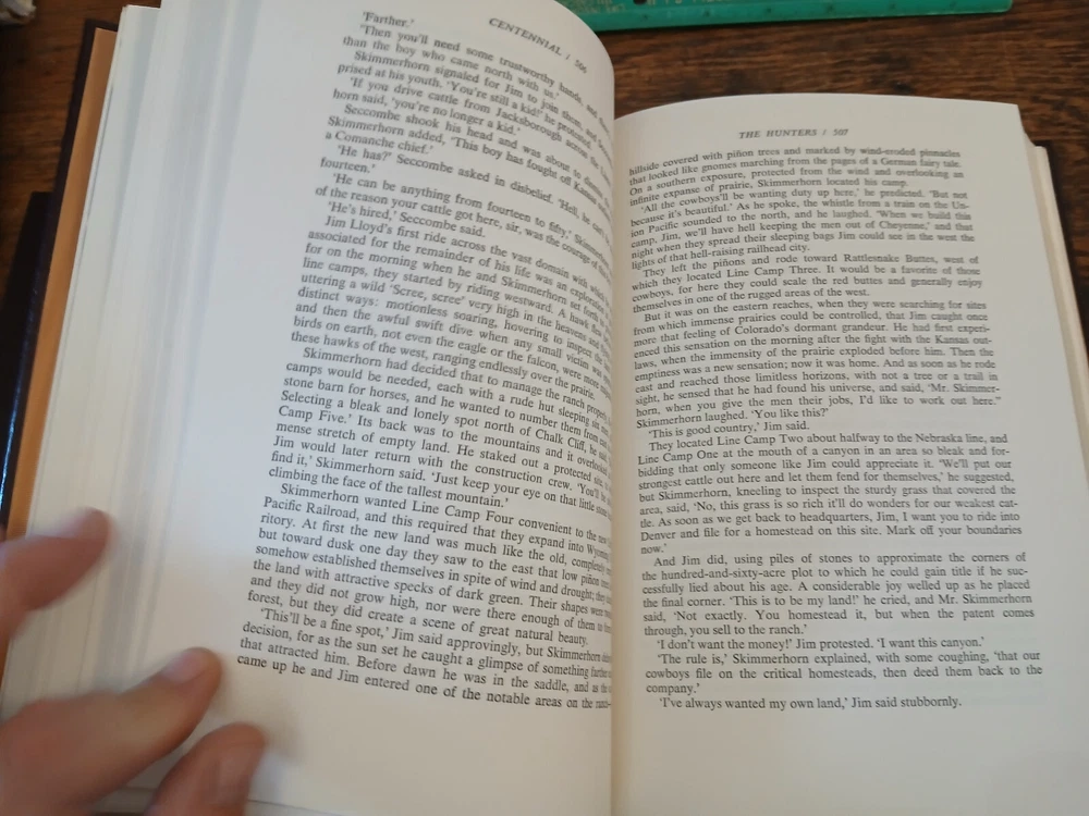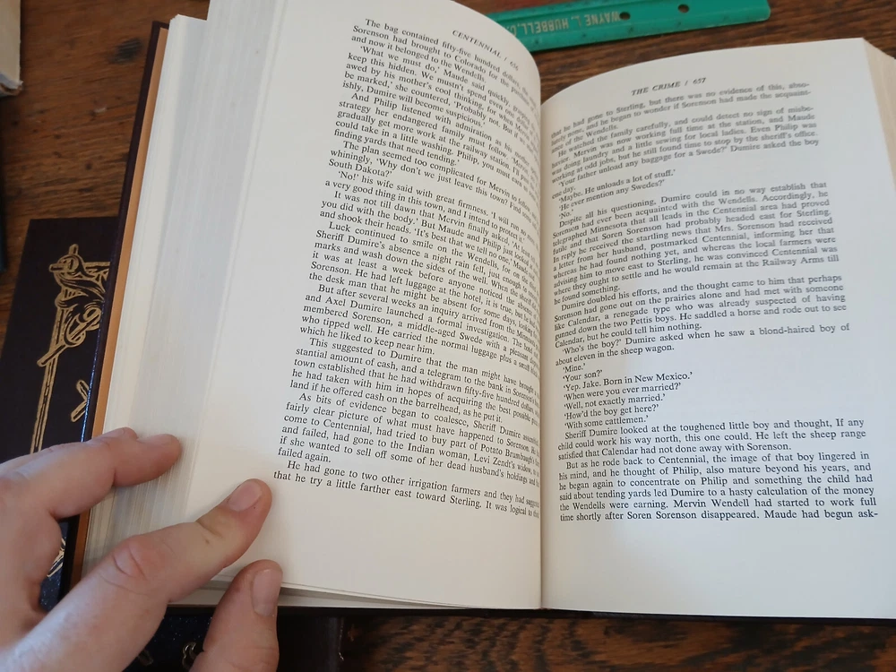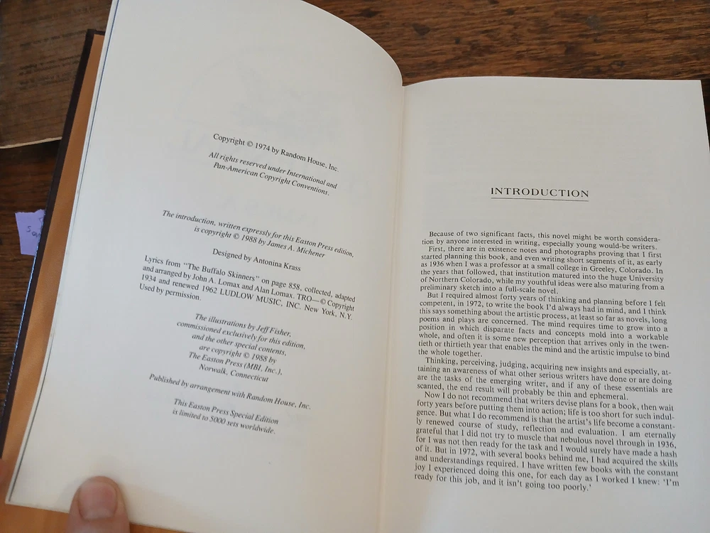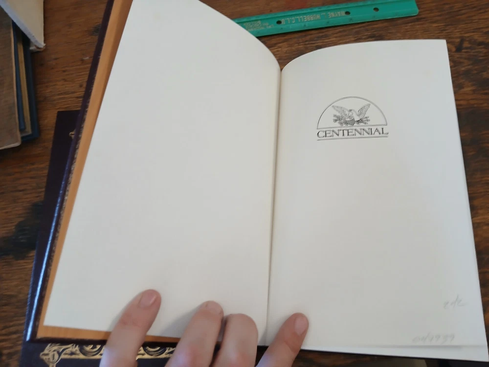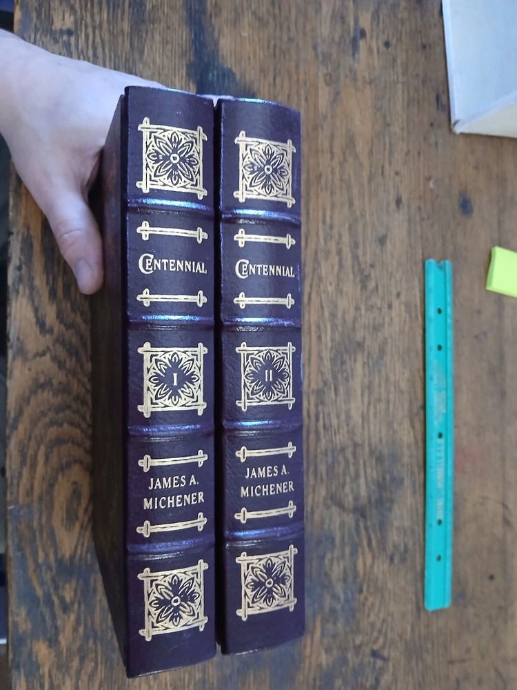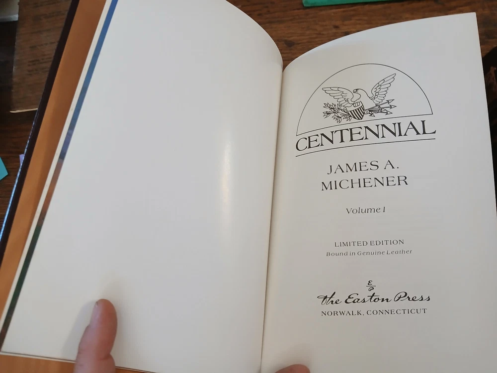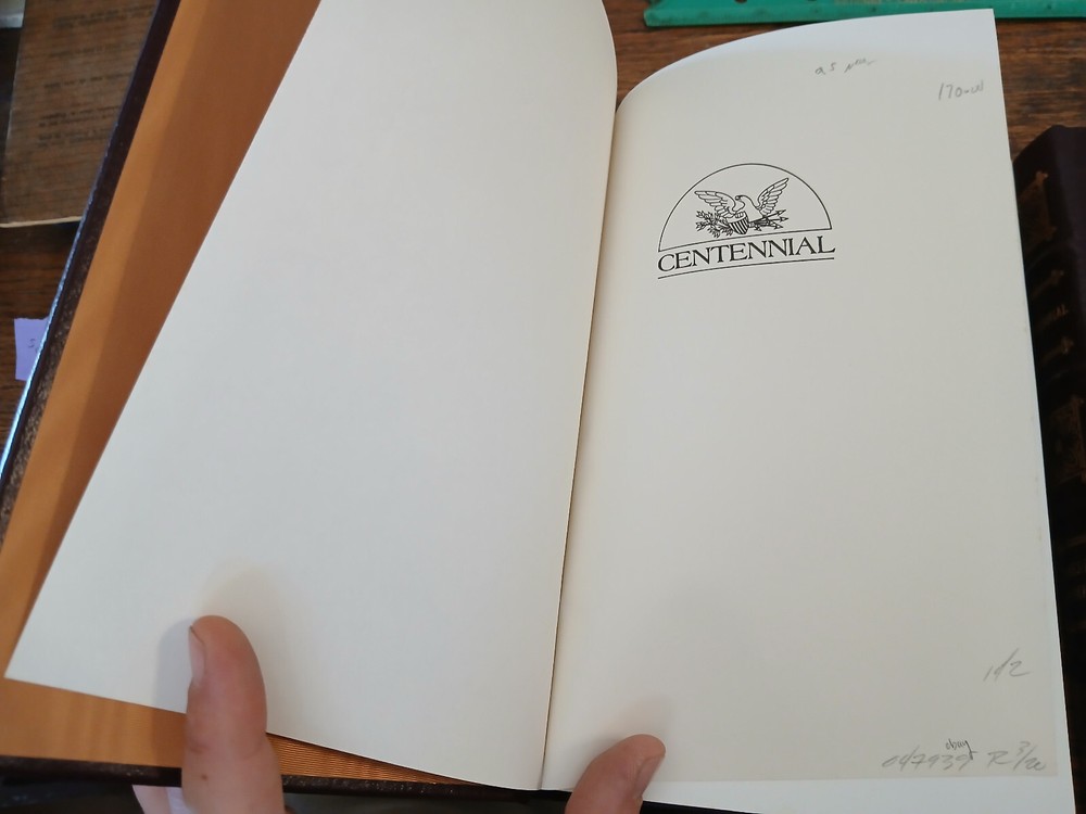 From Xochi's Sets (CEN), 2vol.set; 909pp.; HBs maroon leather w/gilt;-gilt trim w/ribbon; Historical novel of Colorado. illus. "It traces the history of the plains of north-east Colorado from prehistory until the mid-1970s. Geographic details about the fictional town of Centennial and its surroundings indicate that the region is in modern Weld County."