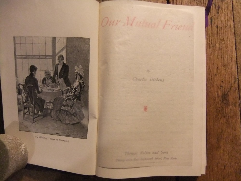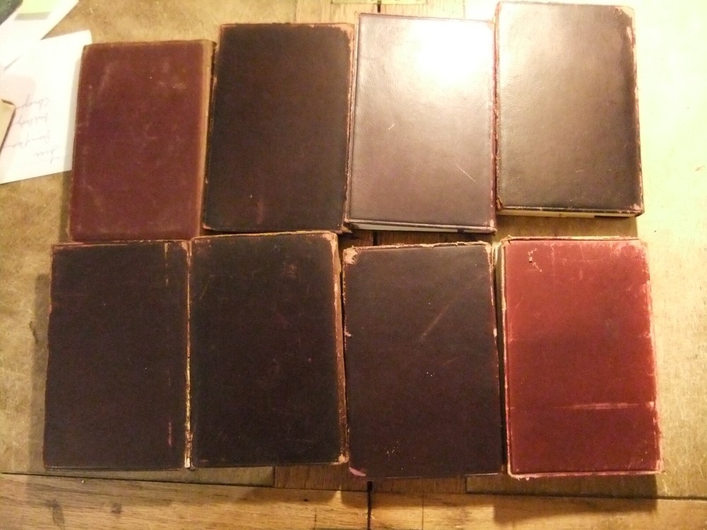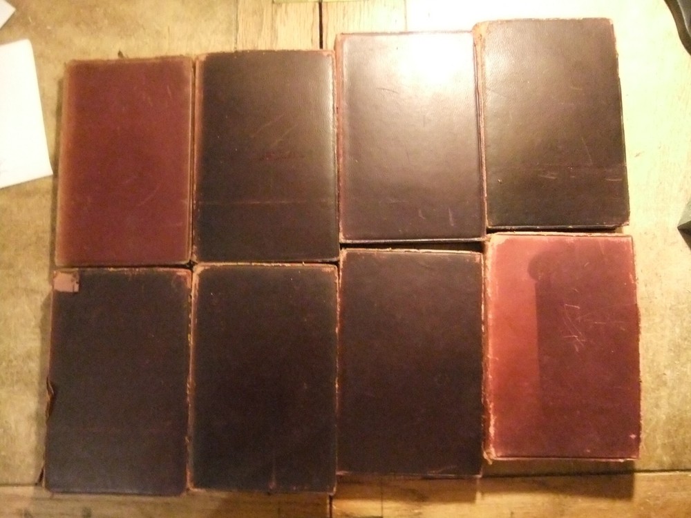 Early 1902 leather bound 8 vol. set published by Thomas Nelson. Books have soft leather wrappers. All have wear from moderate to heavy, some with old owner names. Titles are : Nicholas Nickleby, Our Mutual Friend , Martin Chuzzlewit, Oliver Twist, Dombey and Son, Bleak House, Barnaby Rudge, and Little Dorrit.