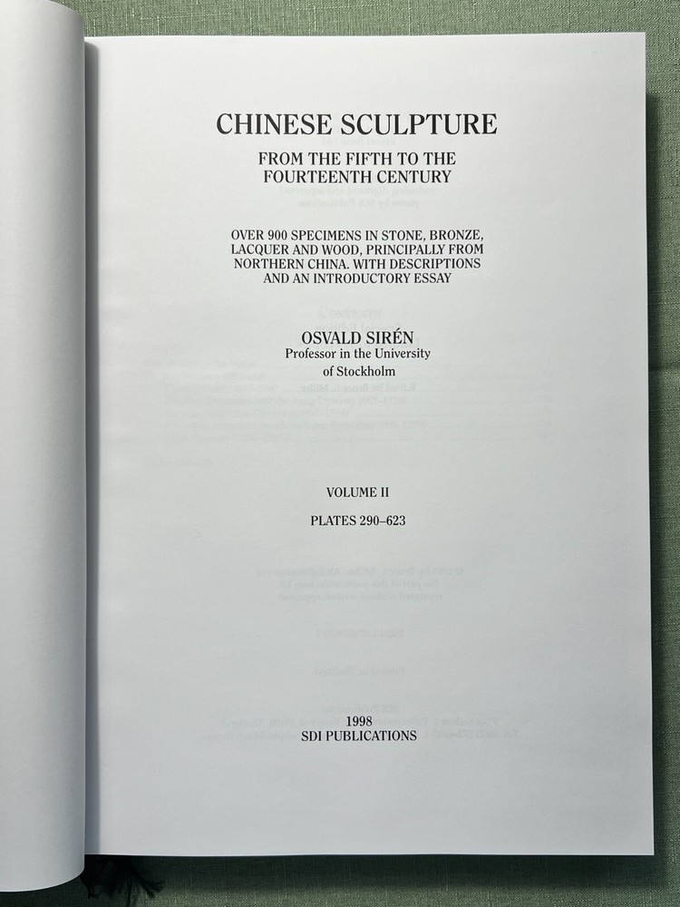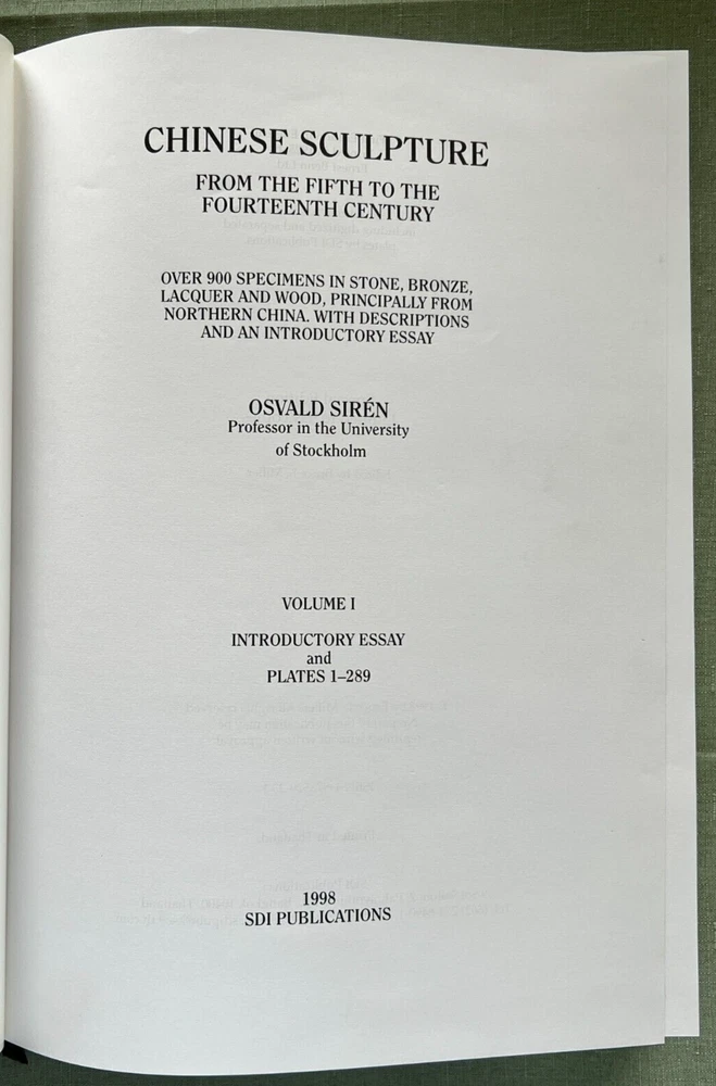 Chinese Sculpture from the Fifth to the Fourteenth Century 2 Volumes (Complete Set) by Oswald Siren Published by SDI Publications, Thailand, 1998 Language: English This is a two volume set of Chinese Sculpture from the Fifth to the Fourteenth Century, in excellent condition. Both volumes are bound in original faux maroon red leather with gold embossed covers and title pages. The two volumes are in the original matching slip case box. Volume I: 69 pages Volume II: 78 pages. Plus more than 623 plates Virtually unobtainable, this work, by one of the foremost Asian scholars of the last century, remains the most comprehensive treatise on Chinese Buddhist sculpture in any western language. In this monumental study, Siren commences with a comprehensive introduction and survey of the genre. He covers o ver 900 specimens in stone, bronze, lacquer and wood, principally from northern China. A sumptuous, wonderful book. Many of the statues were photographed in situ and have since been destroyed. This is a completely unique documentation of Chinese art and sculpture, which cannot be repeated. This is from a limited edition printing of 999 copies. The set is complete and in excellent condition. No marks, scrapes, tears or page turns. Out of print and rare. Shipping: We ship within 2 business days. All books are wrapped in paper, bubble and carboard box. Returns: This item is not returnable. Please view images carefully.