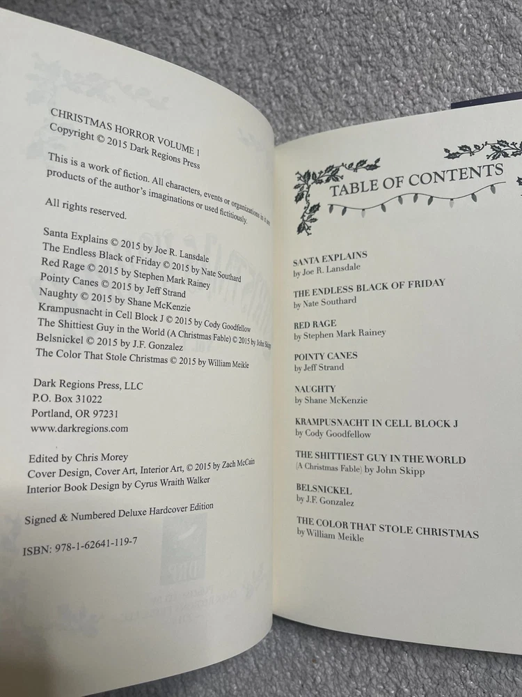 For sale here two Deluxe Editions from the now defunt Dark Regions Press: - ' Christmas Horror Vol.1 ' . Deluxe Edition of 70 copies - copy for sale here : # 34. ISBN : 978-1-62641-119-7 - ' Christmas Horror Vol.3 ' . Deluxe Edition of 200 copies - copy for sale here : # 34. ISBN : 978-1-62641-313-9 - Bound in leather and housed in a slipcase. - ' Christmas Horror Vol.3 ' also includes the stories from 'Christmas Horror vol.2' , which was only released as a small paperback. - Both books have the same number - this is a matching set !!! Description : ' Christmas Horror Vol.1 ' Introducing the new annual Dark Regions Press holiday anthology: Christmas Horror. Volume 1 features all new and original stories from authors Joe R. Lansdale, John Skipp, Cody Goodfellow, Jeff Strand, J. F. Gonzalez, Stephen Mark Rainey, Nate Southard, Shane McKenzie and (in deluxe hardcover retail editions only) William Meikle. Each story is preceded by a full page/full bleed color illustration by artist Zach McCain. Table of Contents : “Santa Explains” by Joe R. Lansdale “The Endless Black of Friday” by Nate Southard “Red Rage” by Stephen Mark Rainey “Pointy Canes” by Jeff Strand “Naughty” by Shane McKenzie “Krampusnacht in Cell Block J” by Cody Goodfellow “The Shittiest Guy in the World (A Christmas Fable)” by John Skipp “Belsnickel” by J. F. Gonzalez “The Color That Stole Christmas” by William Meikle (Deluxe Hardcover Editions Only) ' Christmas Horror Vol.3 ' Christmas Horror Volume 3 is here! The third installment of our popular Christmas Horror anthology line features stories by authors Richard Chizmar, Norman Partridge, Stephanie M. Wytovich, Jeff Strand, James Chambers, Lisa Morton, Richard Thomas, William Meikle, Jason V Brock, John Palisano and Simon Strantzas! Shipping : - I ship worldwide, but since i'm located within the EU (Sweden) all other countries might have customs fees - I will not be held responsible for these as this is a fee that may be charged by the country of destination .I will not mark a lower price on the parcel. - Shipping will be only by registered and insured mail . - All my items come from a free smoke / pet home! If you need additional photos or more info let me know.