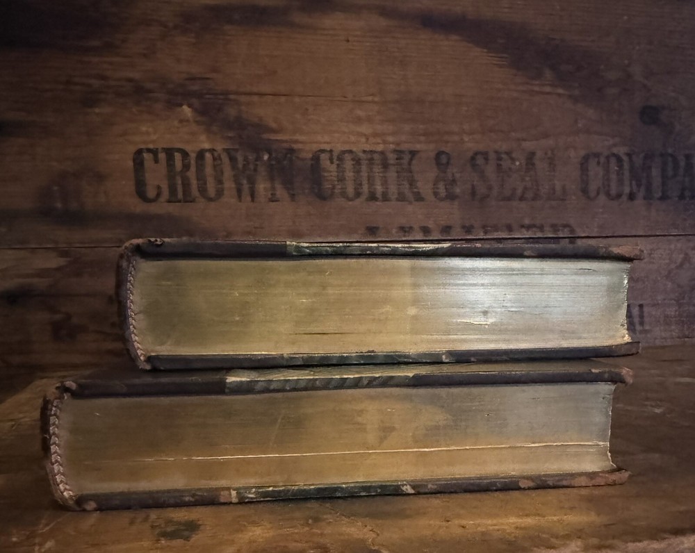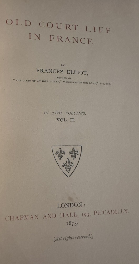 Item : Leather Book Set OLD COURT LIFE IN FRANCE Age : c. 1873 Author : Frances Elliot Publisher : Chapman & Hall; Piccadilly, London. Printed : Virtue & Co.; City Road, London. Condition : Good Dimensions : 8 3/4” x 6” x 1 3/8” Notes : Complete two volume book set. Leather spine and corners. Gilded spine lettering and design. Close to a 900 page volume set. Wear commensurate to age. Estate lot purchase, San Marino, CA. Come well packaged in sealed acid free clear sleeve.