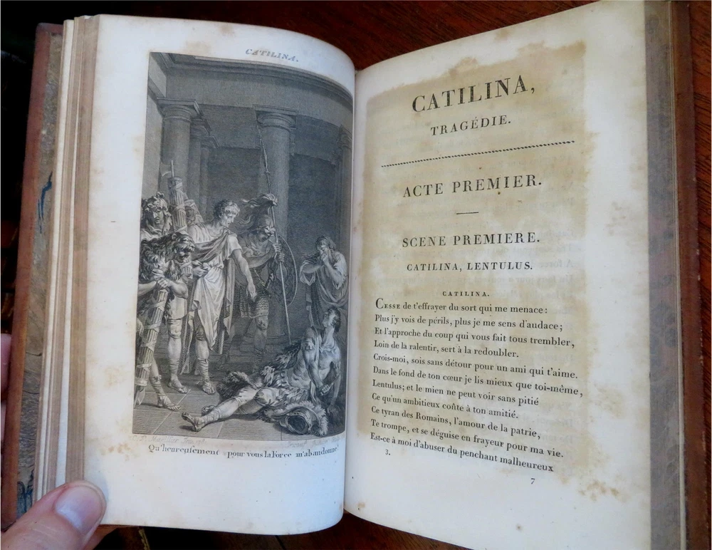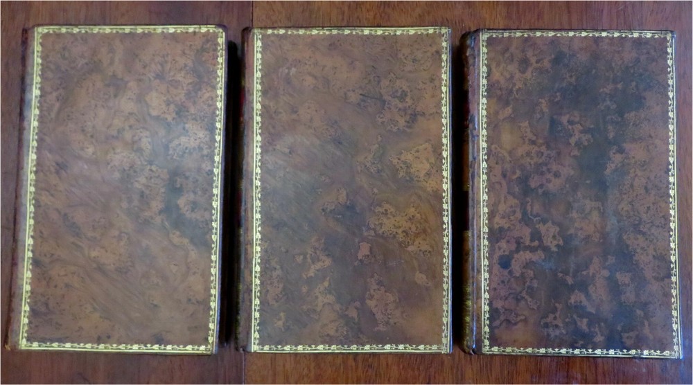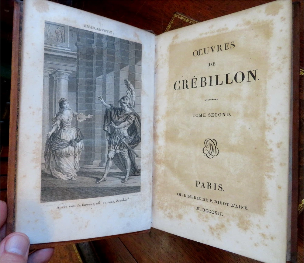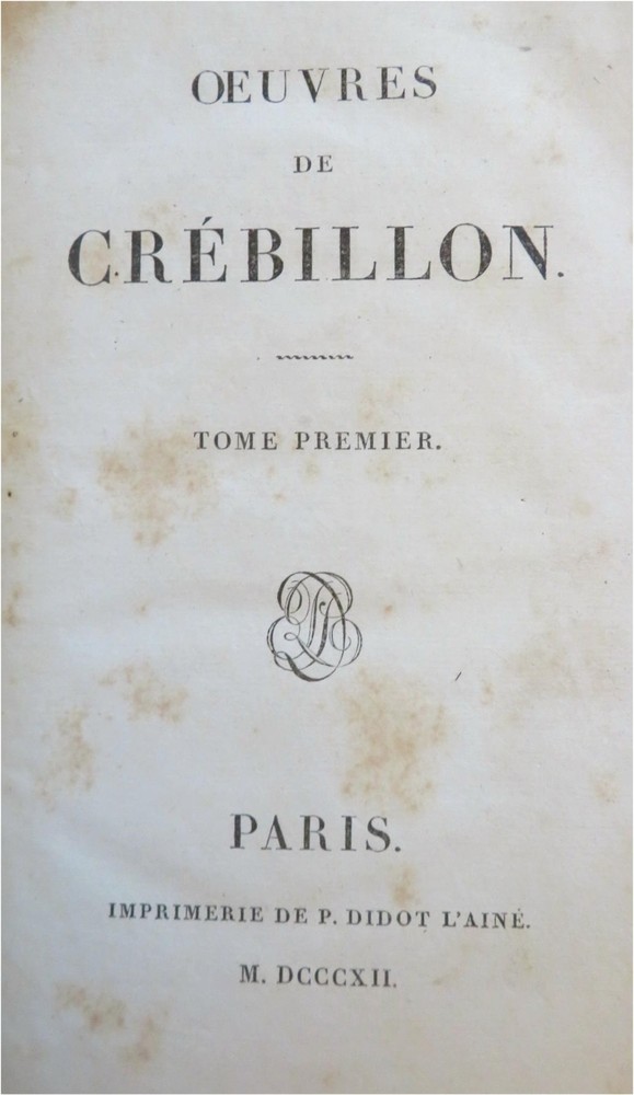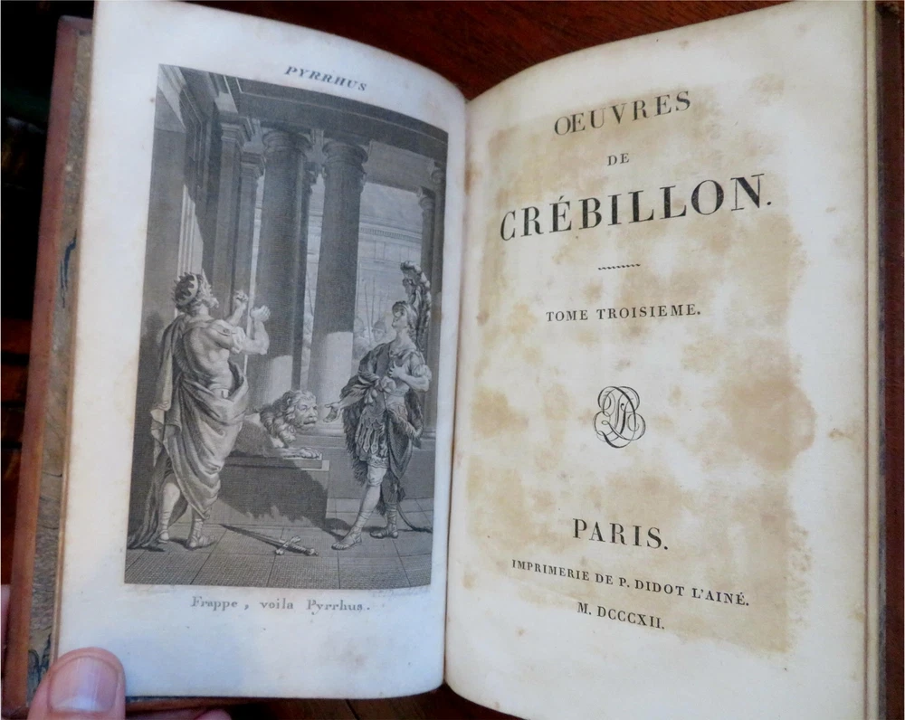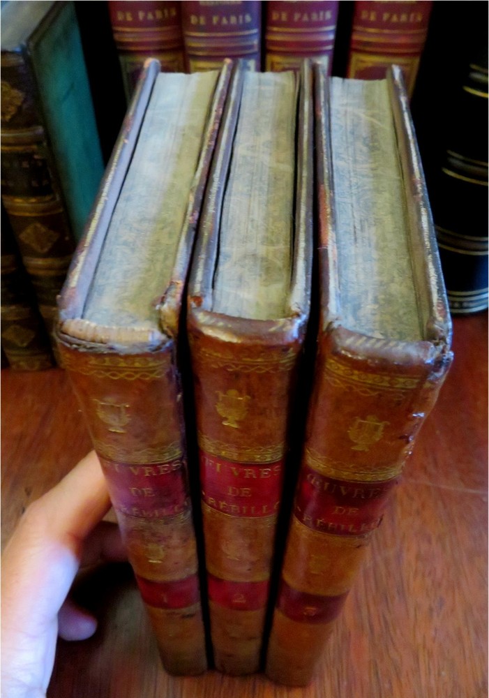 Claude de Crebillon Collected Works 1812 leather French 3 v. set Chippendale Claude de Crebillon Collected Works 1812 leather French 3 v. set Chippendale (Old Books, 19th Century Books, Leather Books, French Books, Claude de Crebillon, French Lit.). Ouvres de Crebillon. Published 1812, Paris by P. Didot. 3 volumes, each c. 275 pages. Text in French. Chippendale style bindings. Total of nine engraved plates within. Lovely early 19th century antiquarian full tree French leather bindings, smooth spines, gilt title lettering on contrasting red leather labels, gilt compartment decorations, gilt ruled covers, marbled edges and end papers. Set is physically old and shows some signs of handling and time. Bindings gently age worn but still appealing, leather and joints scuffed or rubbed but still supple, set remains overall very attractive as an object. Text block paper is well to in spots heavily age toned as typical, internally set remains mostly clean, tight and sound. A set which has been taken care of but may/ does not look like new. Still attractive on the shelf. Set displays a pleasing and unique age patina and is in rather nice antiquarian condition, any age flaws seem easy to overlook or forgive. Please review photos for more detailed attempt to present this set as it survives. We often over-describe any flaws that many sellers would not even bother to mention since most people would overlook them as minor and unworthy of comment. Many people tell us the books they receive from us are nicer in person than they appears on the screen. We want you to be clear about what you are buying, so we take numerous photos and try to describe it openly and honestly. Books Measure c. 7 3/4" H x 5" W. [B7020].