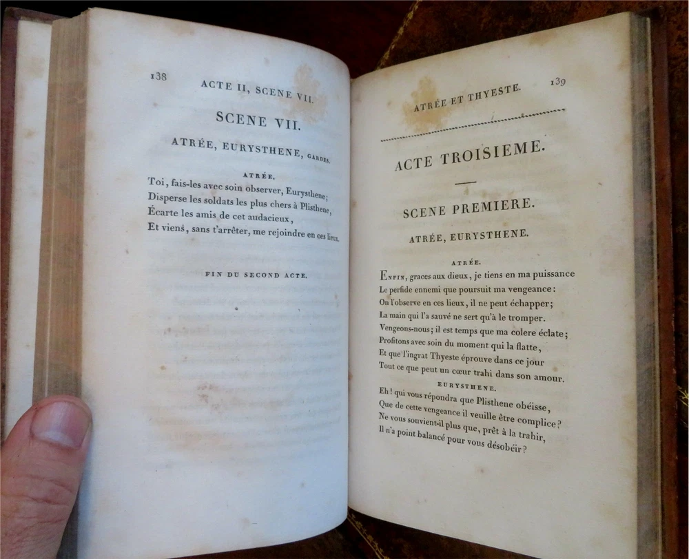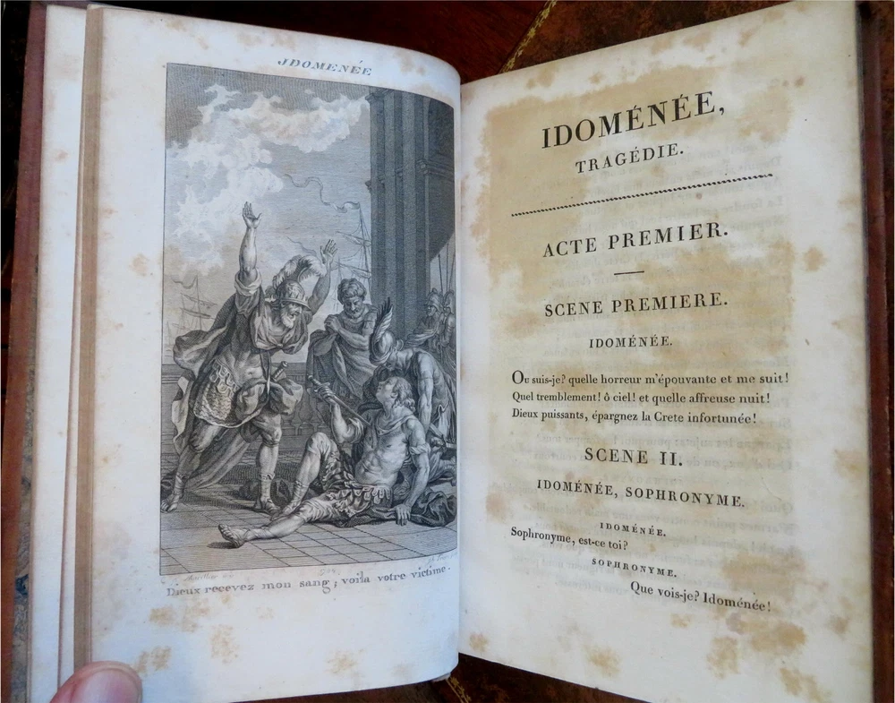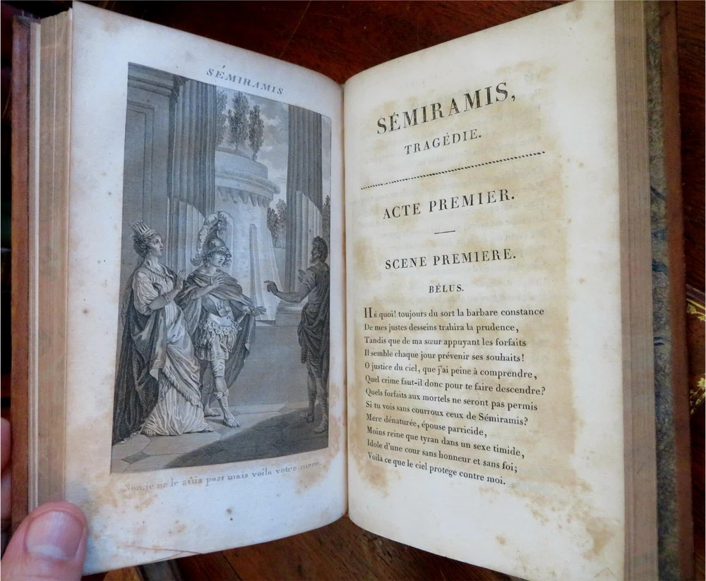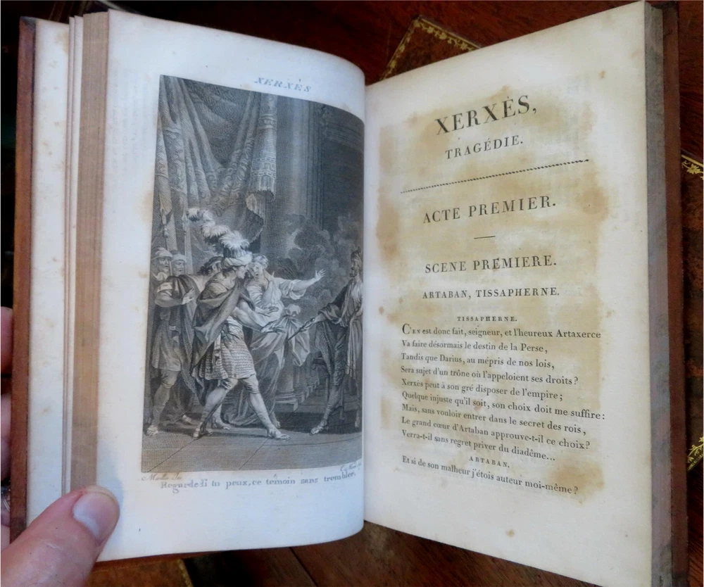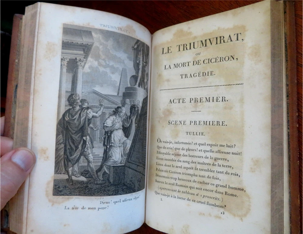 Claude de Crebillon Collected Works 1812 leather French 3 v. set Chippendale Claude de Crebillon Collected Works 1812 leather French 3 v. set Chippendale (Old Books, 19th Century Books, Leather Books, French Books, Claude de Crebillon, French Lit.). Ouvres de Crebillon. Published 1812, Paris by P. Didot. 3 volumes, each c. 275 pages. Text in French. Chippendale style bindings. Total of nine engraved plates within. Lovely early 19th century antiquarian full tree French leather bindings, smooth spines, gilt title lettering on contrasting red leather labels, gilt compartment decorations, gilt ruled covers, marbled edges and end papers. Set is physically old and shows some signs of handling and time. Bindings gently age worn but still appealing, leather and joints scuffed or rubbed but still supple, set remains overall very attractive as an object. Text block paper is well to in spots heavily age toned as typical, internally set remains mostly clean, tight and sound. A set which has been taken care of but may/ does not look like new. Still attractive on the shelf. Set displays a pleasing and unique age patina and is in rather nice antiquarian condition, any age flaws seem easy to overlook or forgive. Please review photos for more detailed attempt to present this set as it survives. We often over-describe any flaws that many sellers would not even bother to mention since most people would overlook them as minor and unworthy of comment. Many people tell us the books they receive from us are nicer in person than they appears on the screen. We want you to be clear about what you are buying, so we take numerous photos and try to describe it openly and honestly. Books Measure c. 7 3/4" H x 5" W. [B7020].