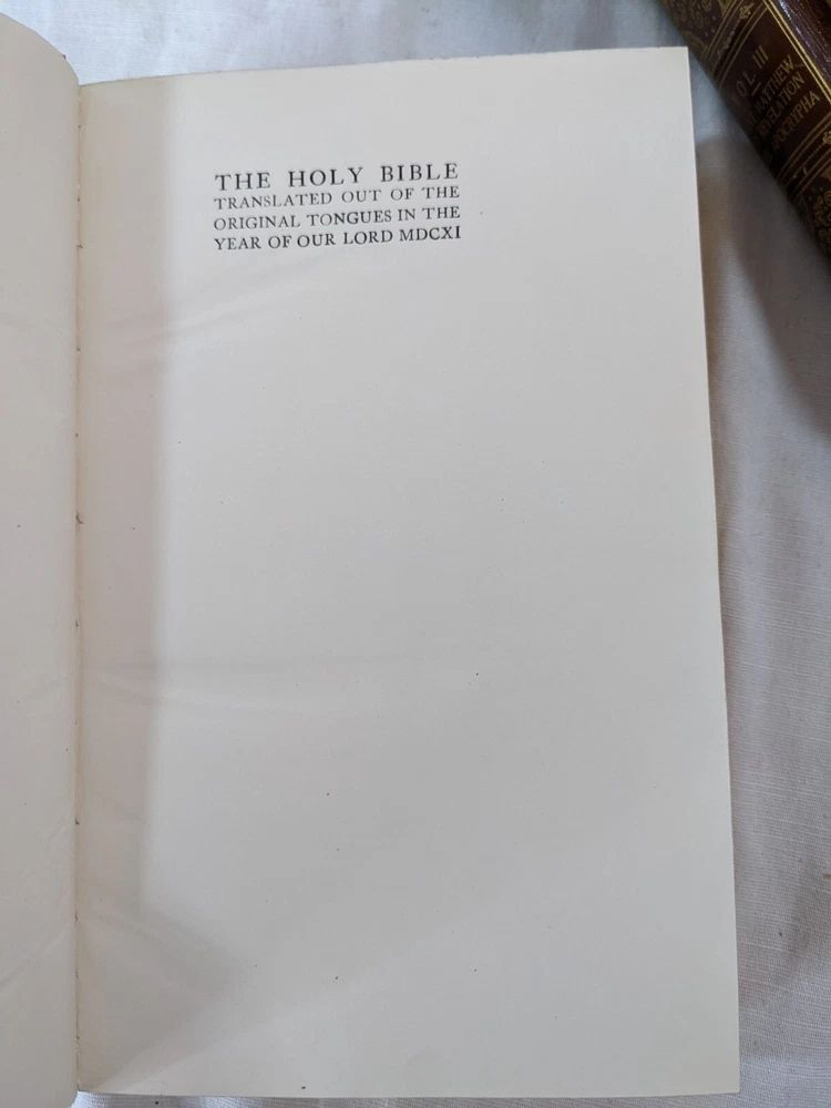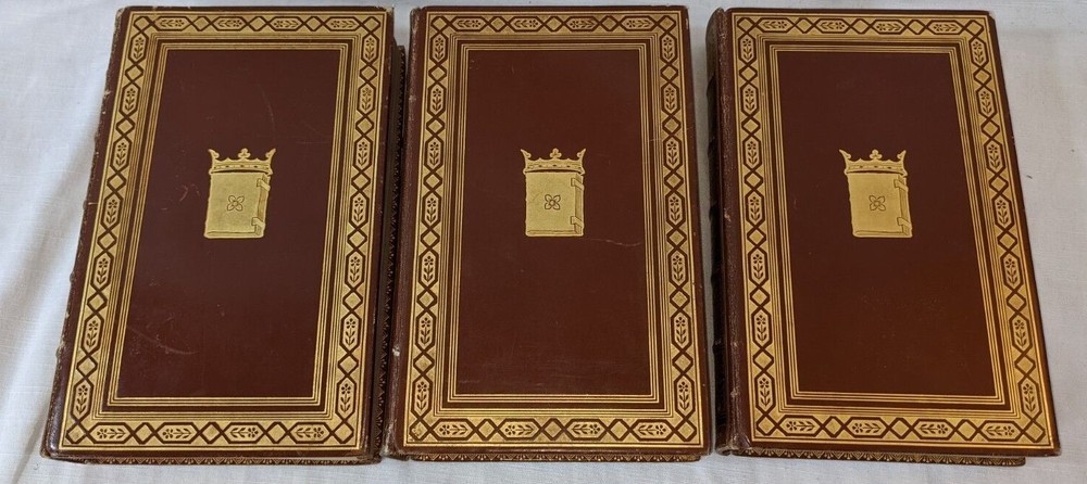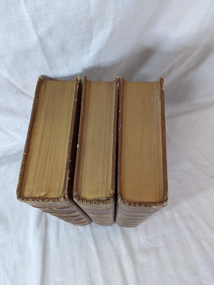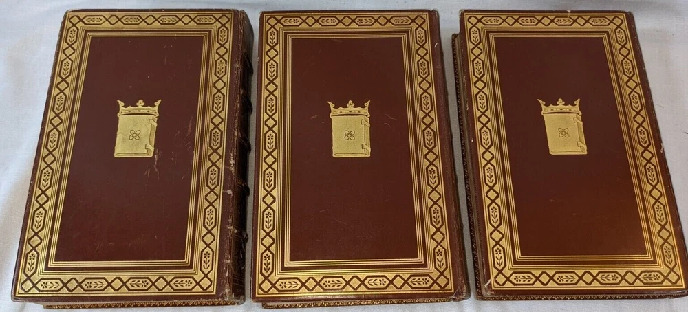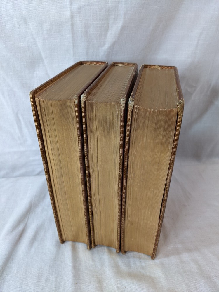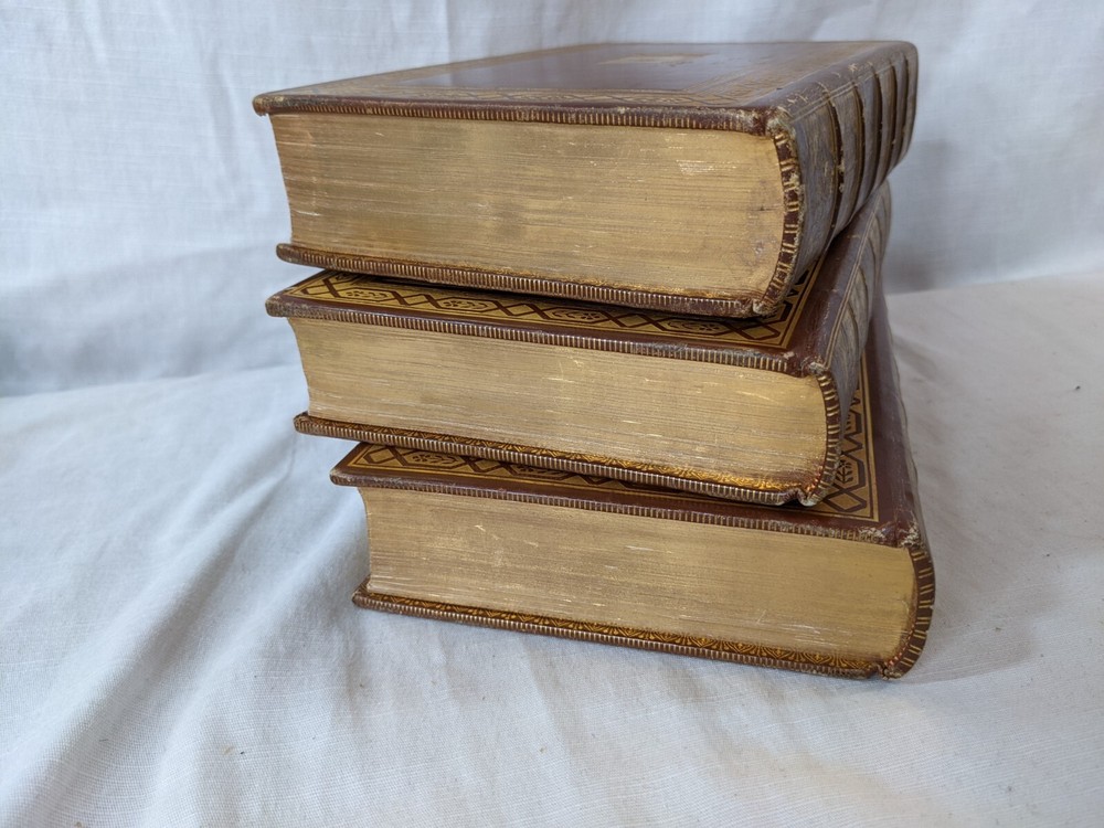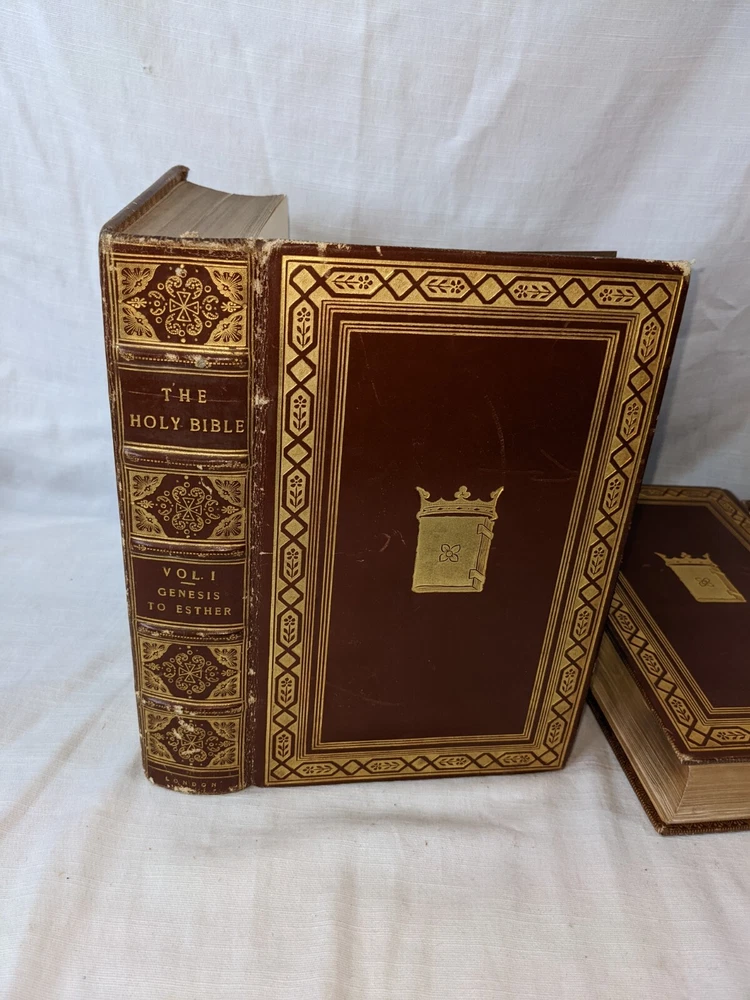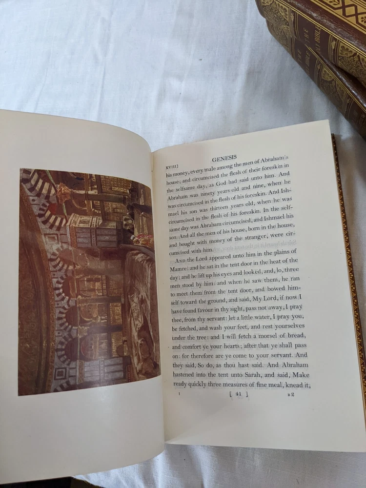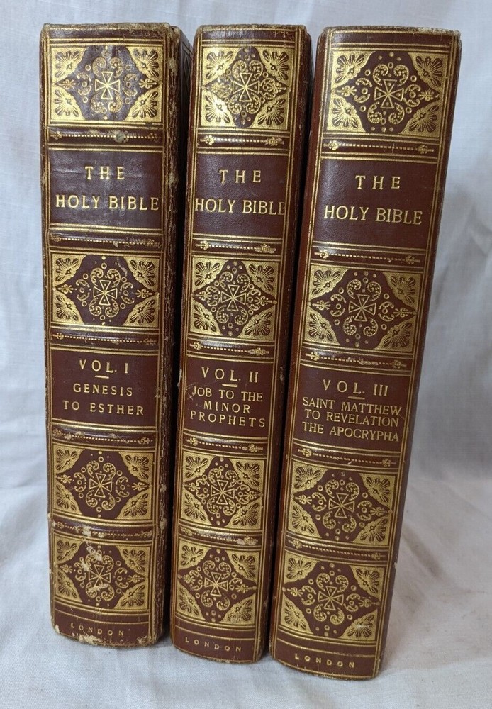 Complete in three volumes, Illustrated Holy Bible & Apocrypha by Ballantyne Press in full gilt decorated red-brown leather. A handsome set with appealing spine and cover work; spines have five hubs/six compartments and is decorated with filigree; title and volume number/description easy to read. Bottom compartment reads "London". Over 100 color plates. Undated but sources suggest this was in publication in 1911. Good overall condition as shown - photos are of the exact set available for sale. Some wear to leather covers including some scratches and scuffs and wear at edges/corners. Creasing at hinges but fully intact, leather still workable. Gilt page edges all around, a little bit dulled but still nice color, especially at bottom. Binding is mostly good, books have breakages at the fly leaf page from the rest of the pages (see example in 9th photo). Book 1 is inscribed to original owner and dated (difficult to read but I believe it says 1918 or 1928). There are small remnants of silk bookmarks at the top of each volume but the markers have all fallen out from wear.