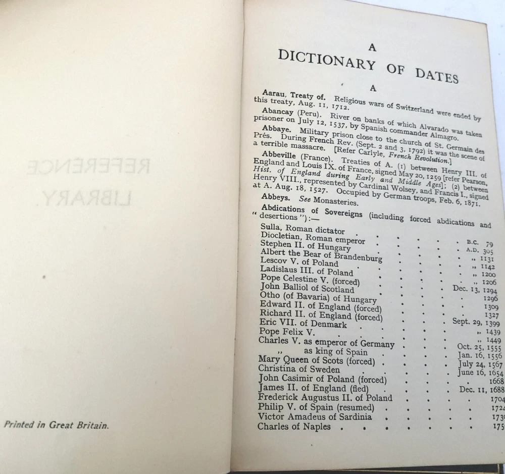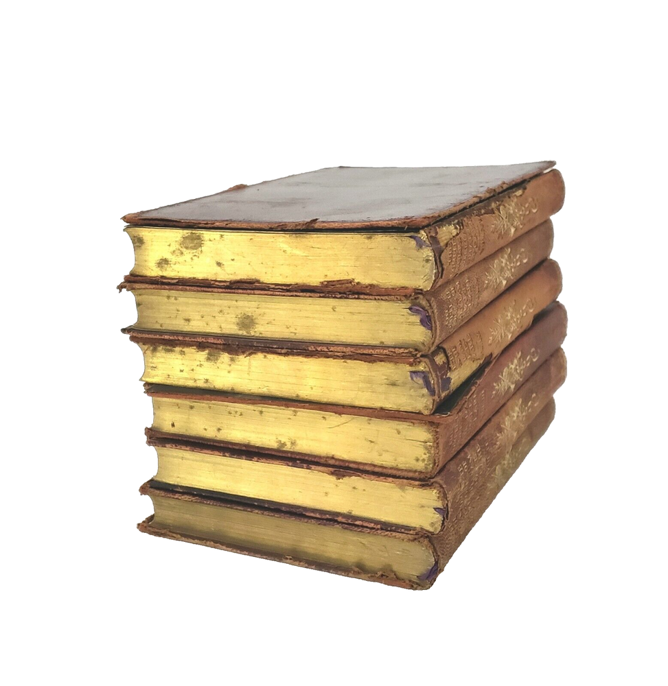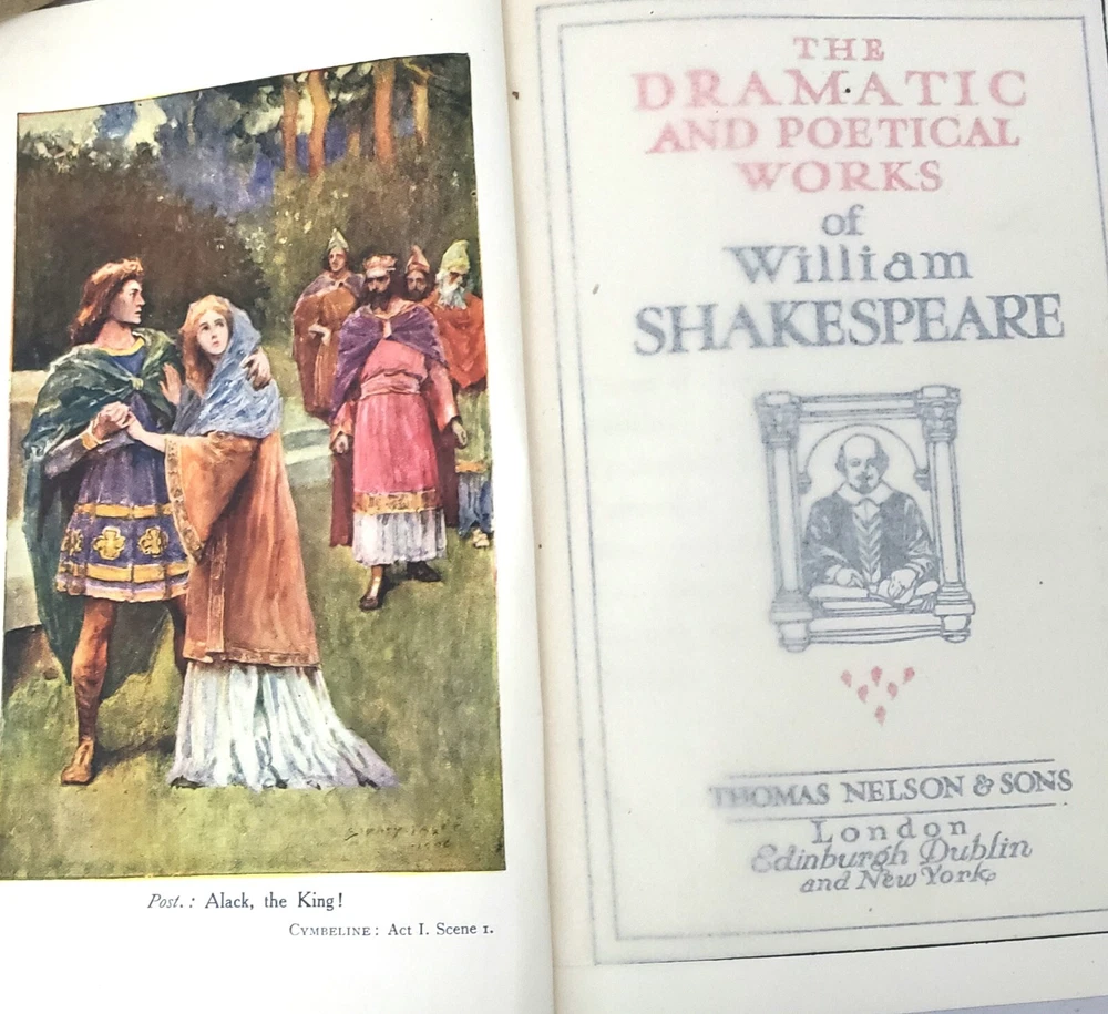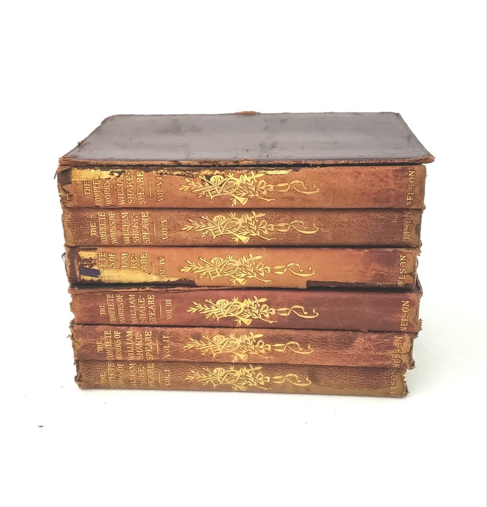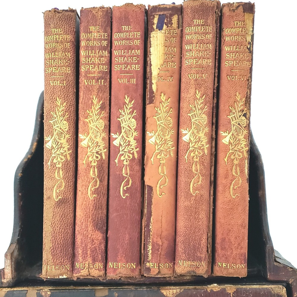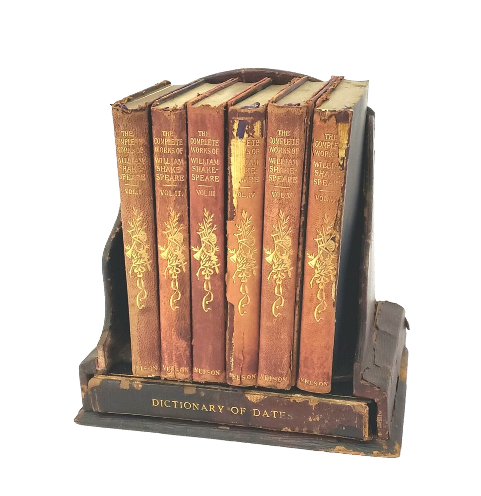 Complete Works of William Shakespeare 6 Vol. Set with Dictionary of Dates Book and Original Stand Production Description: An extraordinary burgundy, leather bound six volume set with decorative gold gilt spine of “The Complete Works of William Shakespeare" published by Thomas Nelson & Sons, London Edinburgh Dublin and New York. Included with this set is a scarce 328 page "Dictionary of Dates”. It sits horizontally in the bottom portion of the stand where the Shakespeare volume set displays vertically. Its rare to come by sets similar to this one with Dictionary of Dates and stand. The six volume set totals over 3,465 pages of reading in addition to the dictionary of dates totaling of 328 pages. Its early and a bit rough but such a unique find to locate this type of set. Circa: Unconfirmed. No publish date. Believed to be late 1800s - Early 1900s Dimensions: 6 ½” x 4 ¼” Product Weight: 4 pounds 9 ounces Origin: Stand: Made in England, Shakespeare Set: Printed in Great Britain Material: Leather, Paper, other Publisher : Thomas Nelson & Sons, London Edinburgh Dublin and New York Language : English Special Markings: “Dictionary of Dates”: Printed on the bottom of the first page is "Printed in Great Britain". Printed on the bottom of last page, "Printed By The Temple Press at Letchworth in Great Britain". ~ Stand: Stamped "Cross London Made in England". Condition: Previously owned - used. Condition is consistent with age and use. Stand is in fair to poor condition with surface wear, although still usable. Dictionary of Dates: Front and back cover are "detached" (although still included), with soiled edges. Contents are in good condition. The Complete Works of William Shakespeare: Set is in fair condition with exception of volume VI which the front cover is detached and volume IV, the back cover has detached. Interior of all books are in good, readable condition although binding on all have wear and some issues (as shown). Name written in pencil on inside blank page cover of volume IV and has a loose back binding. Please review the photographs as they are part of the description. Please refer to photographs. Shipping: Free Shipping Usually ships within one business day Ships only to the 48 contiguous states DISCLAIMER: Every attempt is made to research thoroughly, take clear photos and accurately describe each product being sold on this website. Most product is acquired from auctions and estate sales. Prior to being offered, all product is carefully examined. With this said, any chips, cracks, repairs or modifications known will be disclosed. Not being experts on all product being sold, there is no guarantee of accuracy or completeness. Unless specified otherwise, all product is being sold as “used” not new. With respect to the nature of the product, no warranty or guarantee of any kind is provided for the longevity of any item being purchased. For additional information please refer to the Return Policy section. Any manufacture’s names, numbers, symbols or description is to be used for reference purposes only and does not imply that there is any representation of those items. By making a purchase from this store, you understand and agree to these conditions.