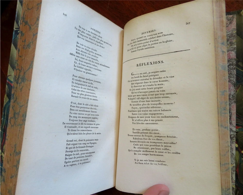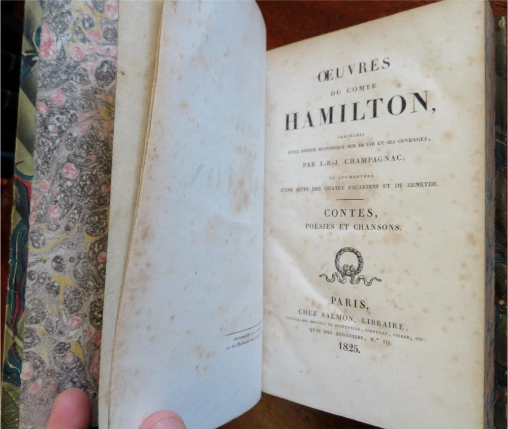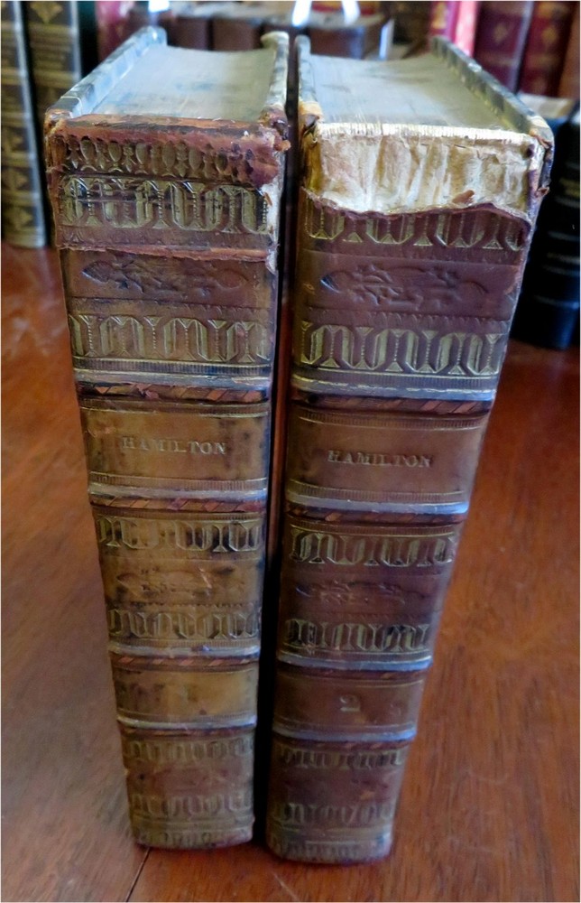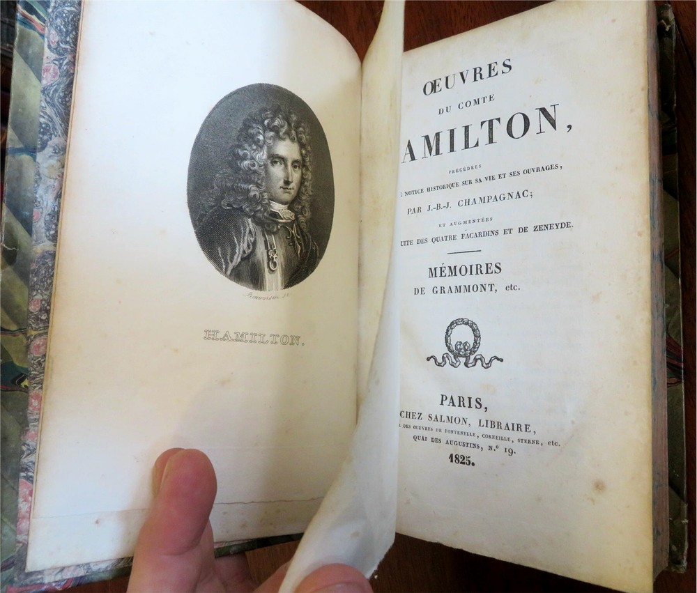 Comte Hamilton Collected Works 1825 French rare leather 2 vol. set Comte Hamilton Collected Works 1825 French rare leather 2 vol. set (Old Books, 19th Century Books, Leather Books, French Literature). Oeuvres du Comte Hamilton. Published 1825, Paris by Salmon. 2 volumes. 546, 584 pages. Text in French. Attractive antiquarian 1/4 leather bindings, raised bands, gilt title lettering & compartment decorations. Set is physically old and shows some signs of handling and time. Bindings gently age worn but still appealing, leather and joints scuffed but still supple, chipping at spine heads as seen, set remains overall very attractive as an object. Text block paper is gently age toned as typical, internally set remains mostly clean, tight and sound. A set which has been taken care of but may/ does not look like new. Still attractive on the shelf. Set displays a pleasing and unique age patina and is in rather nice antiquarian condition, any age flaws seem easy to overlook or forgive. Please review photos for more detailed attempt to present this uncommon early 19th century European set as it survives. We often over-describe any flaws that many sellers would not even bother to mention since most people would overlook them as minor and unworthy of comment. Many people tell us the books they receive from us are nicer in person than it appears on the screen. We want you to be clear about what you are buying, so we take clear photos and try to describe it clearly. Books Measure c. 8 1/2" H x 5 1/4" W. [B5168].