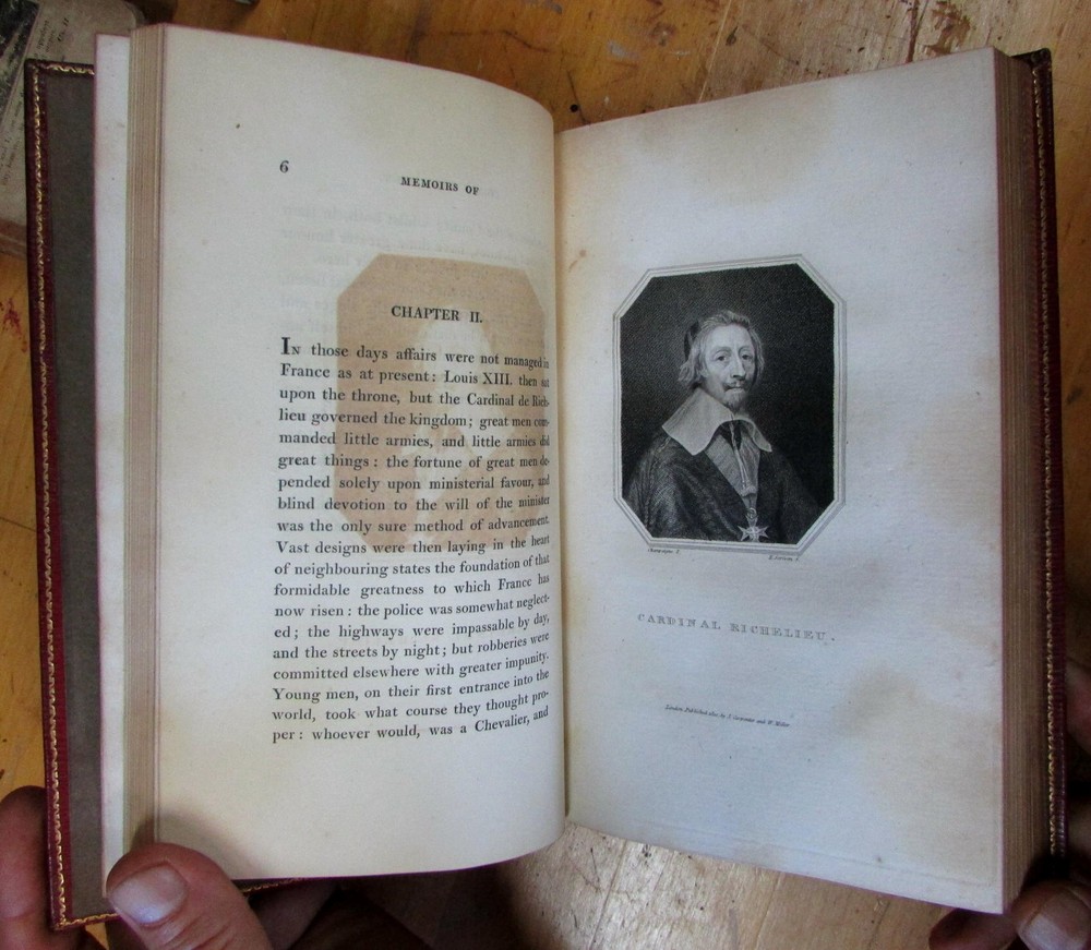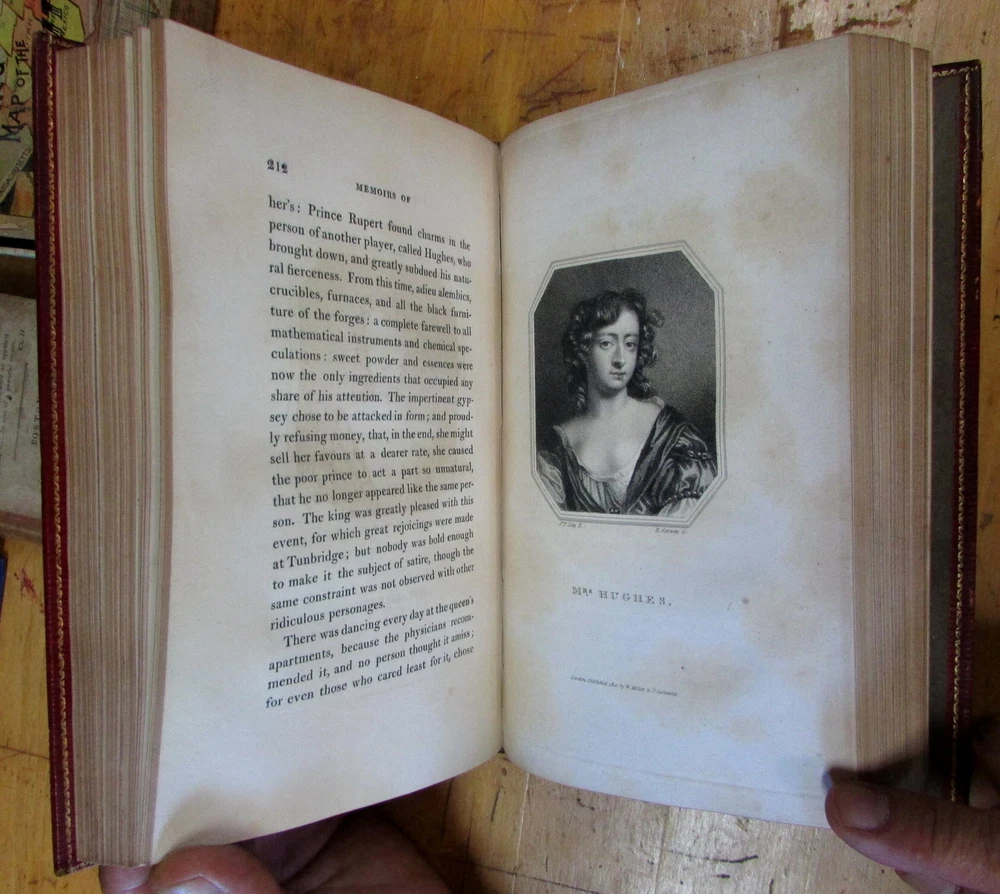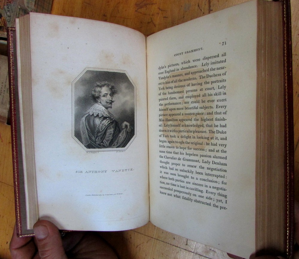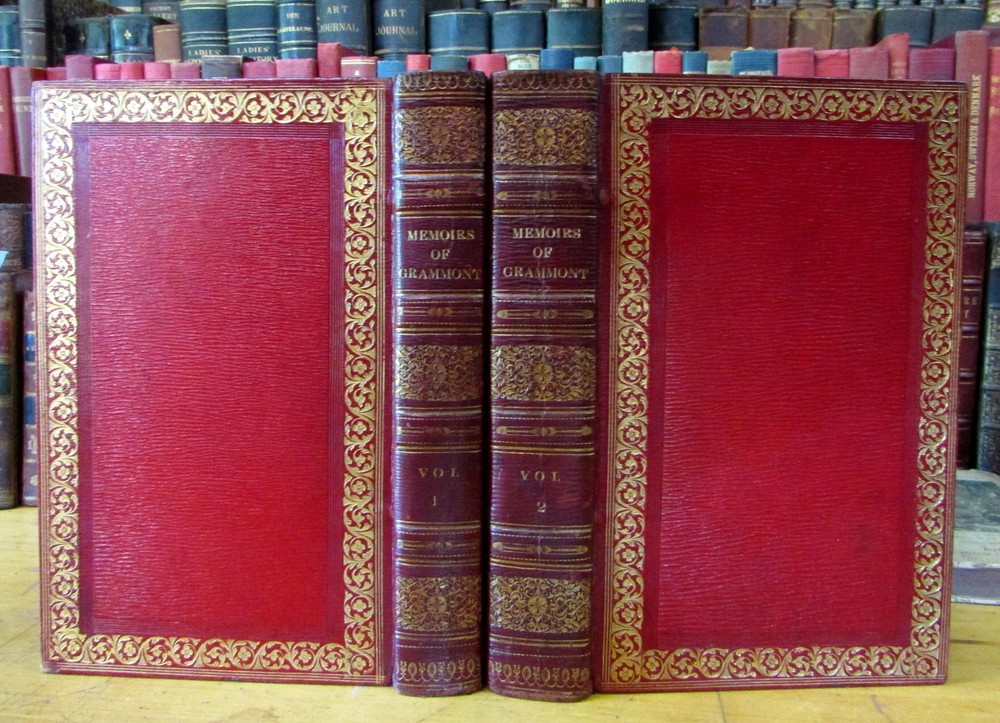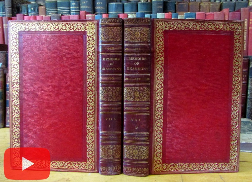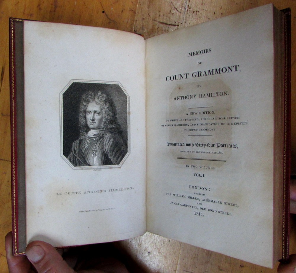 Count Grammont Memoirs 1811 gorgeous morocco leather set book 64 portrait plates Count Grammont Memoirs 1811 gorgeous morocco leather set book 64 portrait plates Click here to view a short video presentation. Short video captures condition much better than words. Please watch prior to purchase to ensure a clear understanding of the set. Memoirs of Count Grammont, in Two Volumes , by Anthony Hamilton. 1811, London , William Miller and James Carpenter. Illustrated with Sixty-four portraits (all steel engraved) , mostly in stipple. Gorgeous 19th century grained morocco leather bindings. Raised bands, spines richly decorated, covers beautifully outlined in floral running scroll set within rules, turn-ins and edges gilt decorated. All edges gilt. Profusion of excellent, very well done (stipple) engraved portraits, all signed by the engraver Edward Scriven (and others) in the plates. Beautiful age patina and shelf appearance. Light scuffing to joints and edges, light to moderate scattered toning and spotting throughout. Wonderful unique portrait plate set, any age flaws or small condition issues easy to overlook or forgive. Books measure: 9" H X 5 1/2" W. Set along shelf measures: 3". [V1474].
