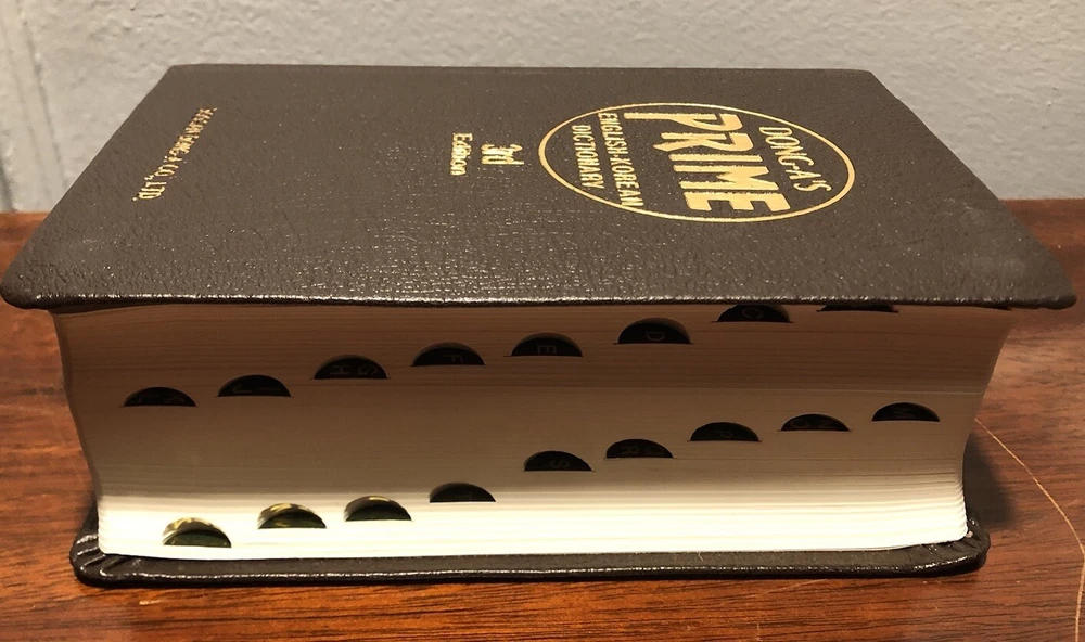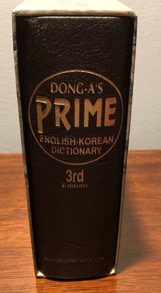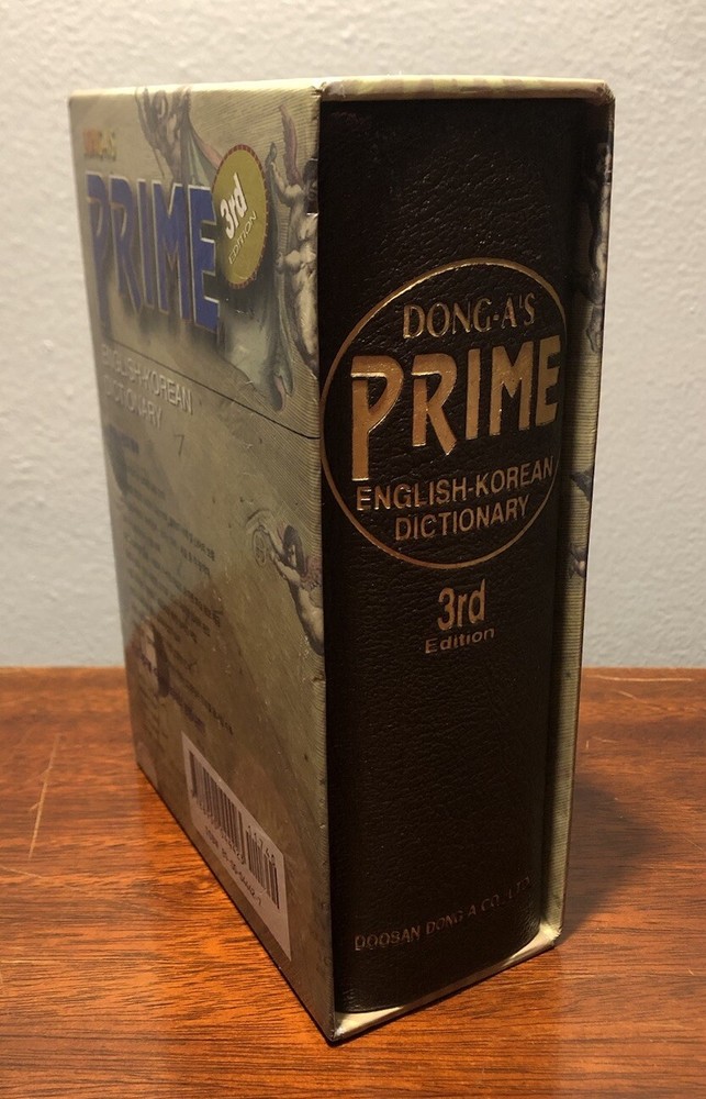 Dong-A’s Prime English-Korean Dictionary 3rd Ed. 1993. Bonded leather cover in slipcase. No writing, inscriptions or folded pages. Please see photos of this very good preowned volume. Ships from smoke...