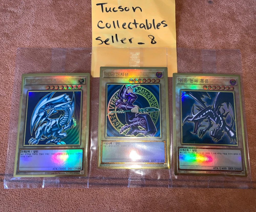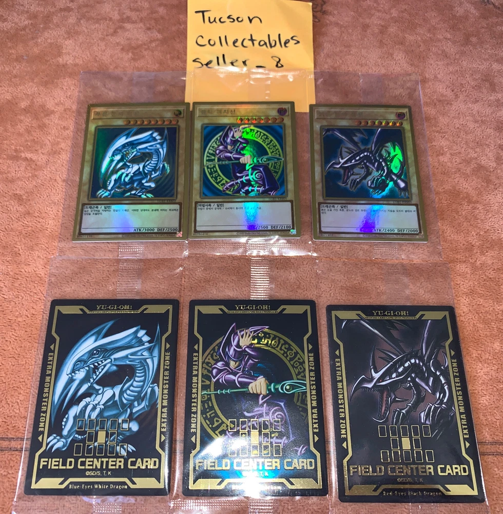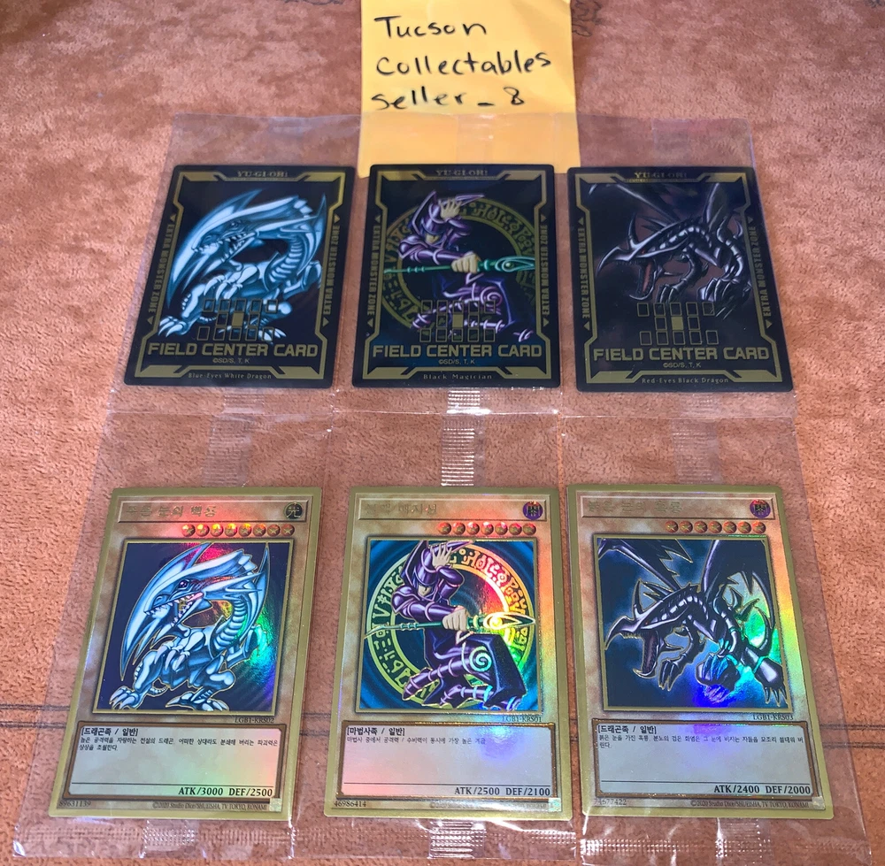 Dark Magician Blue-Eyes White Red-Eyes B. Dragon Premium / Maximum Gold Yugioh Korean OCG Set. Condition is "New". Shipped with USPS First Class. YOU WILL BE RECEIVING 6 TOTAL CARDS (ALL FACTORY SEALED): Blue-Eyes White Dragon (Premium Gold Rarity) - Sealed/New Blue-Eyes White Dragon (Field Center Card) - Sealed/New Dark Magician (Premium Gold Rarity) - Sealed/New Dark Magician (Field Center Card) - Sealed/New Red-Eyes Black Dragon (Premium Gold Rarity) - Sealed/New Red-Eyes Black Dragon (Field Center Card) - Sealed/New Please feel free to ask any questions if uncertain about anything. Thanks for looking!