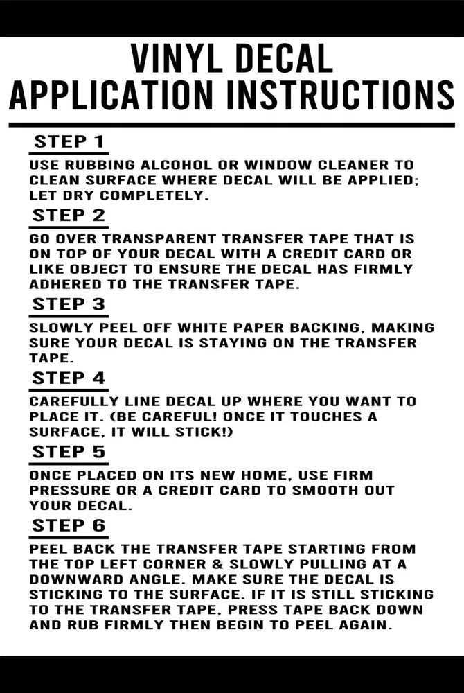 We are a small family owned business located in Iowa. In business for 25 years and over 100,000 items sold on eBay alone. We focus on quality made decals, all made after you've ordered to keep the highest quality possible. We also believe in going above and beyond for our customers, our feedback and years in business speaks for itself. You may see many of our designs for sale that were stolen from us by other sellers, they may even be selling them for less that ours but we stand behind our pricing and our products. Message us about custom orders Die cut vinyl decals made with premium Starcraft HD Vinyl Lasts 5-7 years outdoors. Choose from 47 color options and 5 sizes Easy application, instructions and application tool included Sticks to any smooth surface Glass, Plastic, Walls, Phones, Laptops Great for cars, trucks, boats, with many other applications Size & Color Vinyl will be no larger on any side than the size you choose If you choose 6" size either the height or width will be 6" depending on the longest side of the design. All decal designs are different and most are either wider or taller. A decal can only be the same dimension on both sides if it is a square. For example if you want an 8? decal imagine an 8? circle, your decal will fit inside that circle If you need a specific size just let us know Images can be reversed upon request If you have a specific image you would like done, please feel free to send me a message. Colors may vary slightly from pictured The color you choose will be the color of the actual vinyl sticker When choosing a color you are changing the black part of the image. There will be no background, the background becomes whatever you stick it to Application Please read the included instructions before application If unsure at any point do not hesitate to ask questions. There are also tons of Youtube videos available with application instructions and tips During colder weather it is strongly recommended that you let the decal come to room temperature before application Patience is key when applying a decal, take your time Returns Returns will not be accepted because of failed application. Please review instructions before application. If your decal is damaged in transit it may be replaced Shipping Everything is cut to order and may have a 3 day handling time. Shipping includes Ebay standard Tracking Upgrade to 2-3 day Priority Mail for $7.50 All orders over $12 come with free shipping If you have any questions or issues please feel free to send us a message. Our first priority is making sure you as the customer is happy Thanks for looking!
