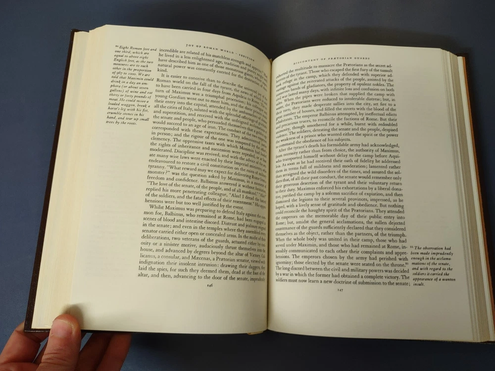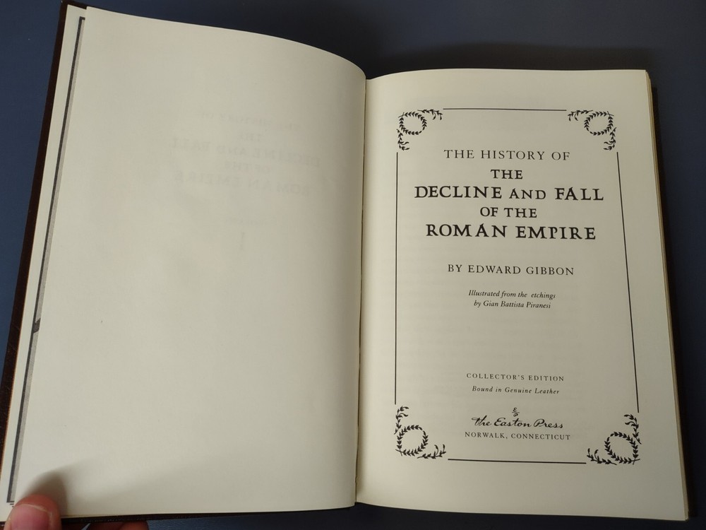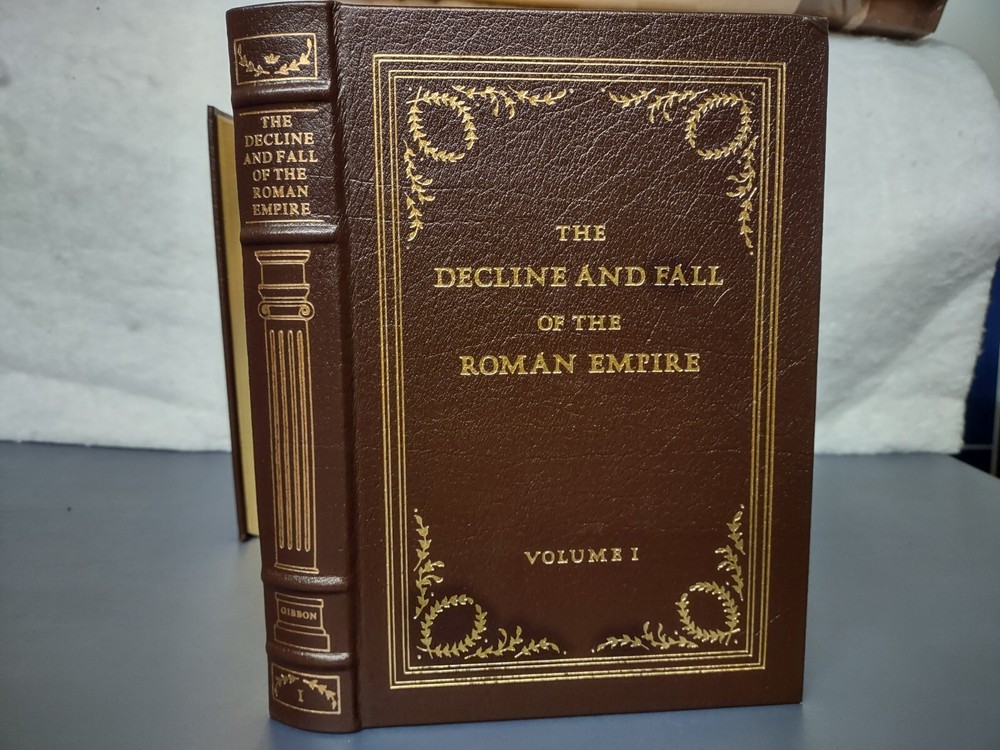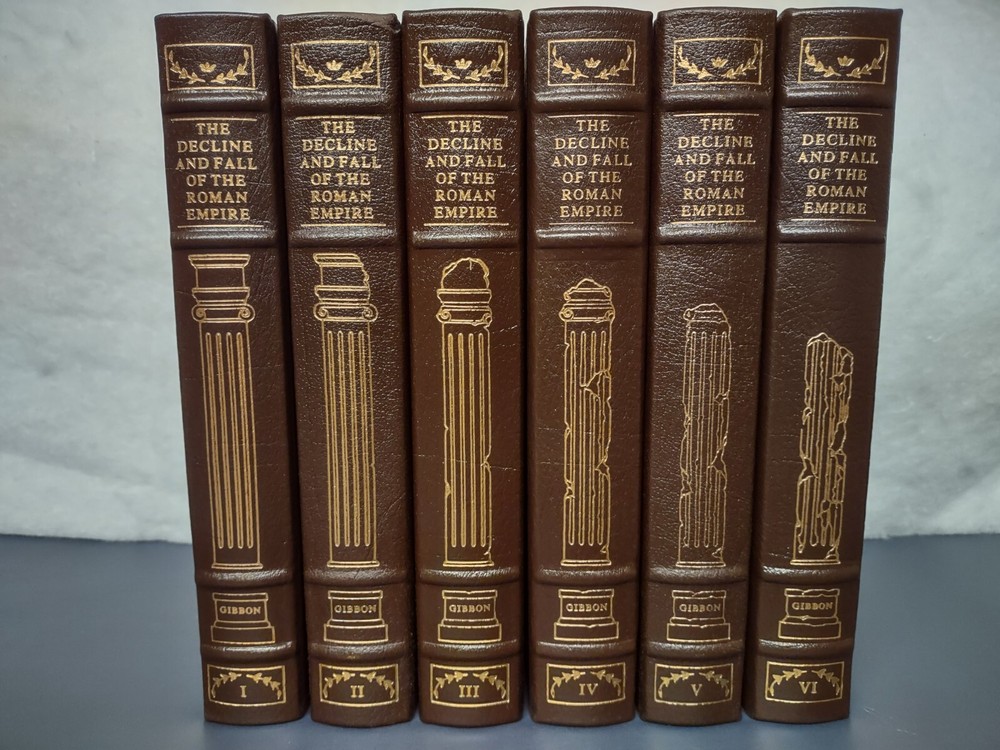 Up for auction is the rare 6 volume complete set of the collector's edition from Easton Press of Edward Gibbon's "The Decline and Fall of the Roman Empire". The books are bound in leather and the language is English. The set delves into the history of the Roman Empire, making it a valuable addition to any history enthusiast's collection. Perhaps the greatest, most critically acclaimed history of the Roman Empire ever written. With its rich insights and detailed narrative, this set is sure to be a prized possession for anyone interested in the fall of the Roman Empire.