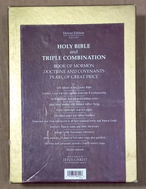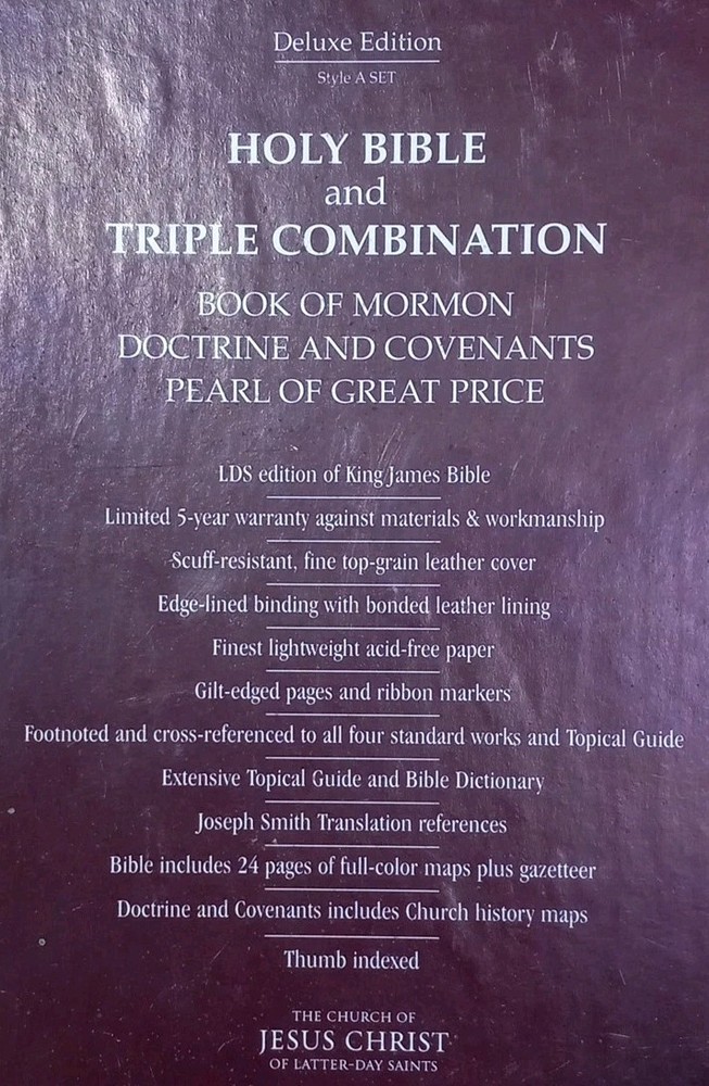 The Deluxe Edition LDS Holy Bible & Triple Combo Leather Bound Two Book Set is a special edition religious book set that includes the Book of Mormon, Doctrine and Covenants, Pearl of Great Price. The set is sealed and features a leather-bound format, making it a durable and high-quality addition to any religious library. With a focus on topics related to LDS/Mormons, this informative book set is suitable for young adults, ages 9-12, and adults alike, providing a deeper understanding of religious and spiritual teachings. * LDS Edition of King James Bible * Scuff-resistant fine top-grain leather cover * Edge lined binding with bonded leather lining * Finest lightweight acid-free paper * Guilt-edged pages and ribbon markers * Footnoted and cross-referenced to all four standard works and topical guide * Extensive topical guide and Bible dictionary * Joseph Smith translation references * Bible includes 24 pages of full-color Maps Plus gazetteer * Doctrine and Covenants includes church history maps * Thumb indexed * Box is a bit shelf worn but books are factory sealed Shipped USPS Media Mail