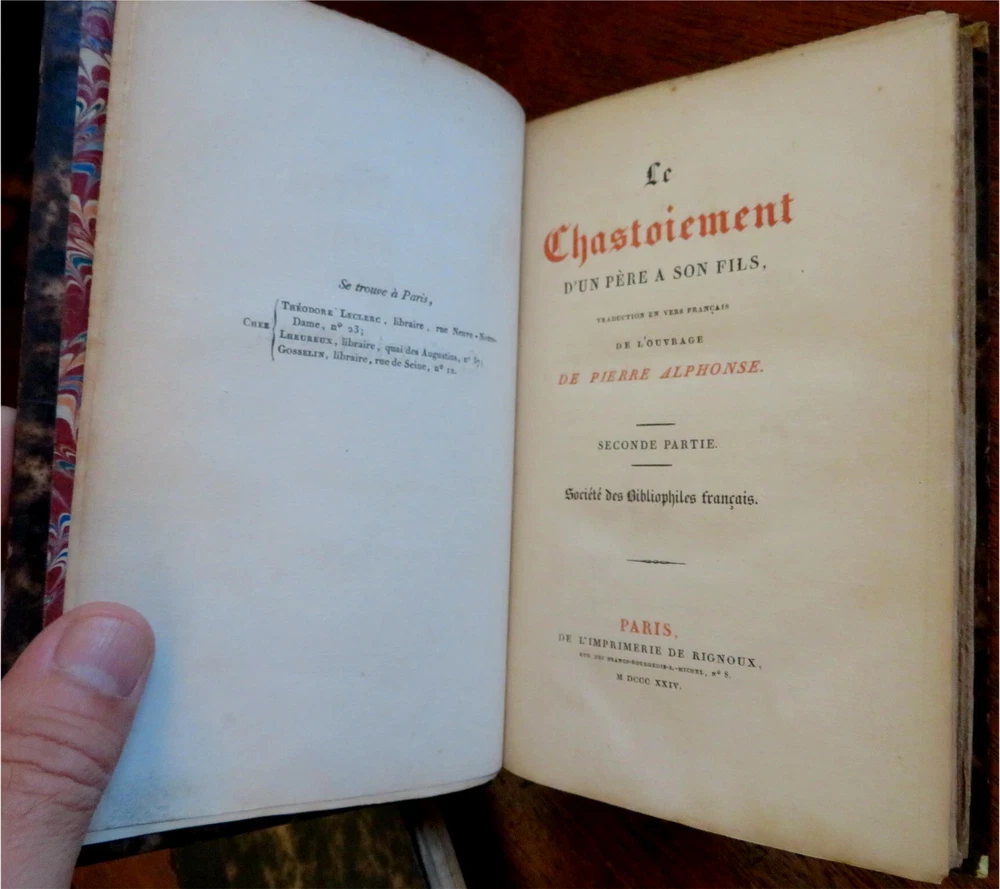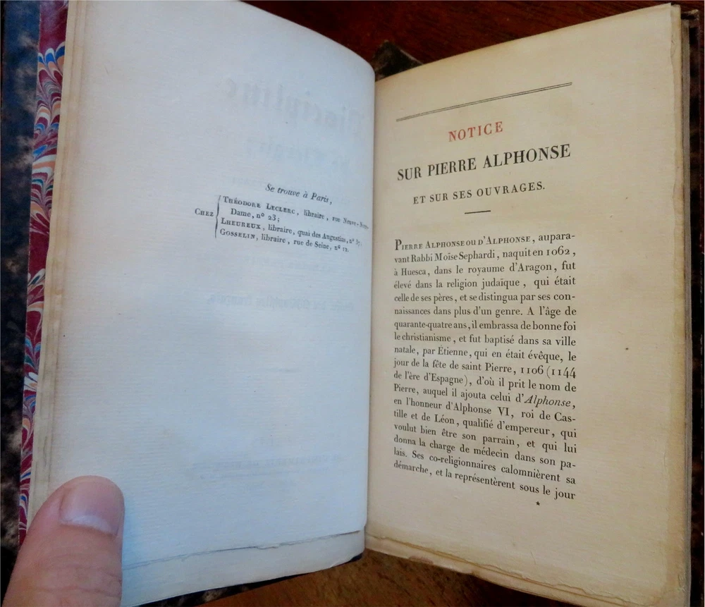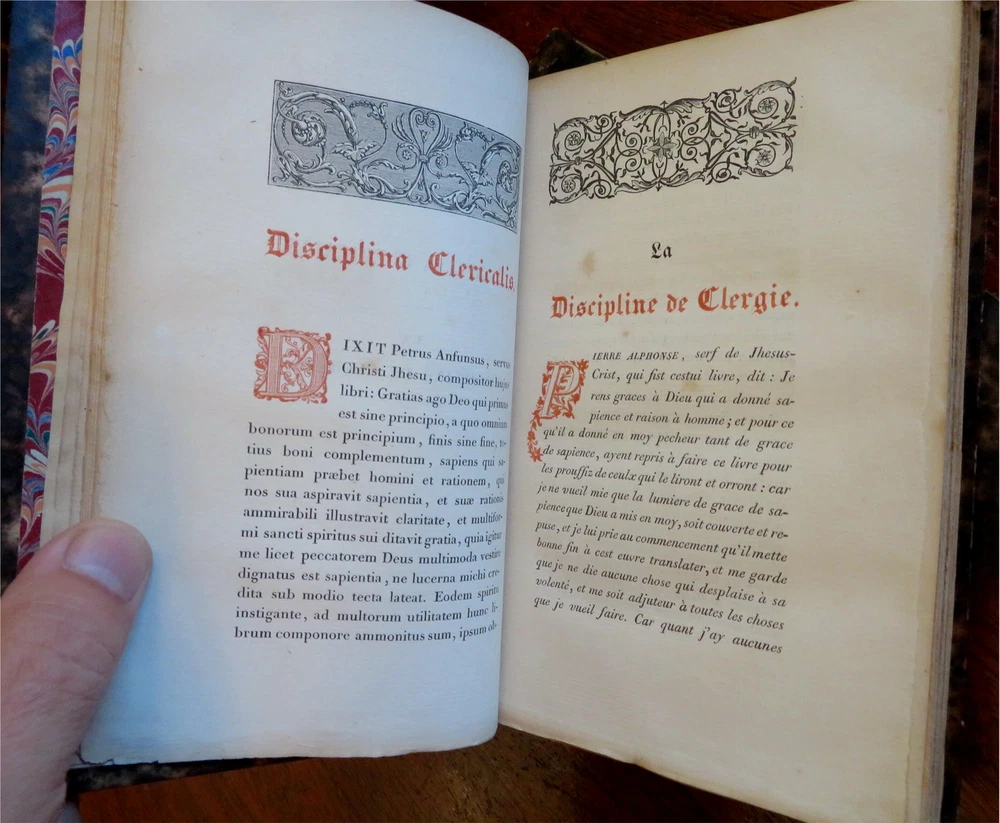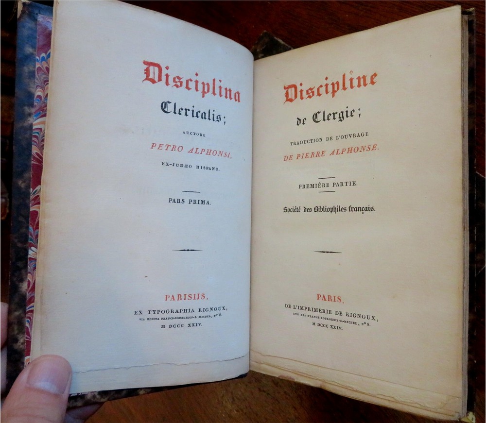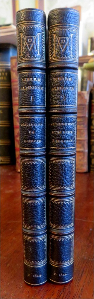 Discipline of Clergy 1824 Alphonse fine Bibliophile Society 2 vol. leather set Discipline of Clergy 1824 Alphonse fine Bibliophile Society 2 vol. leather set (Old Books, 19th Century Books, Leather Books, French Books, Latin Books, Religion, Christianity, Catholicism). Discipline de Clergie; Traduction de L'Ouvrage de Pierre Alphones. "Societe des Bibliophiles francais". Published 1824, Paris by Rignoux. 2 volumes. 208, 240 pages. Text in French & Latin. A fine set. Attractive antiquarian 1/4 grained leather bindings, raised bands, gilt title lettering & compartment decorations, marbled covers & end papers, deckled edges, hand made paper. Set is physically old and shows some signs of handling and time. Bindings gently age worn but still appealing, leather and joints slightly rubbed but still supple, set remains overall very attractive as an object. Text block paper is gently age toned as typical, internally set remains mostly clean, tight and sound. A set which has been taken care of but may/ does not look like new. Still attractive on the shelf. Set displays a pleasing and unique age patina and is in rather nice antiquarian condition, any age flaws seem easy to overlook or forgive. Please review photos for more detailed attempt to present this set as it survives. We often over-describe any flaws that many sellers would not even bother to mention since most people would overlook them as minor and unworthy of comment. Many people tell us the books they receive from us are nicer in person than they appears on the screen. We want you to be clear about what you are buying, so we take numerous photos and try to describe it openly and honestly. Books Measure c. 7 1/2" H x 5" W. [B6977].