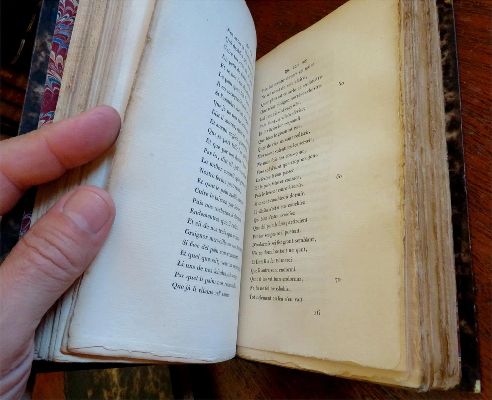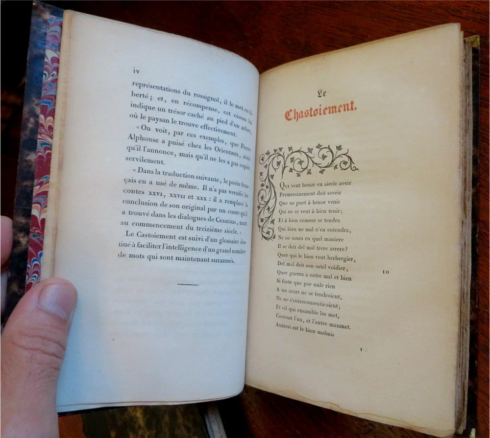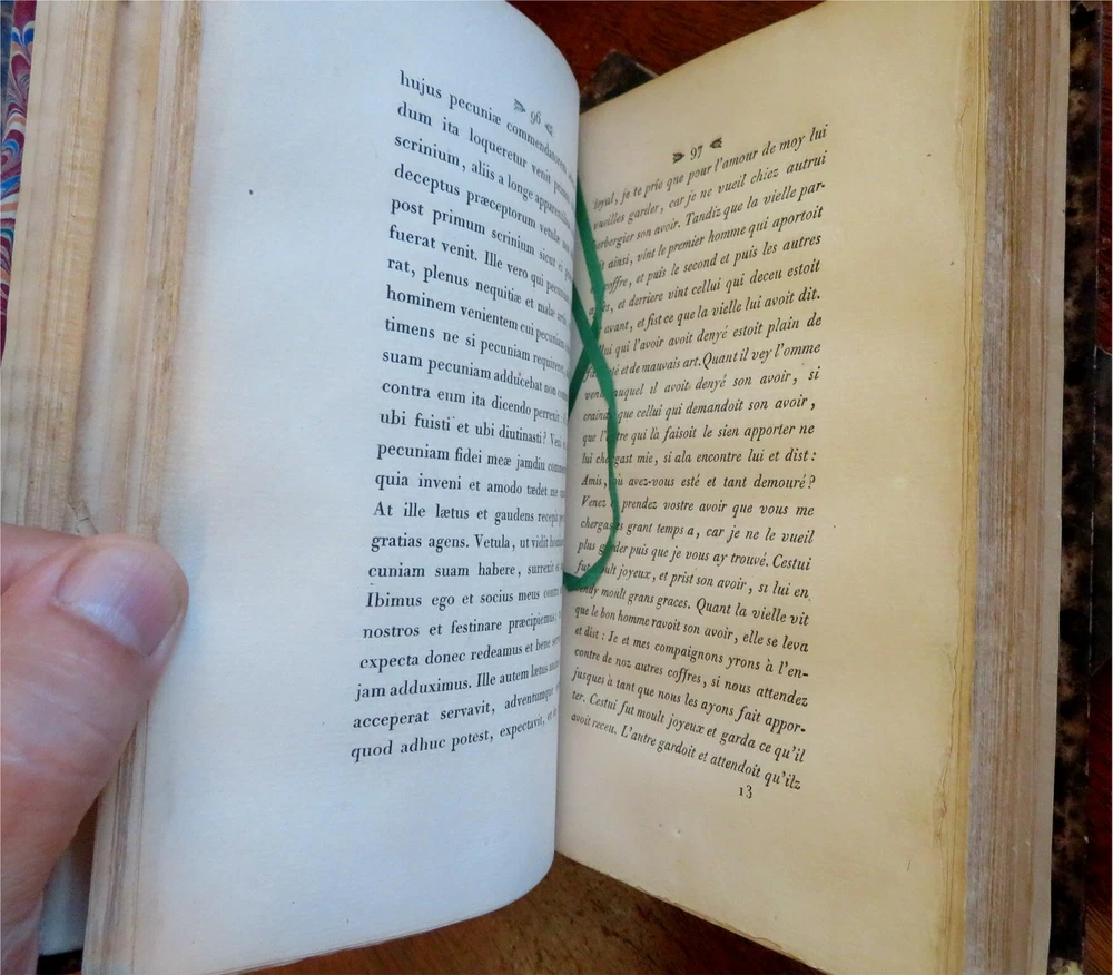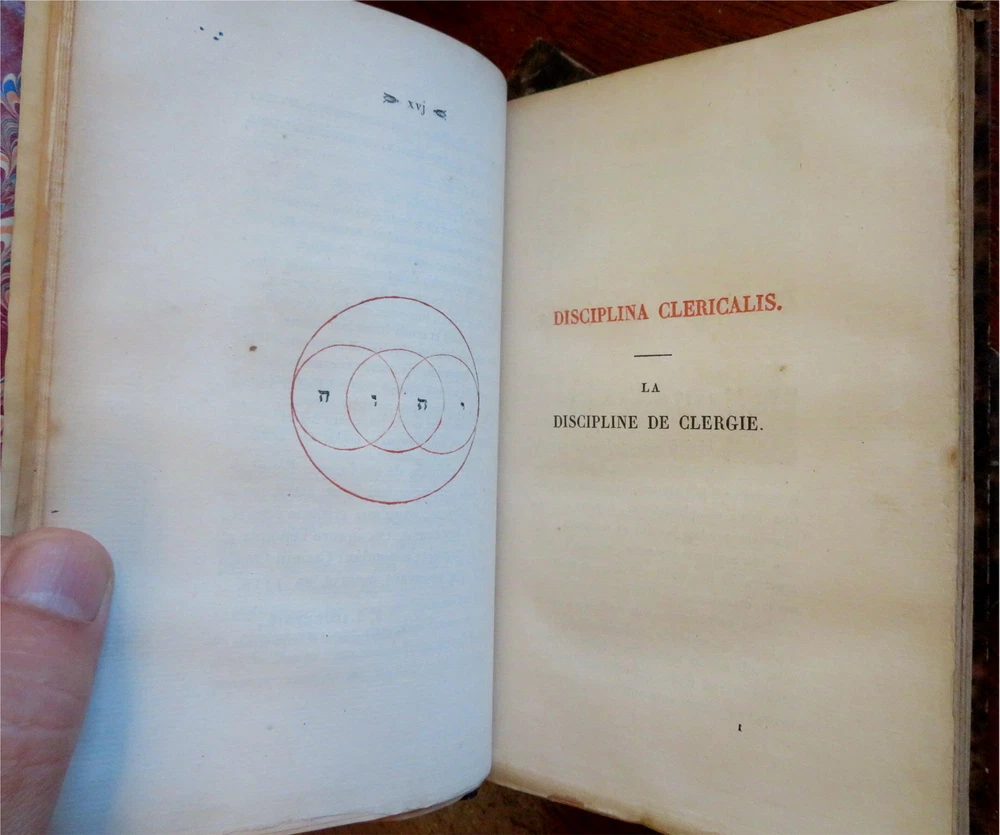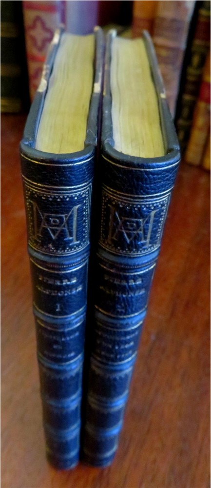 Discipline of Clergy 1824 Alphonse fine Bibliophile Society 2 vol. leather set Discipline of Clergy 1824 Alphonse fine Bibliophile Society 2 vol. leather set (Old Books, 19th Century Books, Leather Books, French Books, Latin Books, Religion, Christianity, Catholicism). Discipline de Clergie; Traduction de L'Ouvrage de Pierre Alphones. "Societe des Bibliophiles francais". Published 1824, Paris by Rignoux. 2 volumes. 208, 240 pages. Text in French & Latin. A fine set. Attractive antiquarian 1/4 grained leather bindings, raised bands, gilt title lettering & compartment decorations, marbled covers & end papers, deckled edges, hand made paper. Set is physically old and shows some signs of handling and time. Bindings gently age worn but still appealing, leather and joints slightly rubbed but still supple, set remains overall very attractive as an object. Text block paper is gently age toned as typical, internally set remains mostly clean, tight and sound. A set which has been taken care of but may/ does not look like new. Still attractive on the shelf. Set displays a pleasing and unique age patina and is in rather nice antiquarian condition, any age flaws seem easy to overlook or forgive. Please review photos for more detailed attempt to present this set as it survives. We often over-describe any flaws that many sellers would not even bother to mention since most people would overlook them as minor and unworthy of comment. Many people tell us the books they receive from us are nicer in person than they appears on the screen. We want you to be clear about what you are buying, so we take numerous photos and try to describe it openly and honestly. Books Measure c. 7 1/2" H x 5" W. [B6977].