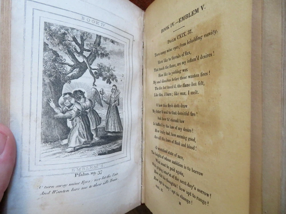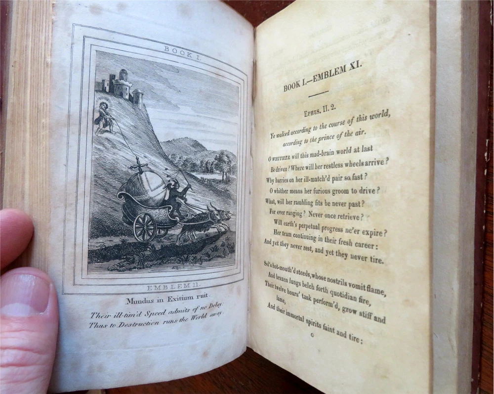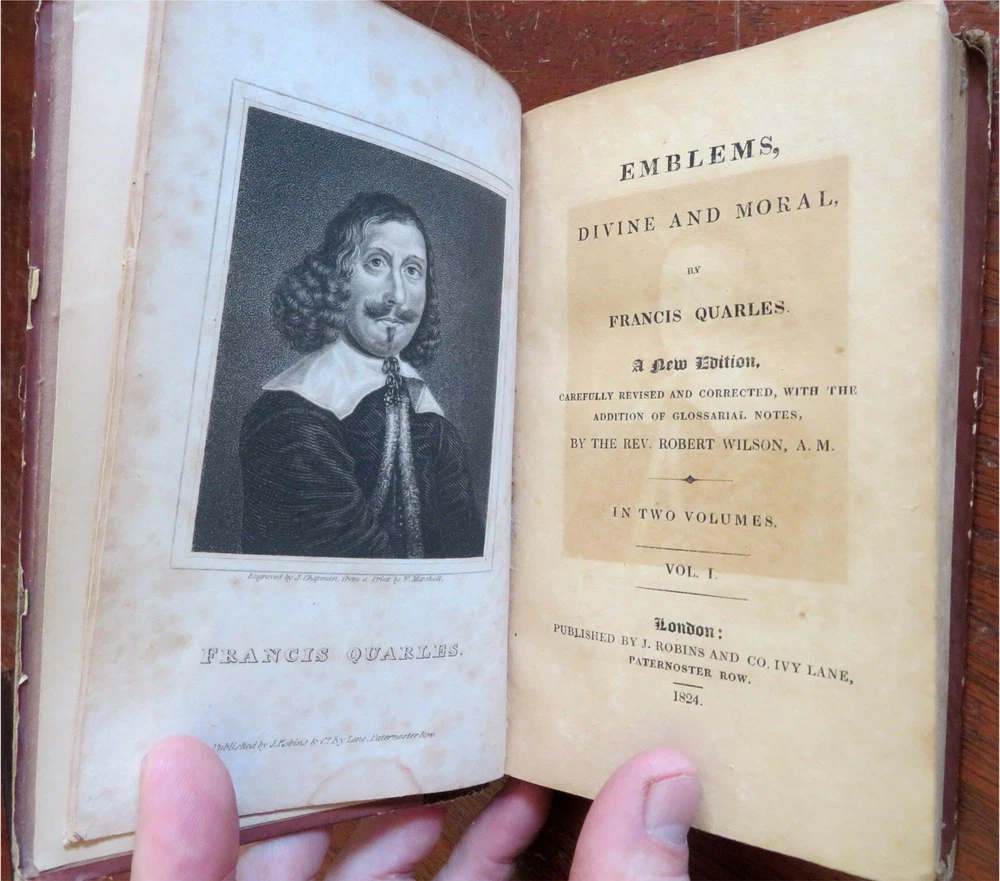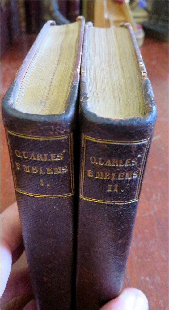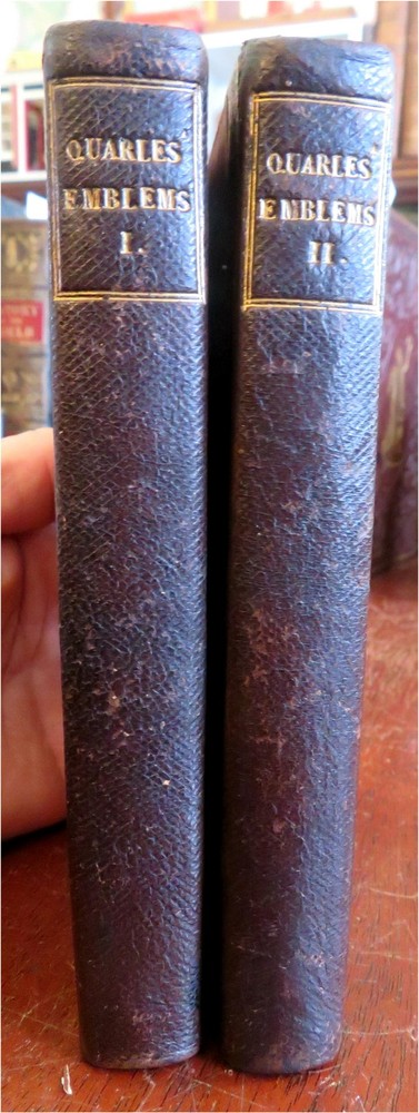 Divine & Moral Emblems 1824 Quarles illustrated 2 vol. leather set w/ 79 plates Divine & Moral Emblems 1824 Quarles illustrated 2 vol. leather set w/ 79 plates (Old Books, 19th Century Books, Leather Books, Illustrated Books, Emblems). Emblems, Divine and Moral, by Francis Quarles. Published 1824, London by J. Robins and Co. 2 volumes. 154, 155 pages. Text in English. Profusely illustrated throughout with 39 wonderful emblem plates in each volume, for a total of 78 emblems plus an engraved portrait (79 plates total).. Period 1/4 leather bindings, smooth spines, gilt title lettering, paper covered boards. Set is physically old and shows some signs of handling and time. Set is not new or in "new" condition. Bindings gently age worn but still appealing, leather rubbed but still supple, joints slightly scuffed, front cover of vol. 2 with a small scrape resulting in loss of paper and leather along the joint, set remains overall attractive as an object. All covers very strongly attached. Text block paper is gently toned, light foxing, offsetting to facing text leaves of engraved plates, final plates has a short closed edge tear (easy to miss or overlook), internally still well preserved, tight, sound. Still attractive on the shelf. Set displays a pleasing and unique age patina and is in nice antiquarian condition. A charming and uncommon set. Please review photos for more detail and our best attempt to convey how this set survives. Books Measures c. 6 1/2" H x 4" W. [B4605].