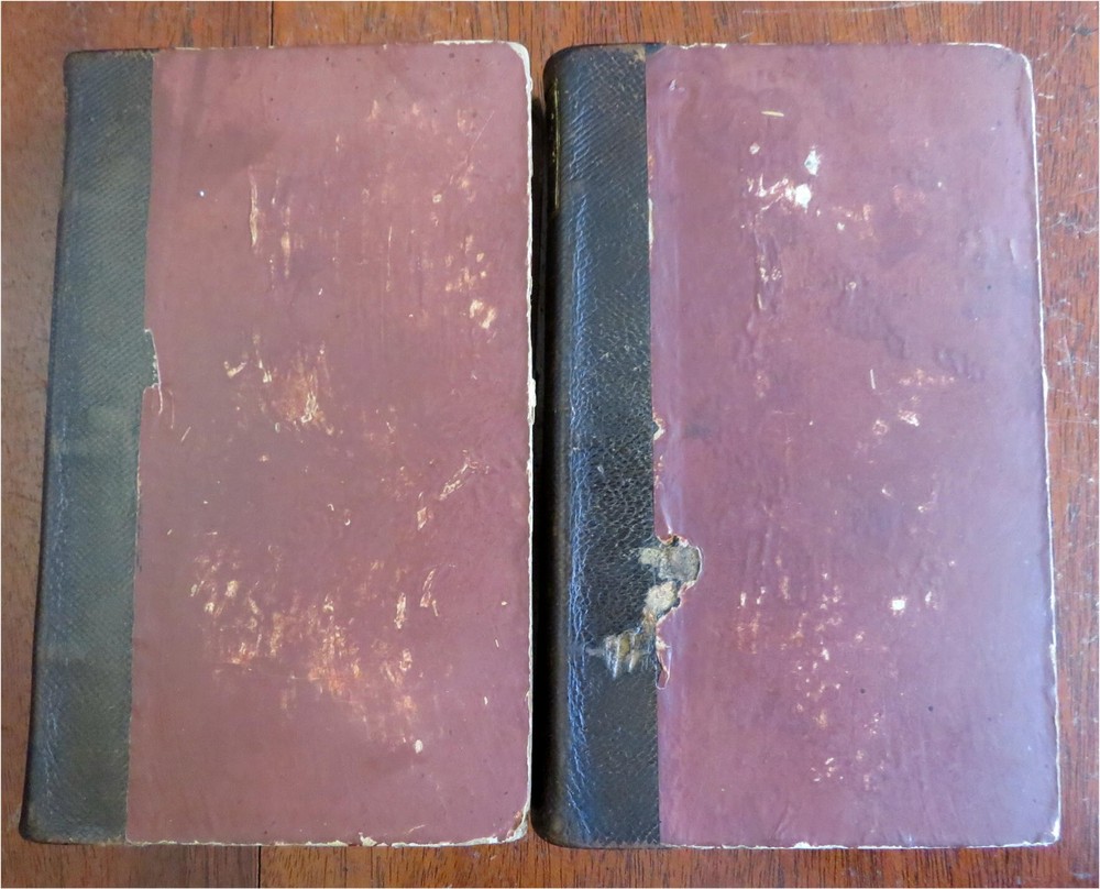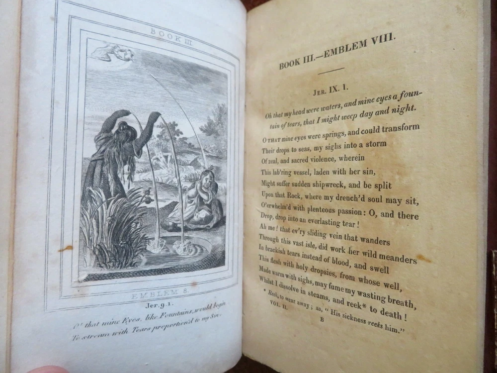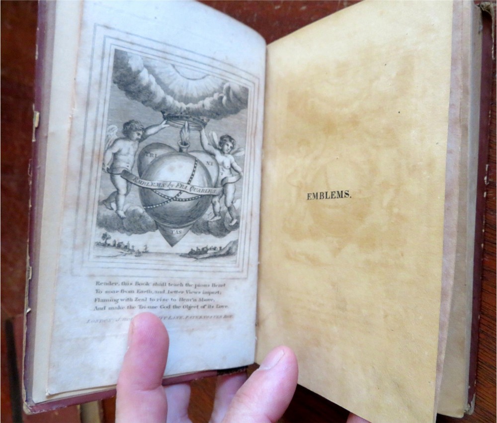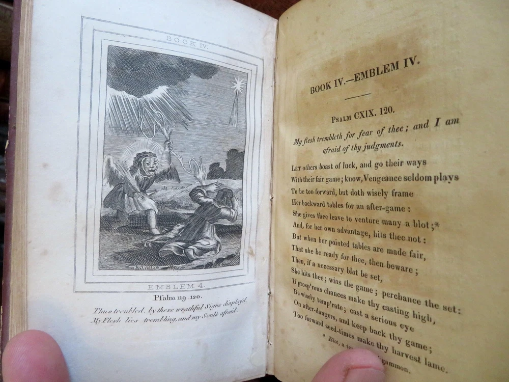 Divine & Moral Emblems 1824 Quarles illustrated 2 vol. leather set w/ 79 plates Divine & Moral Emblems 1824 Quarles illustrated 2 vol. leather set w/ 79 plates (Old Books, 19th Century Books, Leather Books, Illustrated Books, Emblems). Emblems, Divine and Moral, by Francis Quarles. Published 1824, London by J. Robins and Co. 2 volumes. 154, 155 pages. Text in English. Profusely illustrated throughout with 39 wonderful emblem plates in each volume, for a total of 78 emblems plus an engraved portrait (79 plates total).. Period 1/4 leather bindings, smooth spines, gilt title lettering, paper covered boards. Set is physically old and shows some signs of handling and time. Set is not new or in "new" condition. Bindings gently age worn but still appealing, leather rubbed but still supple, joints slightly scuffed, front cover of vol. 2 with a small scrape resulting in loss of paper and leather along the joint, set remains overall attractive as an object. All covers very strongly attached. Text block paper is gently toned, light foxing, offsetting to facing text leaves of engraved plates, final plates has a short closed edge tear (easy to miss or overlook), internally still well preserved, tight, sound. Still attractive on the shelf. Set displays a pleasing and unique age patina and is in nice antiquarian condition. A charming and uncommon set. Please review photos for more detail and our best attempt to convey how this set survives. Books Measures c. 6 1/2" H x 4" W. [B4605].