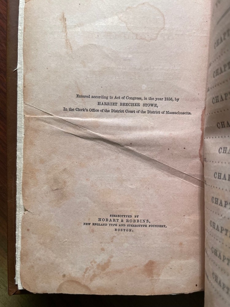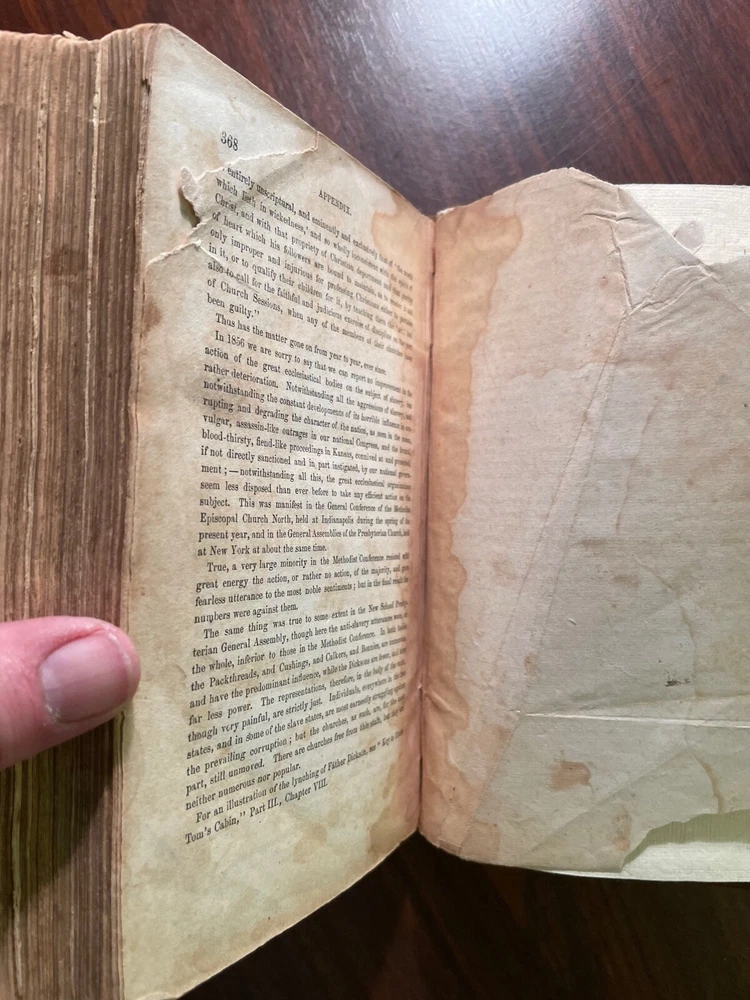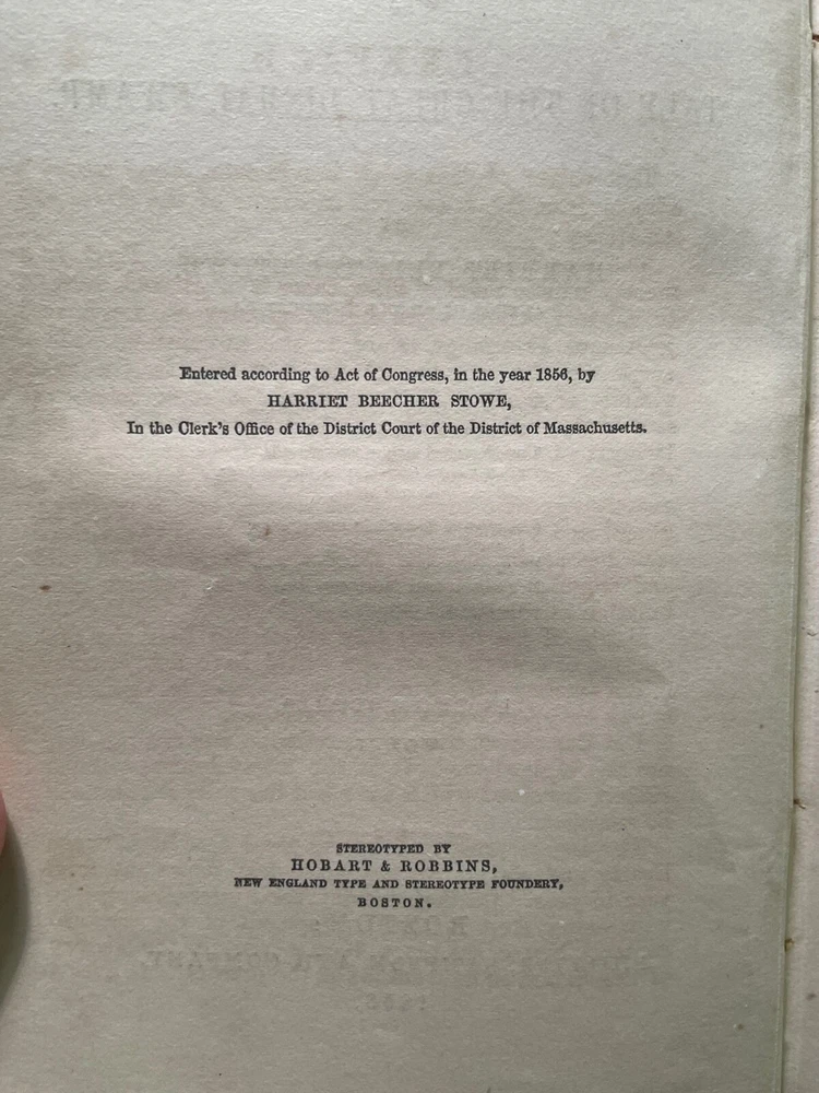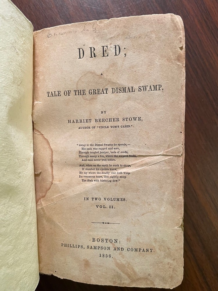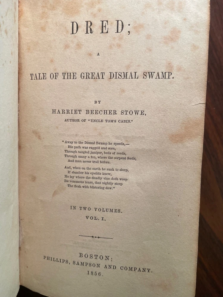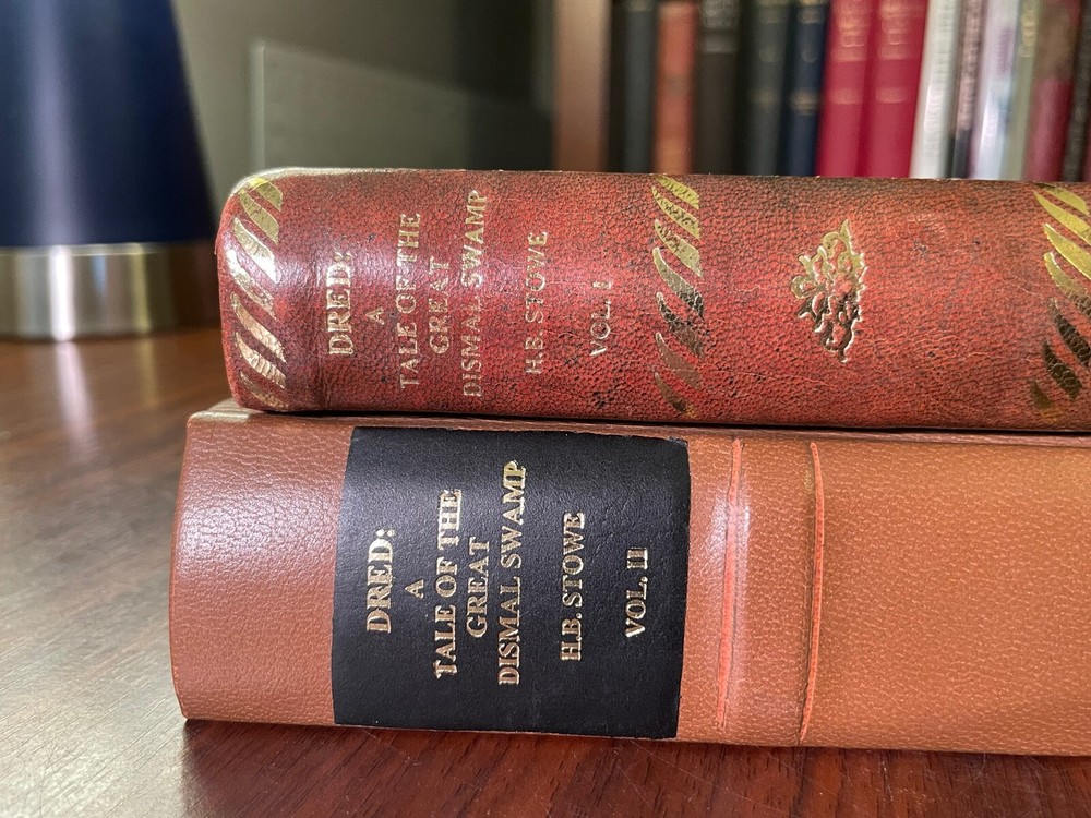 Dred: A Tale of The Great Dismal Swamp by Harriet Beecher Stowe. Published by Phillips, Sampson and Co, Boston. 1856. Both first editions. 329 pgs & 370 pgs. Book Dimensions: 6"x8" inches. Volume one has been rebound with original blind stamped cloth covers and new leather spine with gold gilt title. Volume two has been rebound in full brown leather with black leather spine labels with gold gilt. New end papers in both volumes. Pages are heavily foxed and damp stained in both volumes. Last page of volume two has some paper loss in top corner which does not affect text. Both volumes have cracking to interior textblocks but are still holding and relatively tight to binding. A scarce rebound pair of Stowes second book published after Uncle Tom's Cabin. Scarce. 1st editions. Abolitionist Fiction. American Literature.